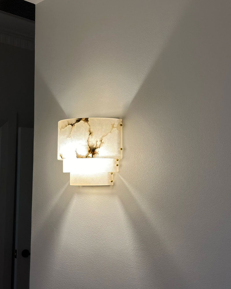 - Hand-carved, three-tier alabaster with natural veining and soft glow.
