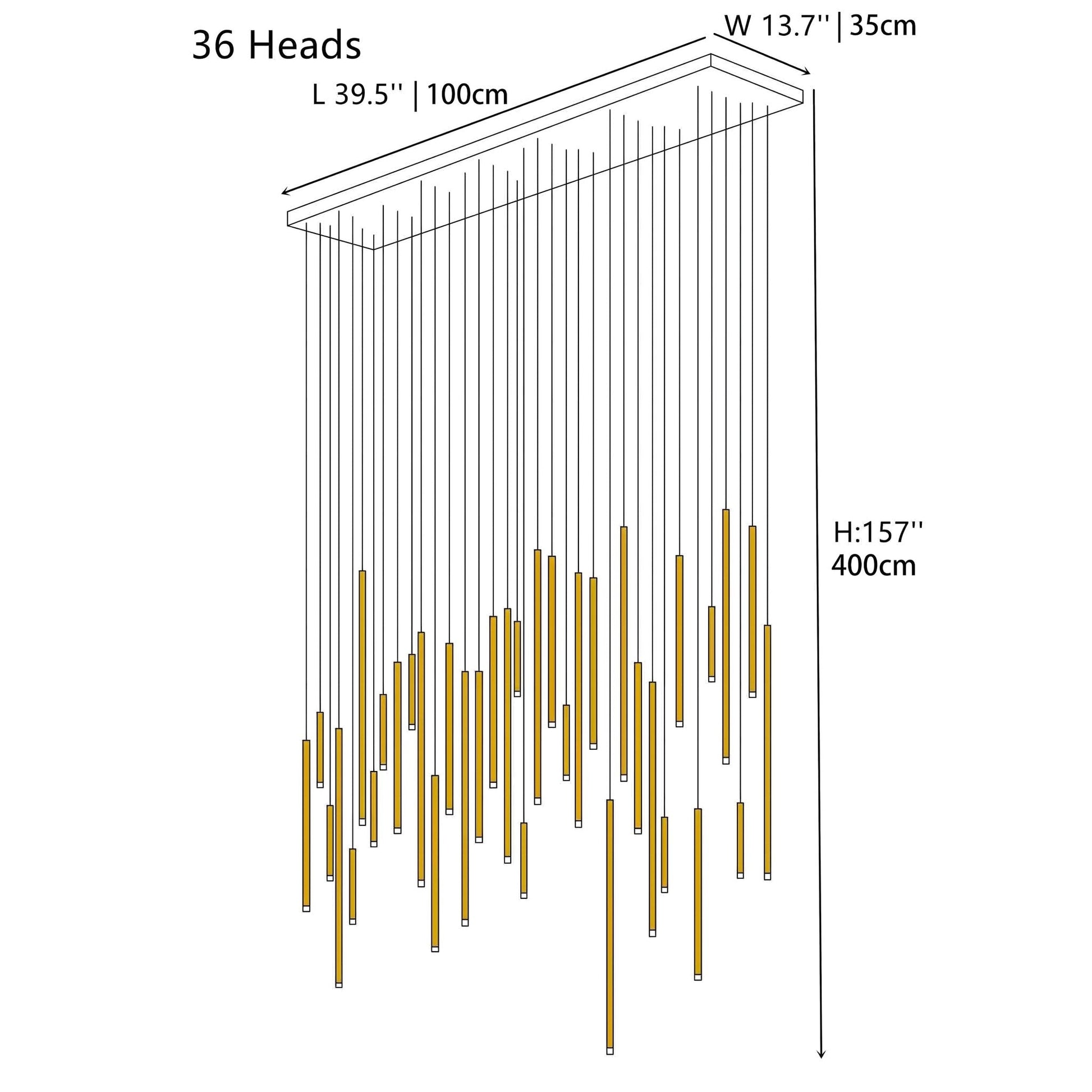 - 36 Head: L 39.5'' / 1m, W 13.7'' / 35cm, H:157'' / 4m
