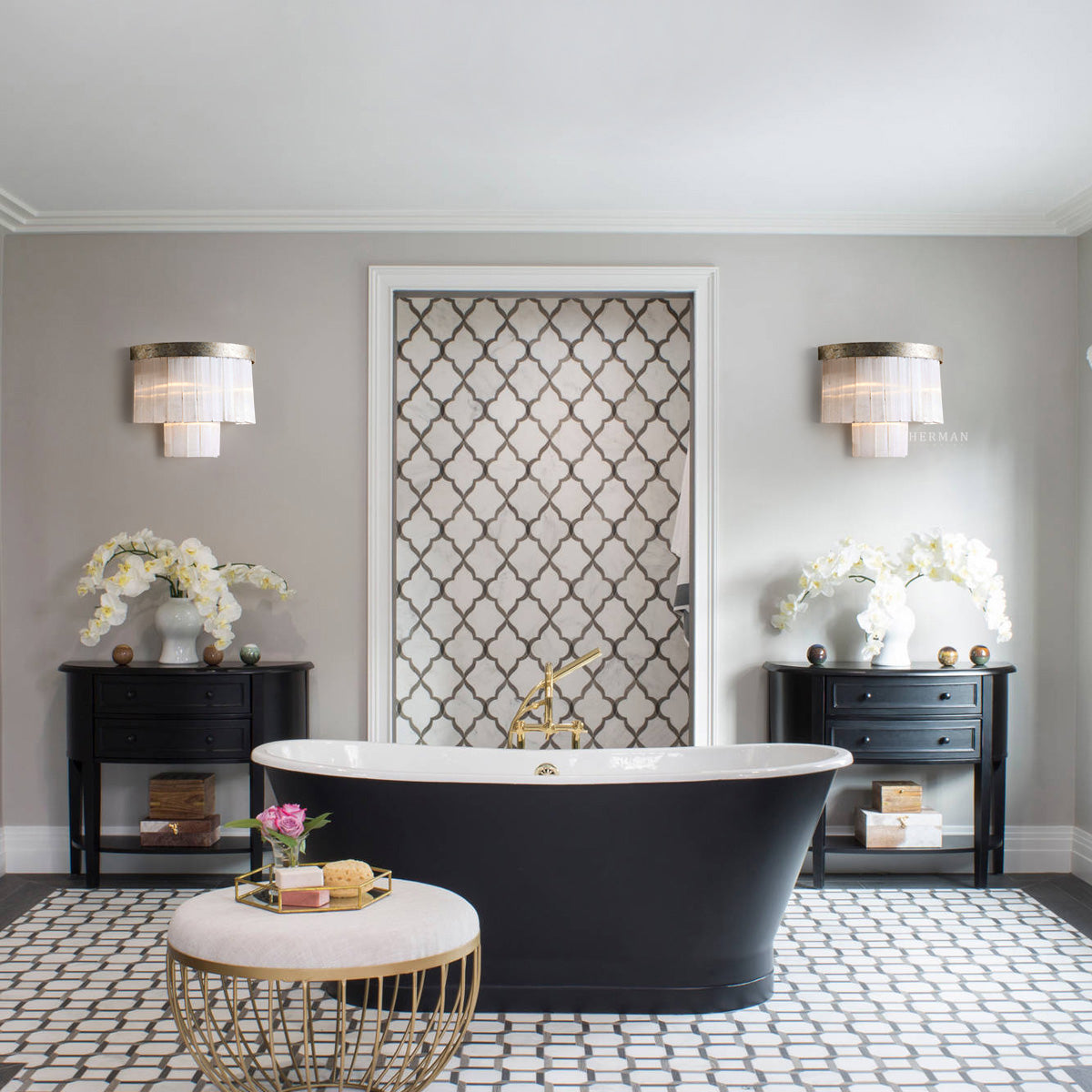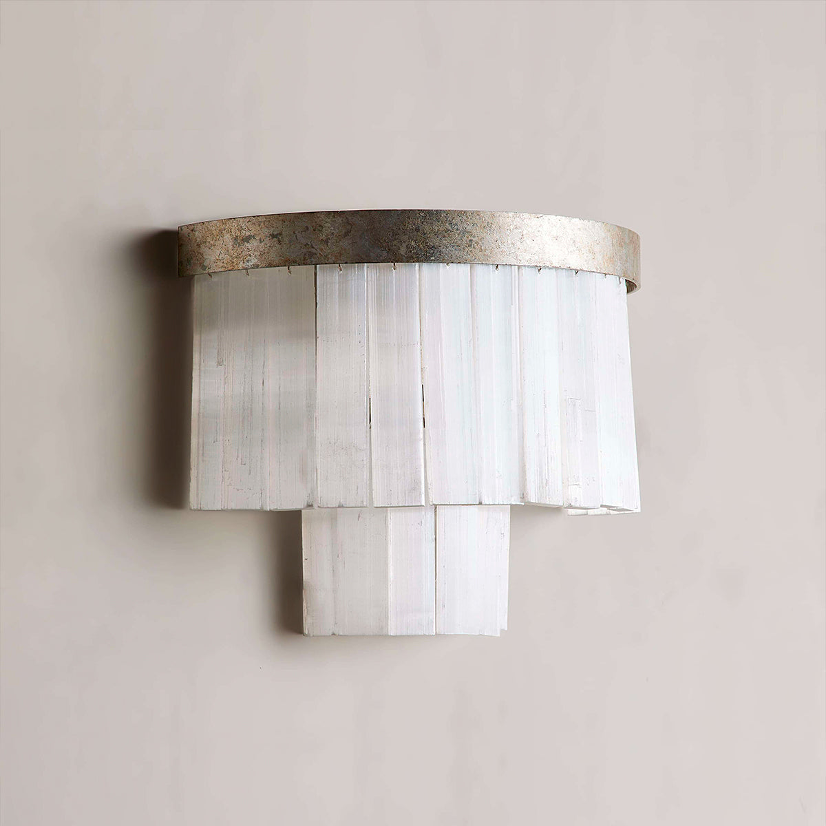 Our Adam Lighting Collection is adorned with natural selenite crystals that hang underneath an iron frame, reflecting the light with elegance. Our artisan hand brushed antique silver finish creates a glamorous aesthetic.