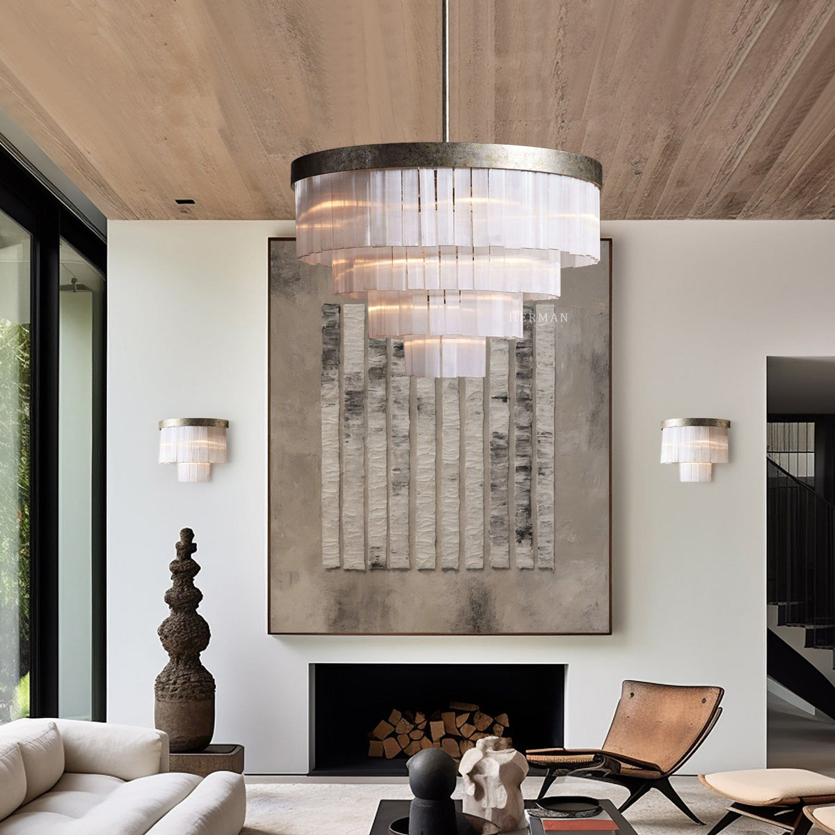 Our Adam Lighting Collection is adorned with natural selenite crystals that hang underneath an iron frame, reflecting the light with elegance. Our artisan hand brushed antique silver finish creates a glamorous aesthetic.