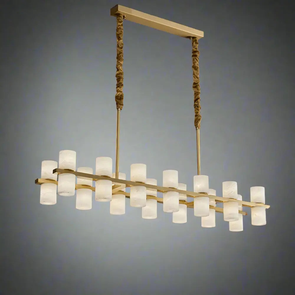 Solid alabaster diffusers on twin brass rings, engineered for soft 360° glow and modern symmetry. UL-listed and dimmable, ships in 3–5 weeks with custom drop options available