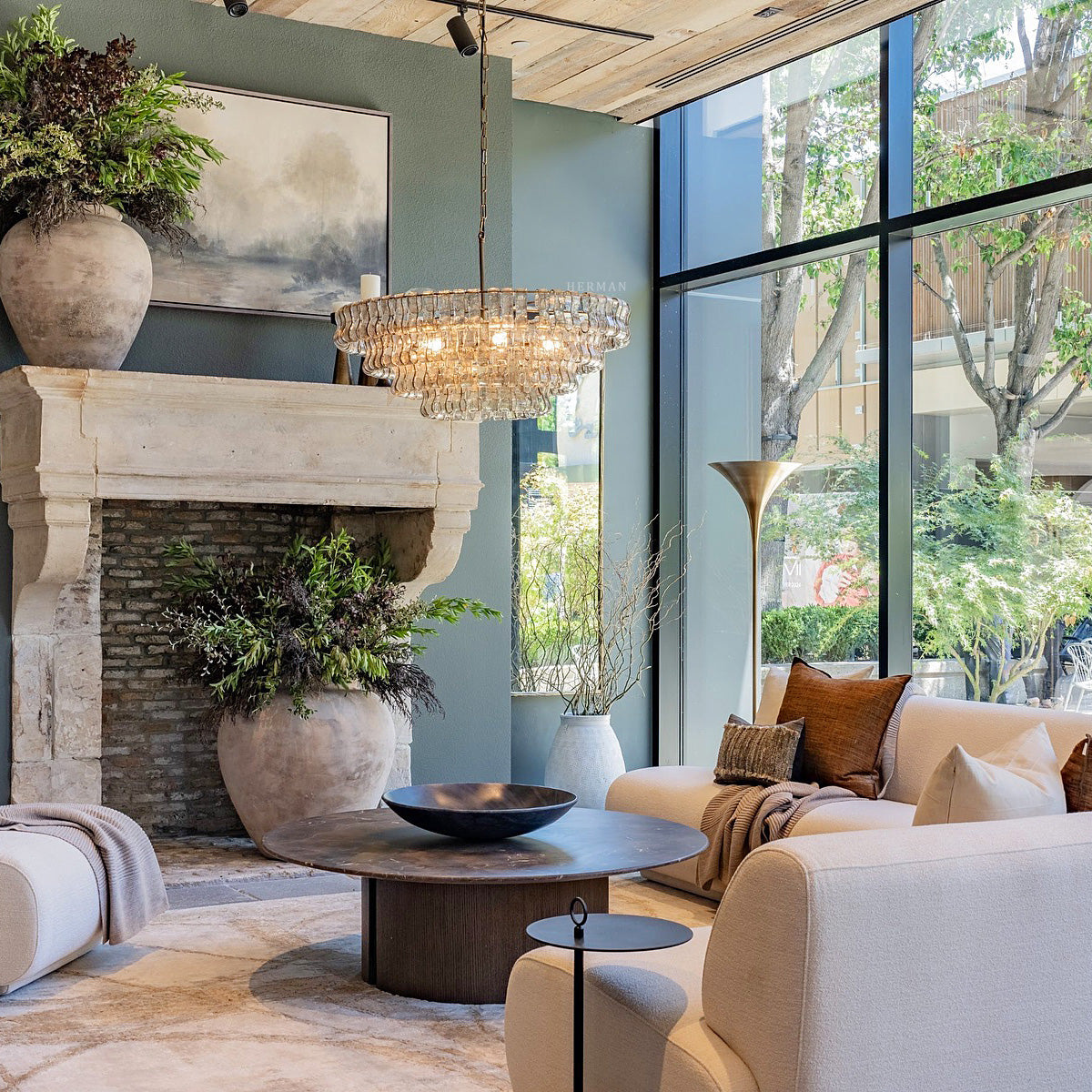 Inspired by the famous Italian decorative glass, the Amor chandelier artfully diffuses light through curved textured glass pieces. It features an electroplated brass finish to elegantly illuminate any room.