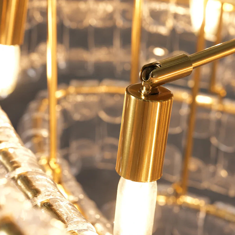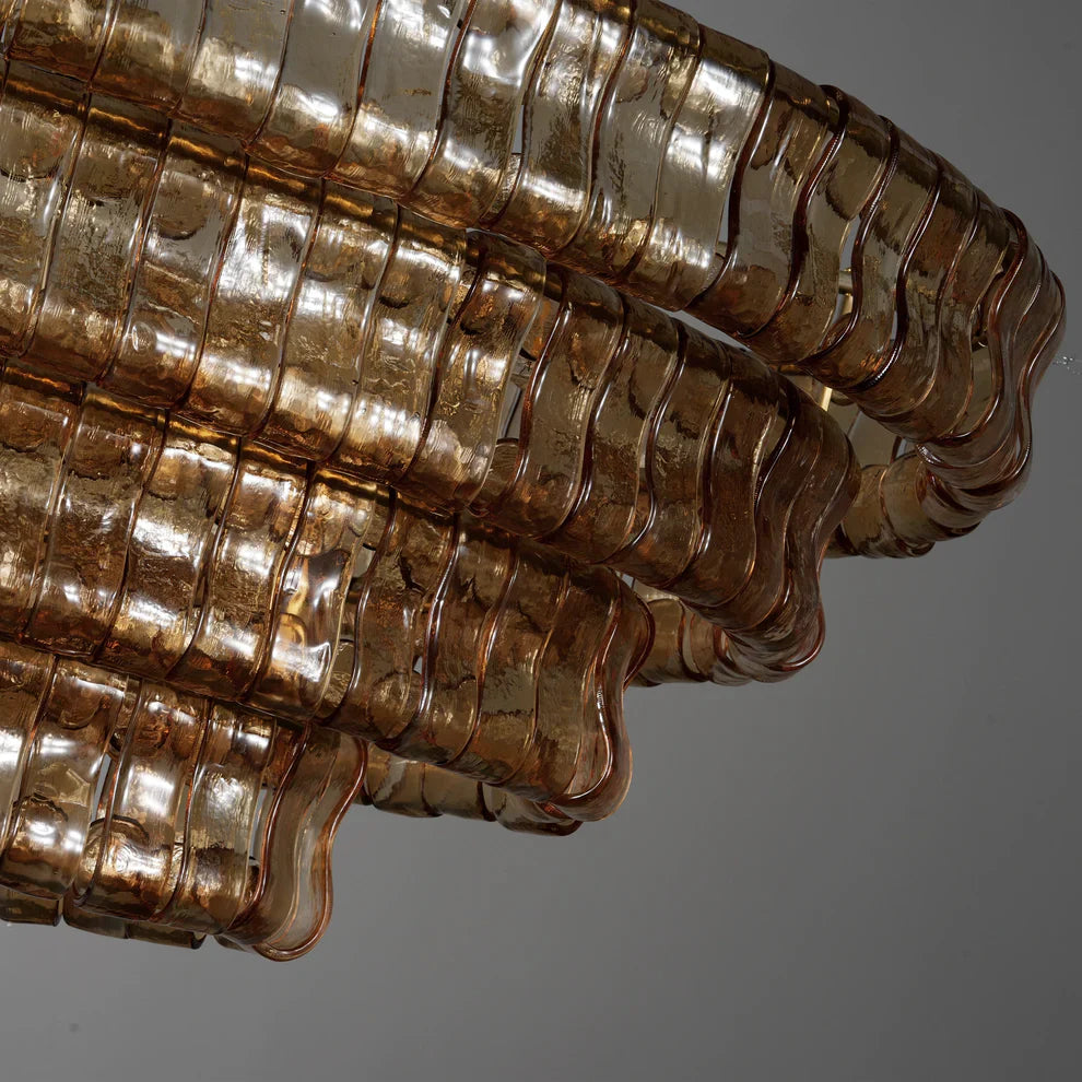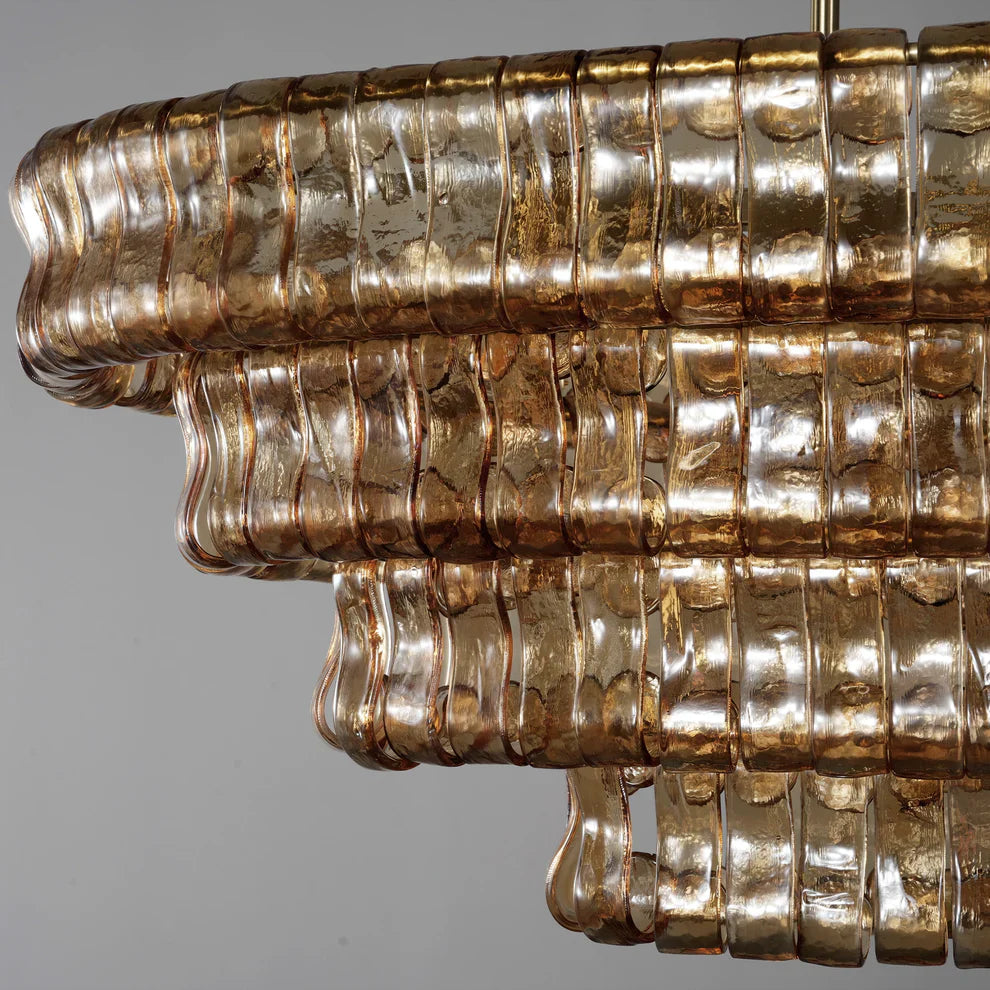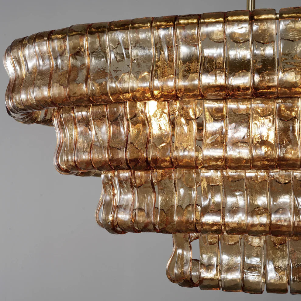 Inspired by the famous Italian decorative glass, the Amor chandelier artfully diffuses light through curved textured glass pieces. It features an electroplated brass finish to elegantly illuminate any room.