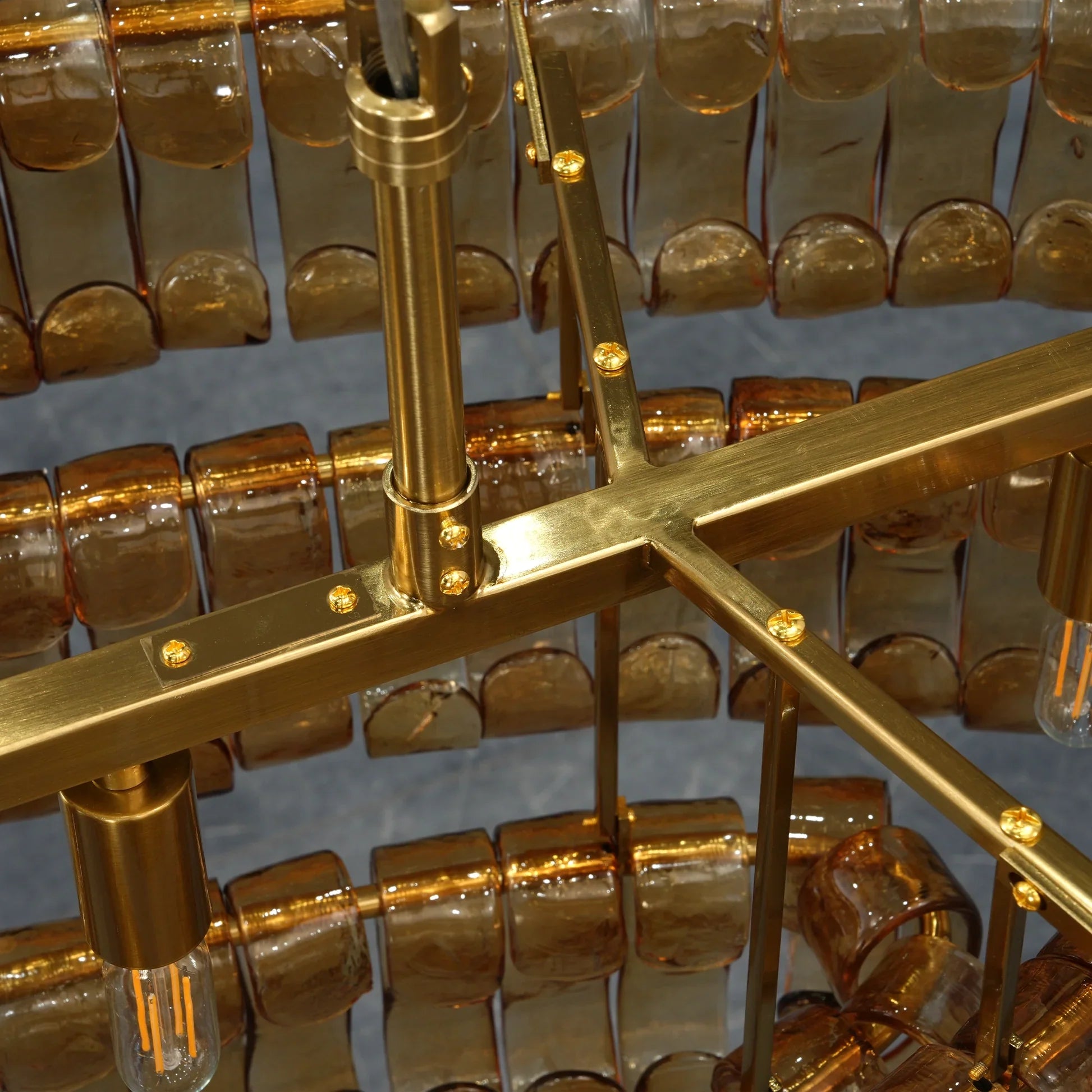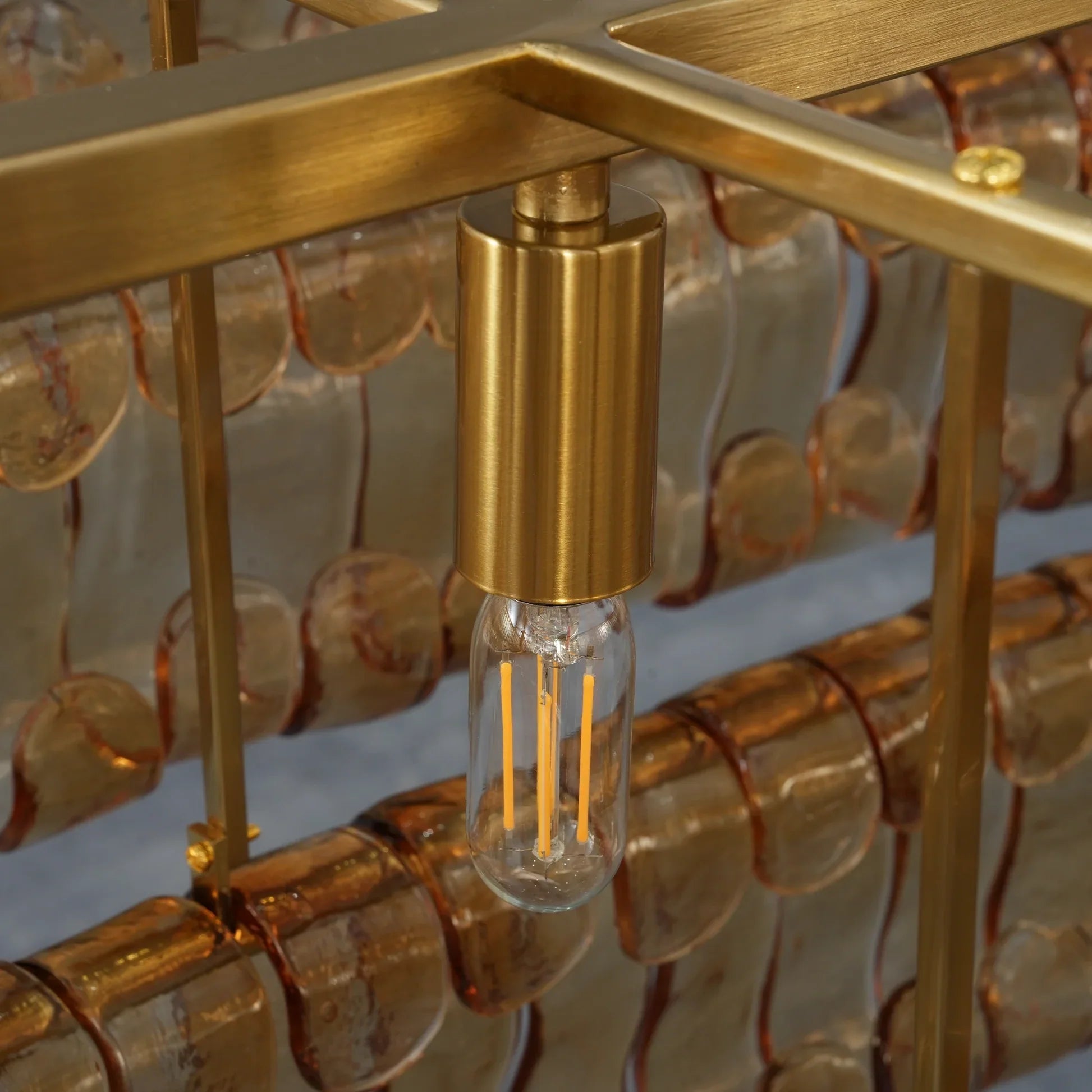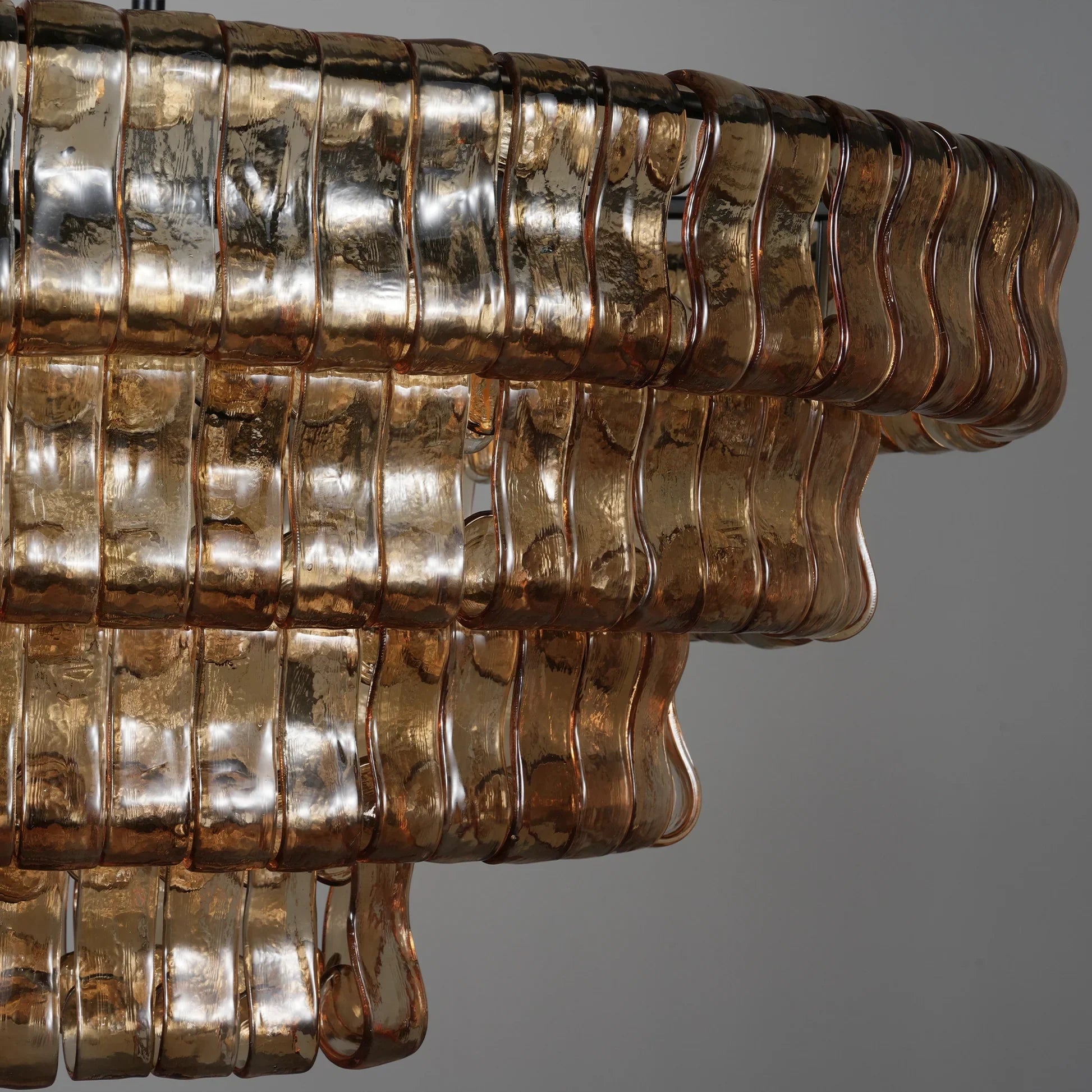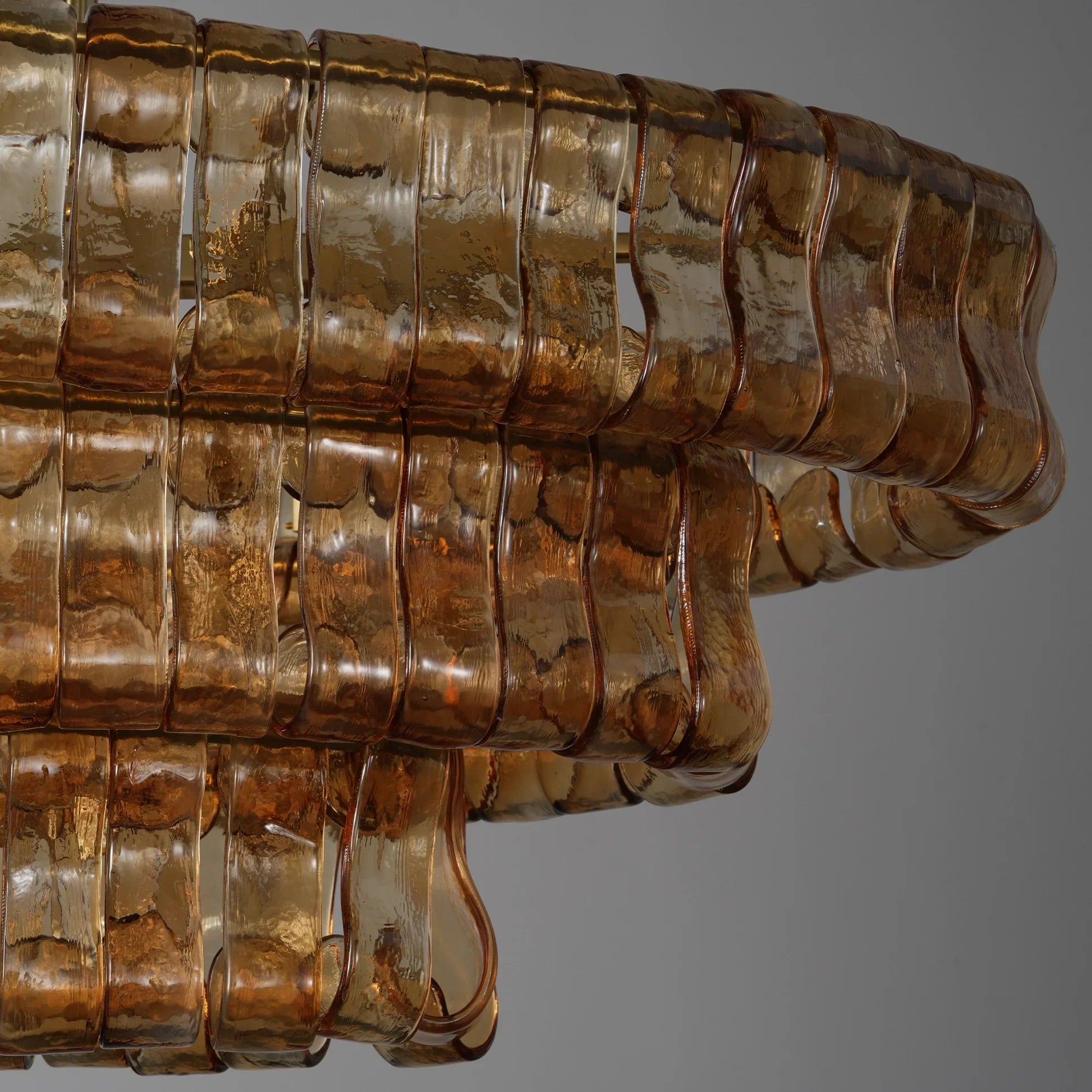 Inspired by the famous Italian decorative glass, the Amor chandelier artfully diffuses light through curved textured glass pieces. It features an electroplated brass finish to elegantly illuminate any room.