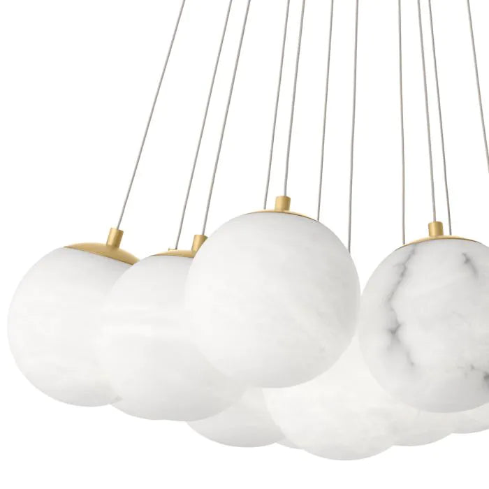 Illuminating, like the moon on a clear night, the Sphinx Chandelier captivates with its elegant composition of smooth alabaster and antique brass finish.
