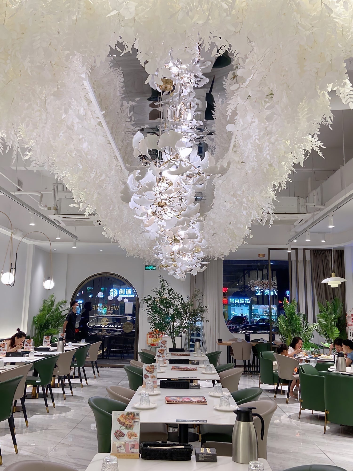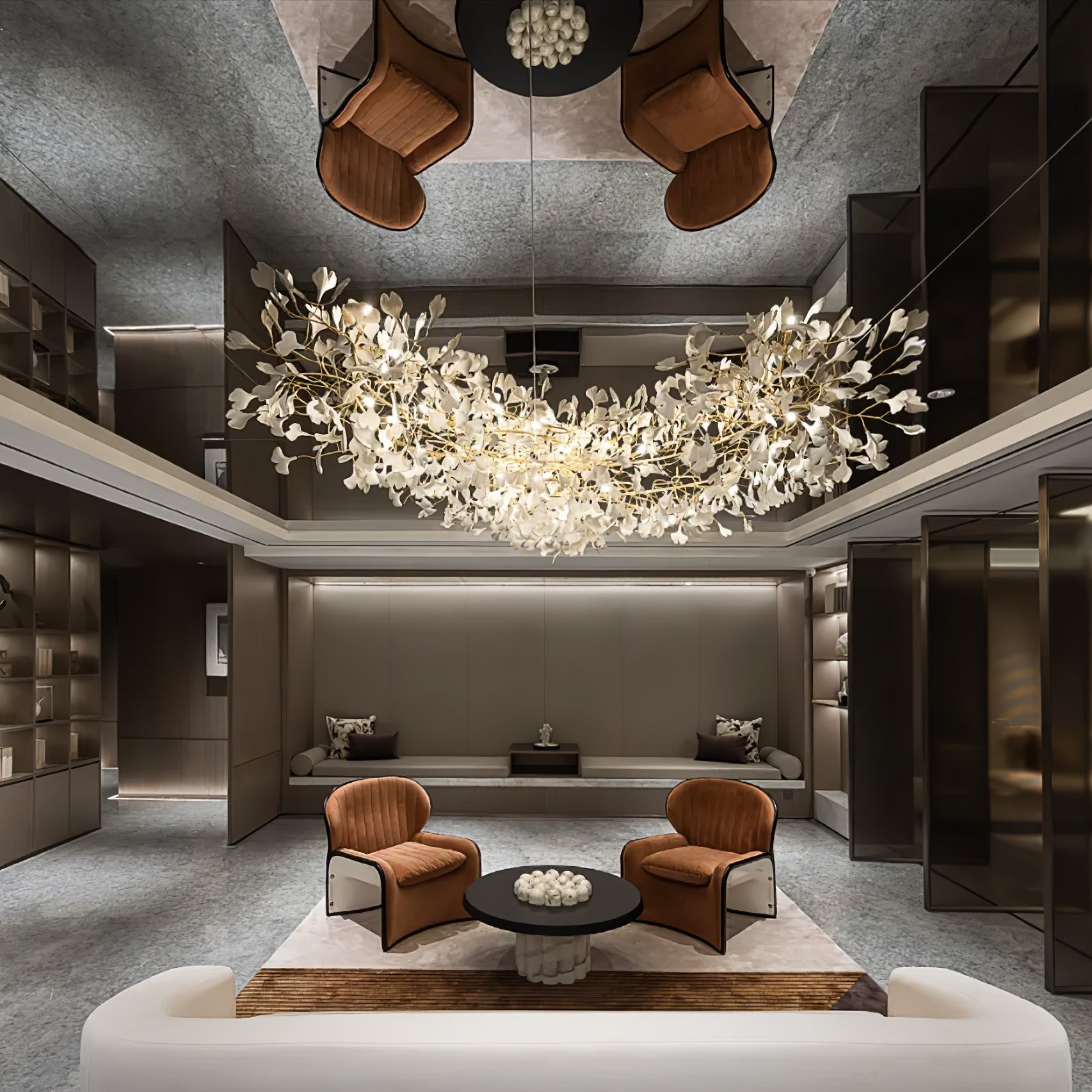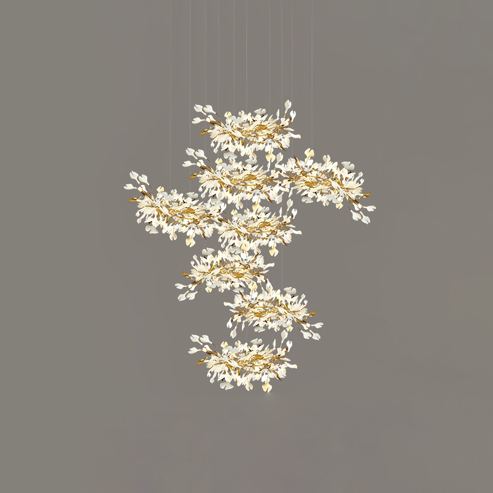Featuring a luxurious overall design and advanced manufacturing technology, the Customize Gingko Chandelier showcases its opulence through exquisite ceramic petals adorning the metal lamp body. Immerse yourself in the perfect blend of lighting and nature with this bespoke installation, handcrafted with porcelain leaves. Experience the harmonious interplay of light and ceramic, creating a welcoming ambiance that promotes well-being. Beyond its functional purpose, this light sculpture defines its own striking appearance, eliciting awe as a mesmerizing piece of artwork. Like a living plant, it exudes a natural, dynamic energy that brings tranquility and vitality to any space. Working in tandem with the architectural and design vision, this installation is a symbol of harmony between man and nature.