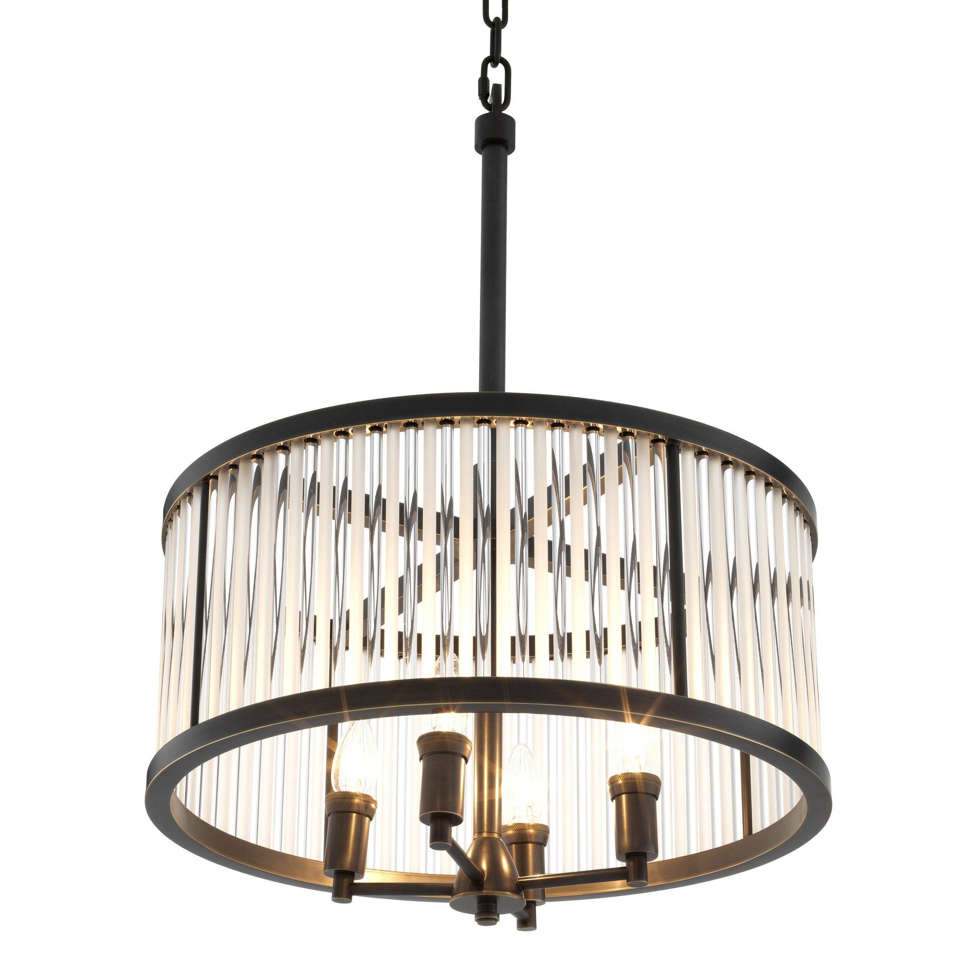 Invite the gorgeous aesthetic of the Darcy Chandelier into your home. By pairing a vintage-inspired bronze drum shade with hand sculpted glass rods, this refined pendant lamp exudes timeless appeal.