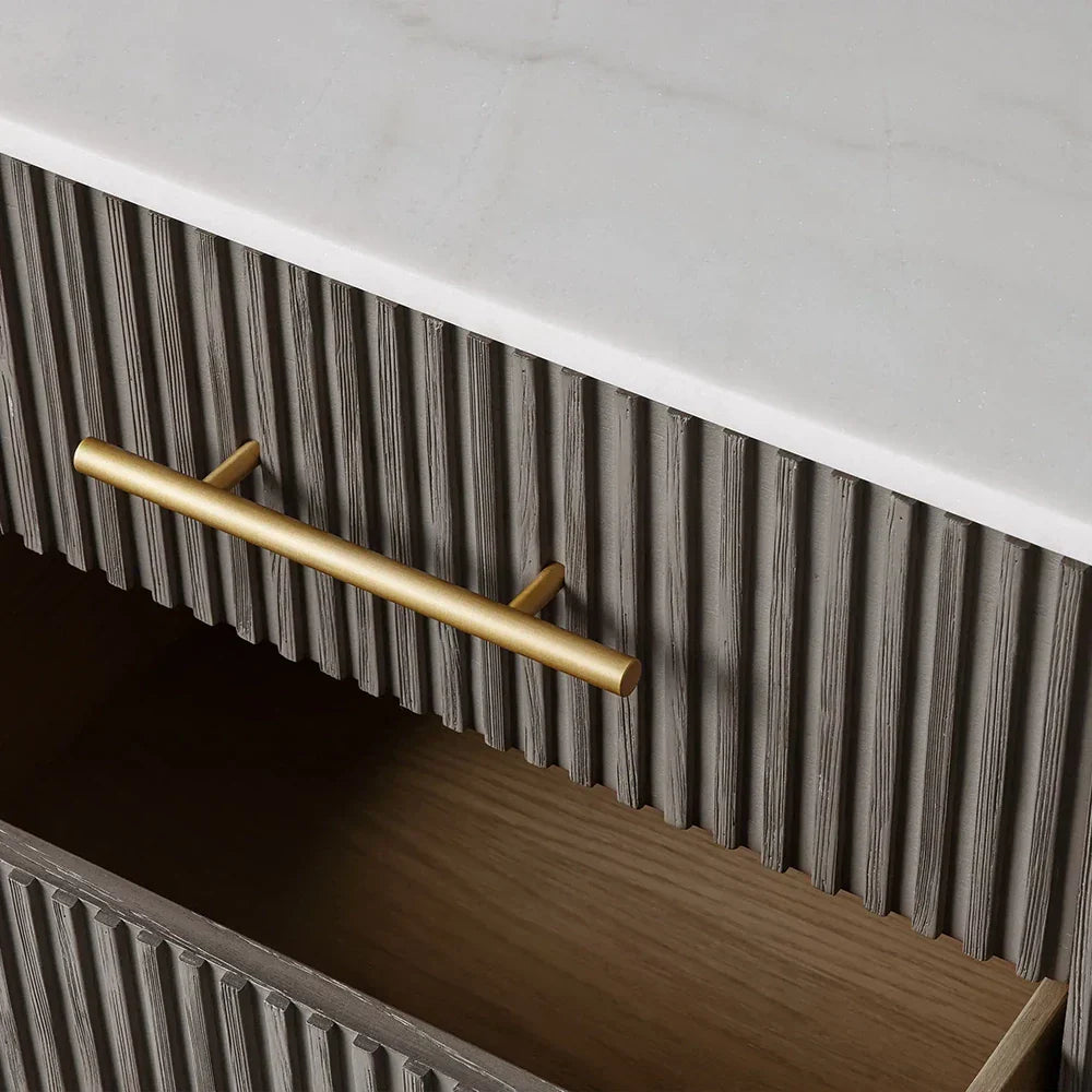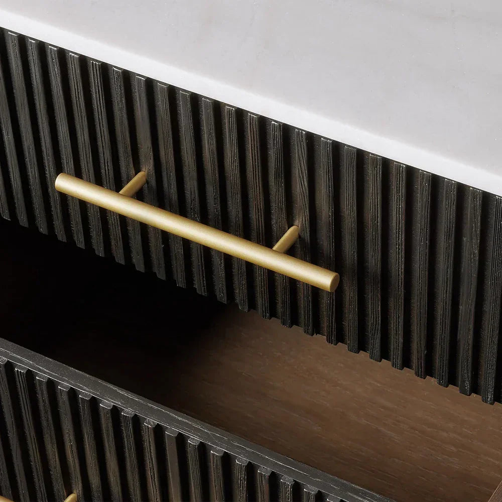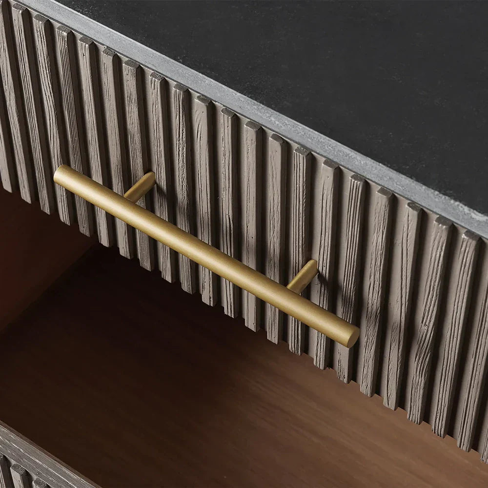 - Zinc-alloy hardware is completed with a warm brass finish to complement the natural tones of the wood and stone.