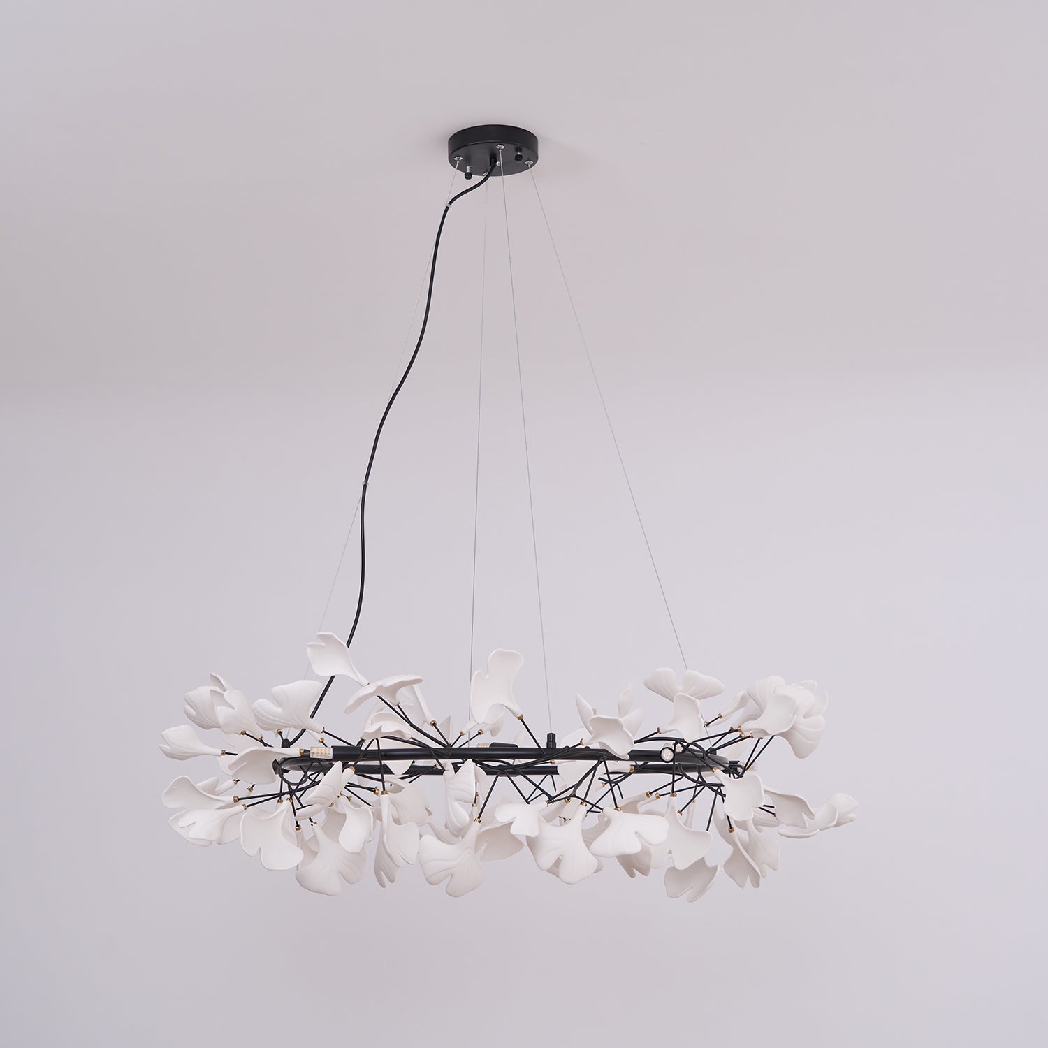 This ceramic ginkgo tree petal chandelier shows its luxurious style in overall design, material, and manufacturing technology. The metal lamp body is covered with exquisite ceramic petals, which reflects the perfect combination of lighting design and natural plants.