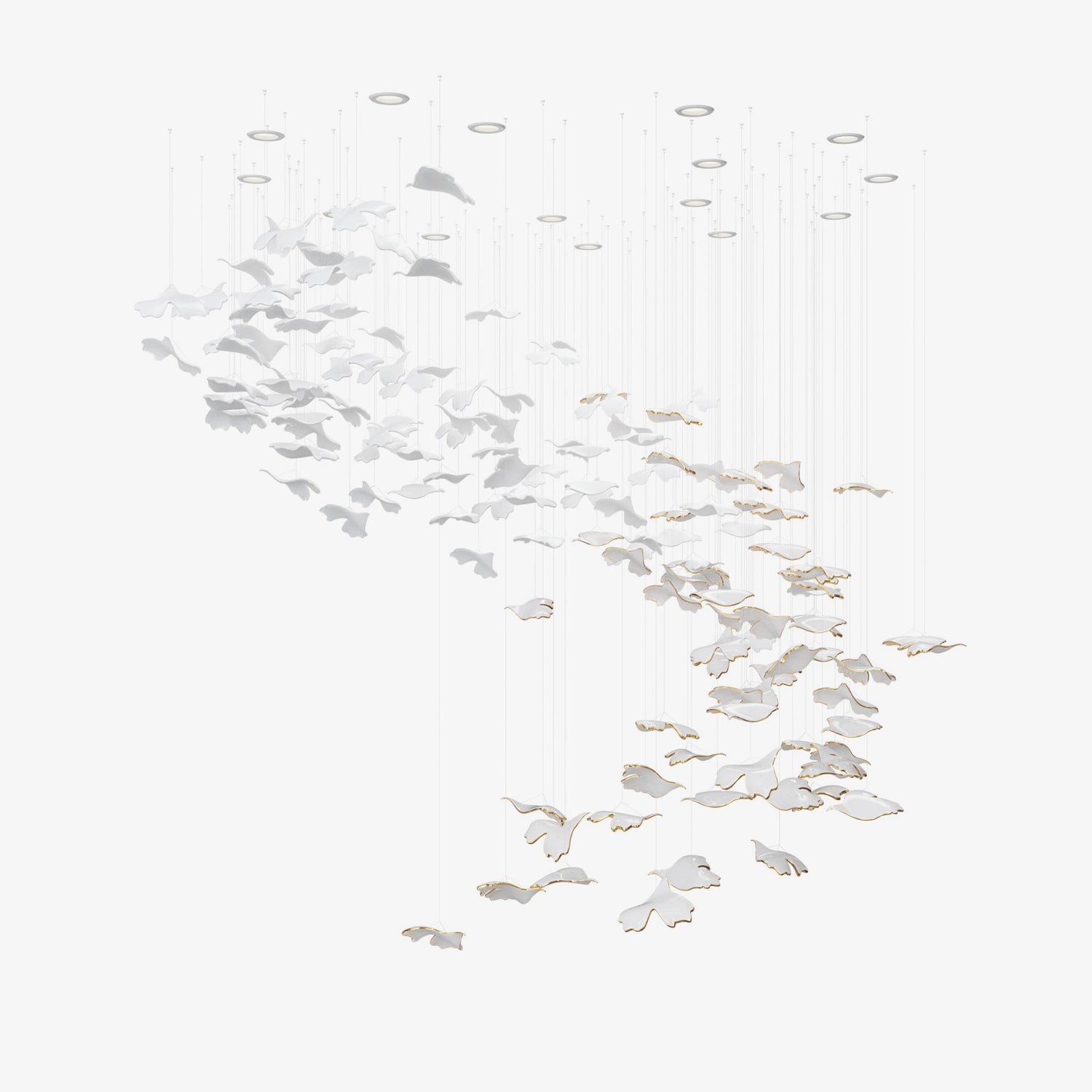 Inspired by the ancient and revered Ginkgo tree, the Ginkgo Aura Collection by Vakkerlight captures the beauty of nature in a luxurious design. Featuring handblown crystal opal leaves with gilded edges, each piece showcases the iconic fan-shaped foliage of the Ginkgo, adding a touch of elegance to any space. The sandblasted opal and gold finishes create a luminous effect, allowing the lush leaves to radiate a soft glow. The versatile design lets you arrange the leaves in various formations, making it an ideal centerpiece that brings a natural yet sophisticated charm to your interior.Indulge in the luxurious and exclusive Breezeleaf Chandelier. Inspired by the organic artistry of floating leaves, this handblown crystal fixture boasts green and golden hues to elevate any space. Embrace the natural world in your home with customizable formations.
