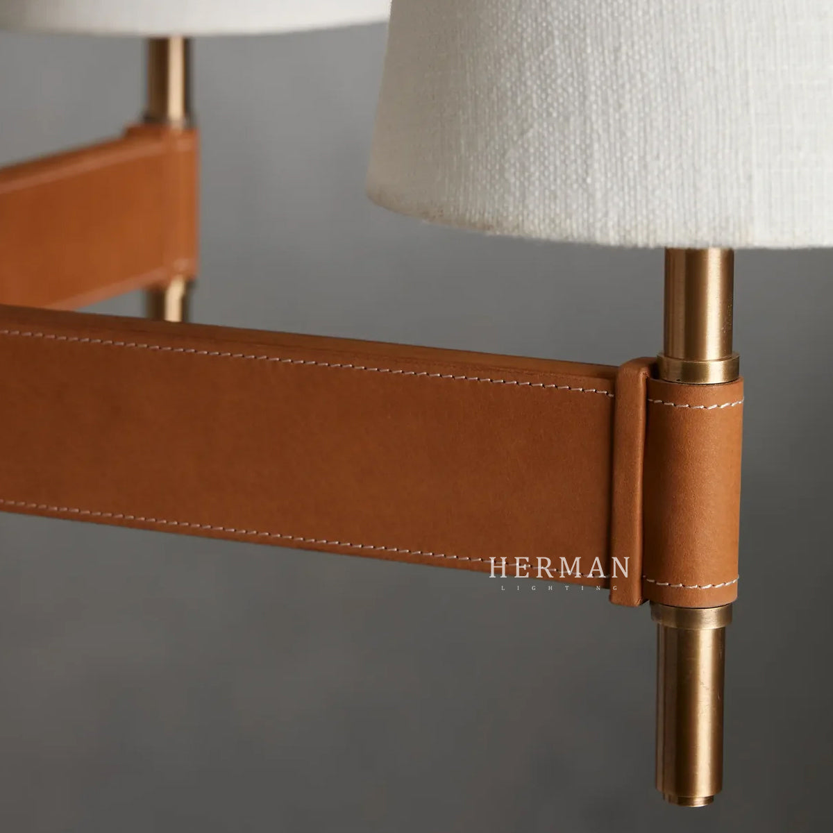 Iconic midcentury modern design and a juxtaposition of mixed materials inspire our Hastings Lighting Collection. Bases crafted from brass with an antiqued finish are complemented by tan leather stitched details and white linen shades to bring thoughtful elegance to any space.