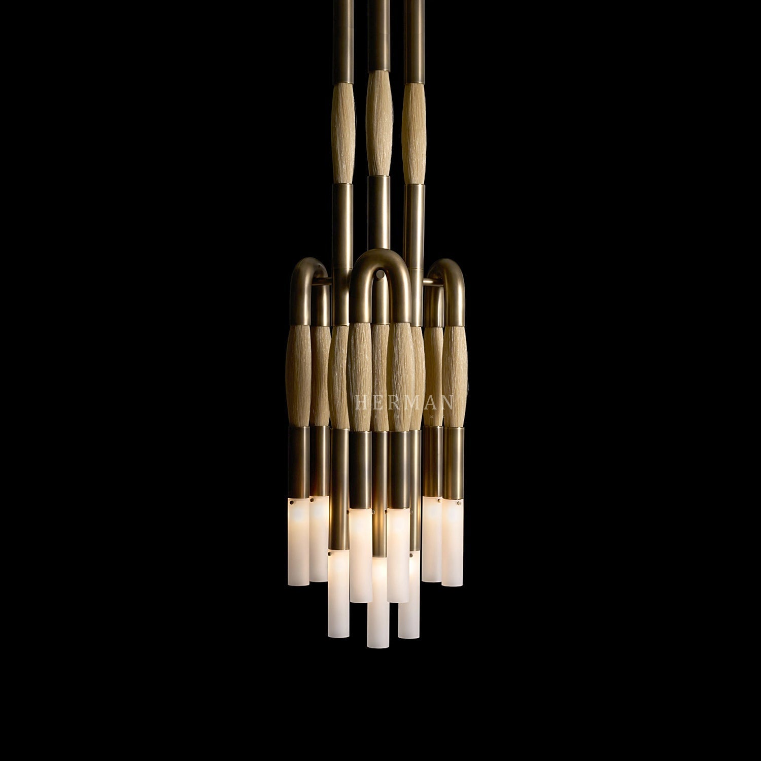 This Heritage Horsehair 9-Light Pendant Lamp combines horsehair, brass, and etched glass for a unique design and exquisite materials. The warp of the horsehair combines with the brass body of the lamp to create a visual effect that is both sturdy and elegant.