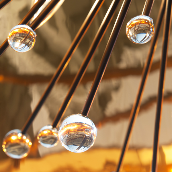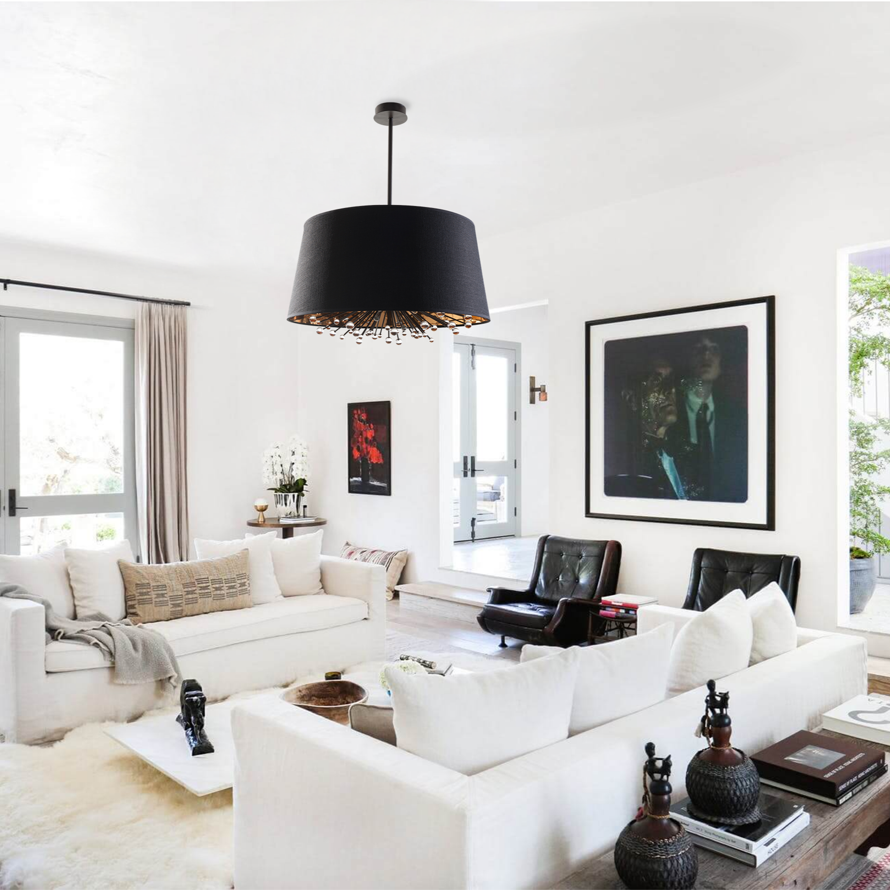 Dramatic black lighting offers this decorative and exquisite design. Isla features fascinating details: a gold foil interior, a chic black shade and decorative glass balls fastened to a sputnik style core. This black light fixture anchors the room and sharpens any decor scheme. The black and gold contrast builds a rich and unique look, while the silk drum shade makes this a contemporary modern piece.