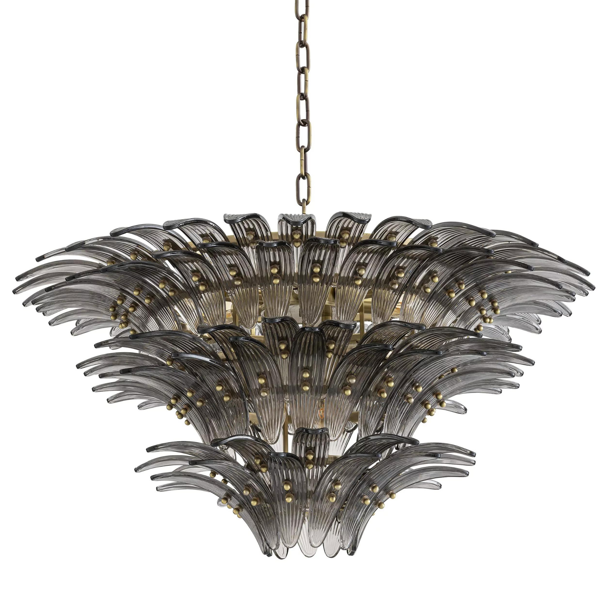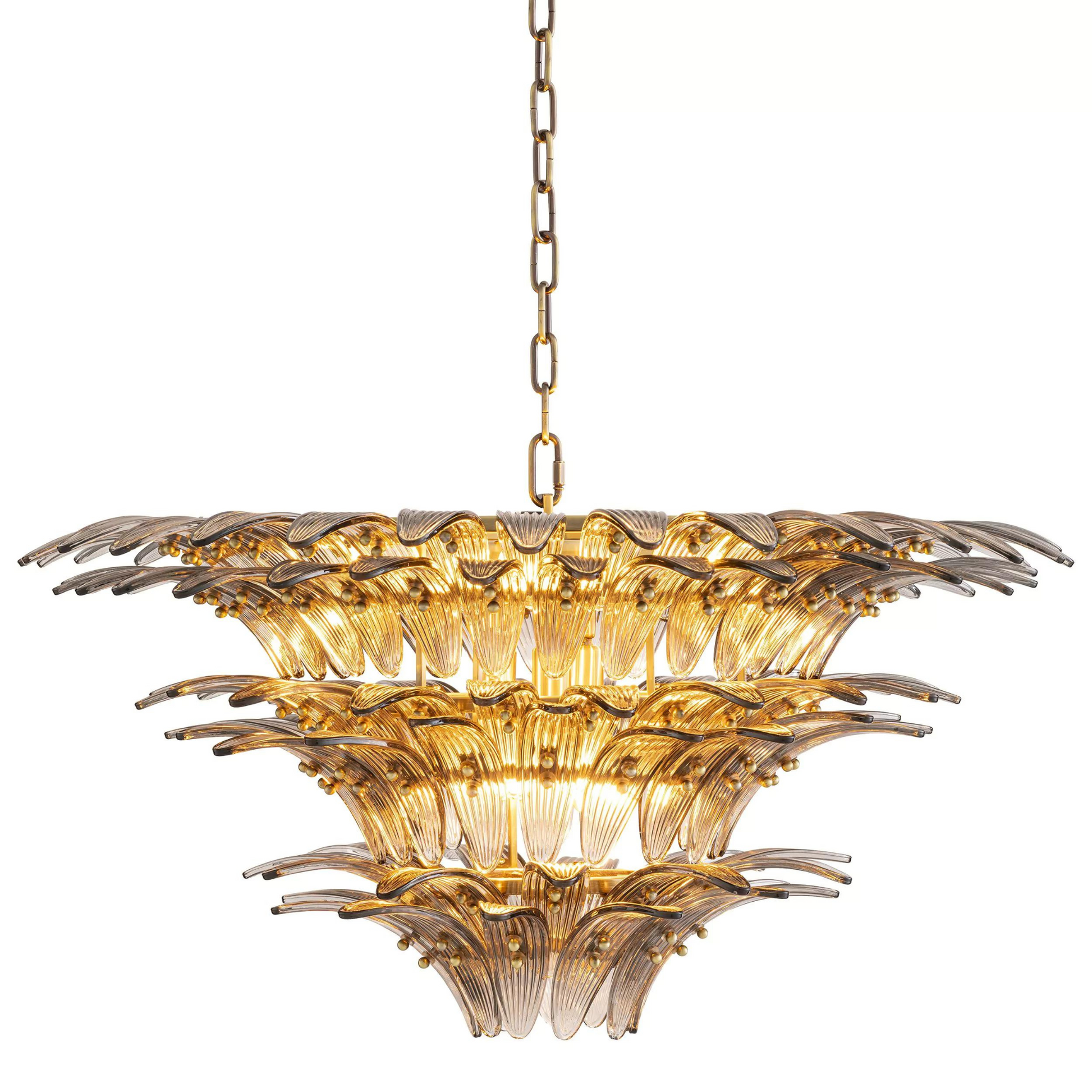 Inspired by nature, Chandelier Italo creates a display of energetic brilliance and shadows. Three tiers with overlapping decorations of ribbed smoked glass remind one of leaves and give the impression of a tropical treetop. Provided with a light brushed brass finish and suspended from a canopy, the chain is adjustable in height.