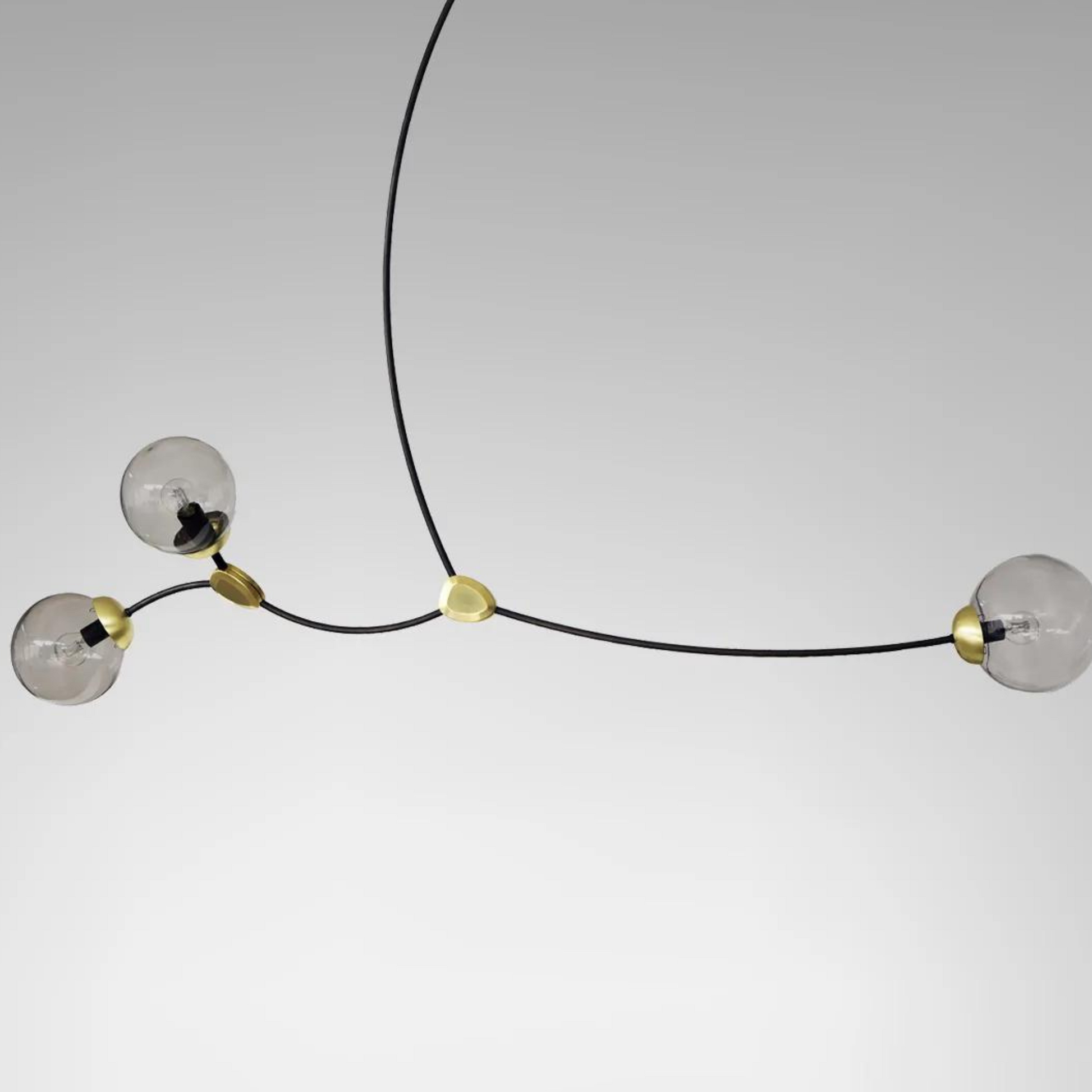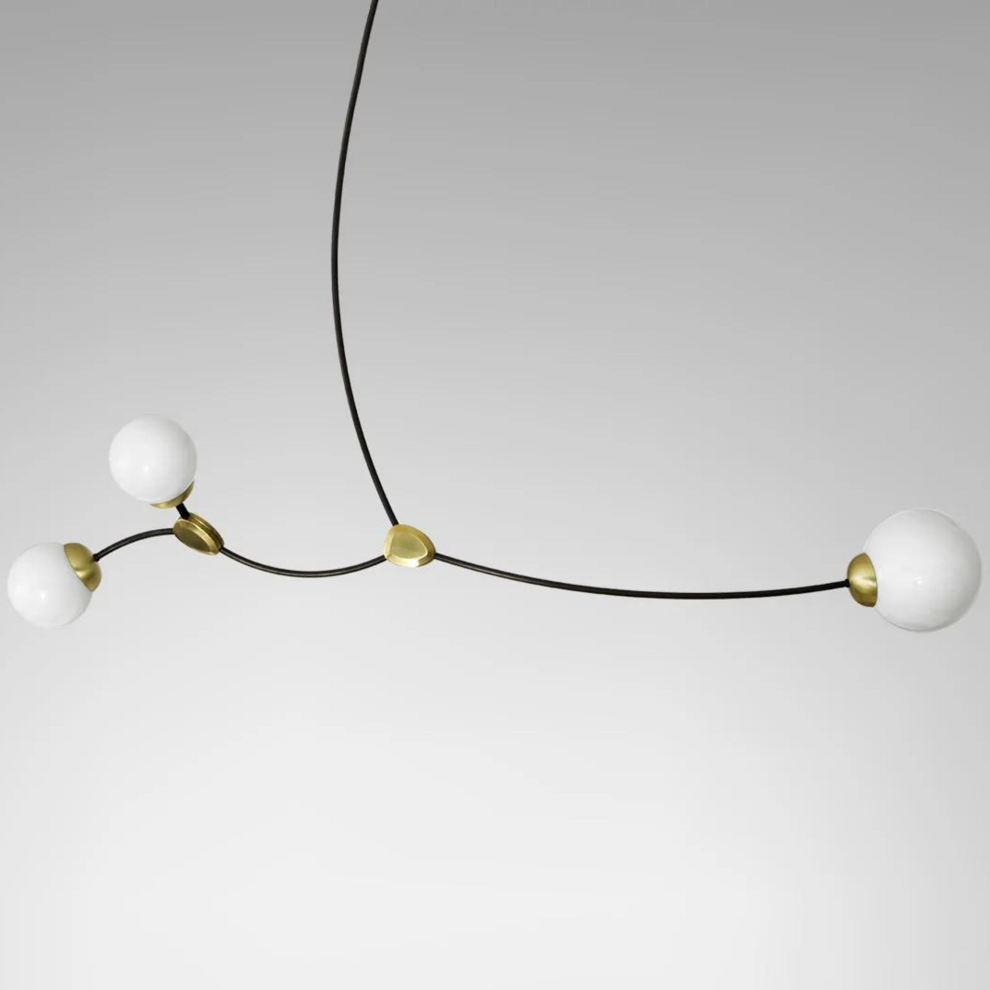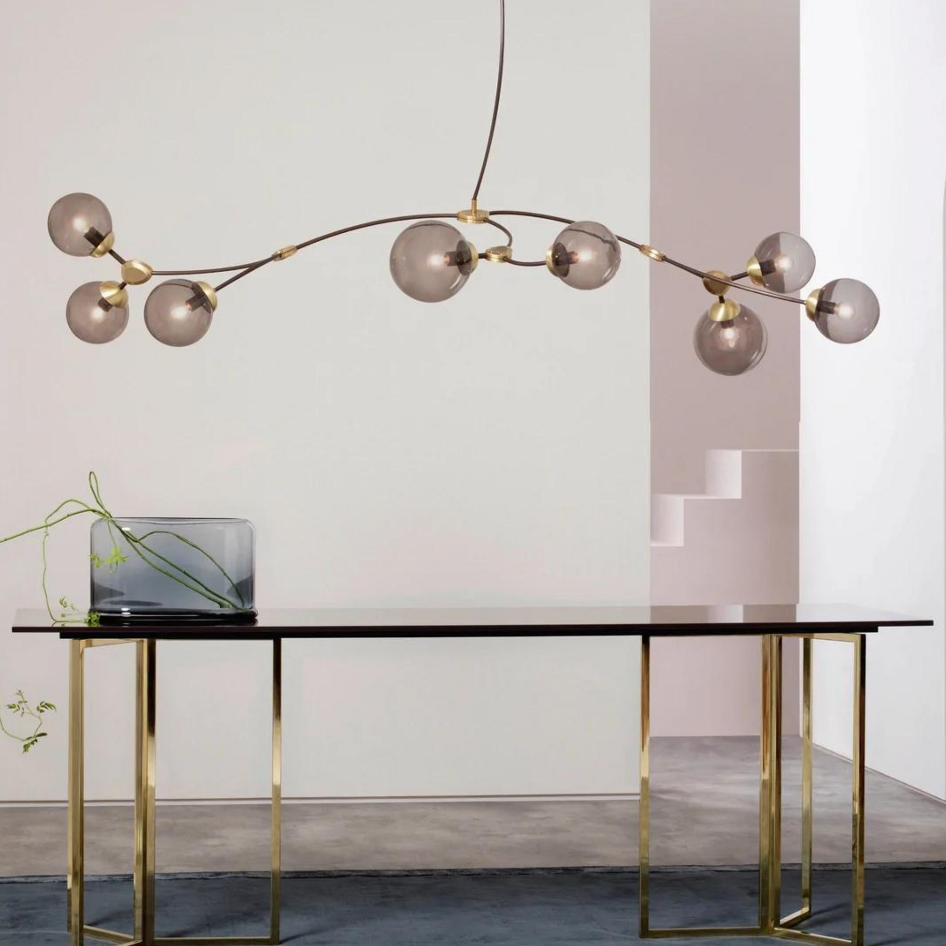 The bronzed metalwork is curved and lit with a choice of opal or smoked glass shades. These sculptural pieces give designers new opportunities for lights to be used in less static compositions.