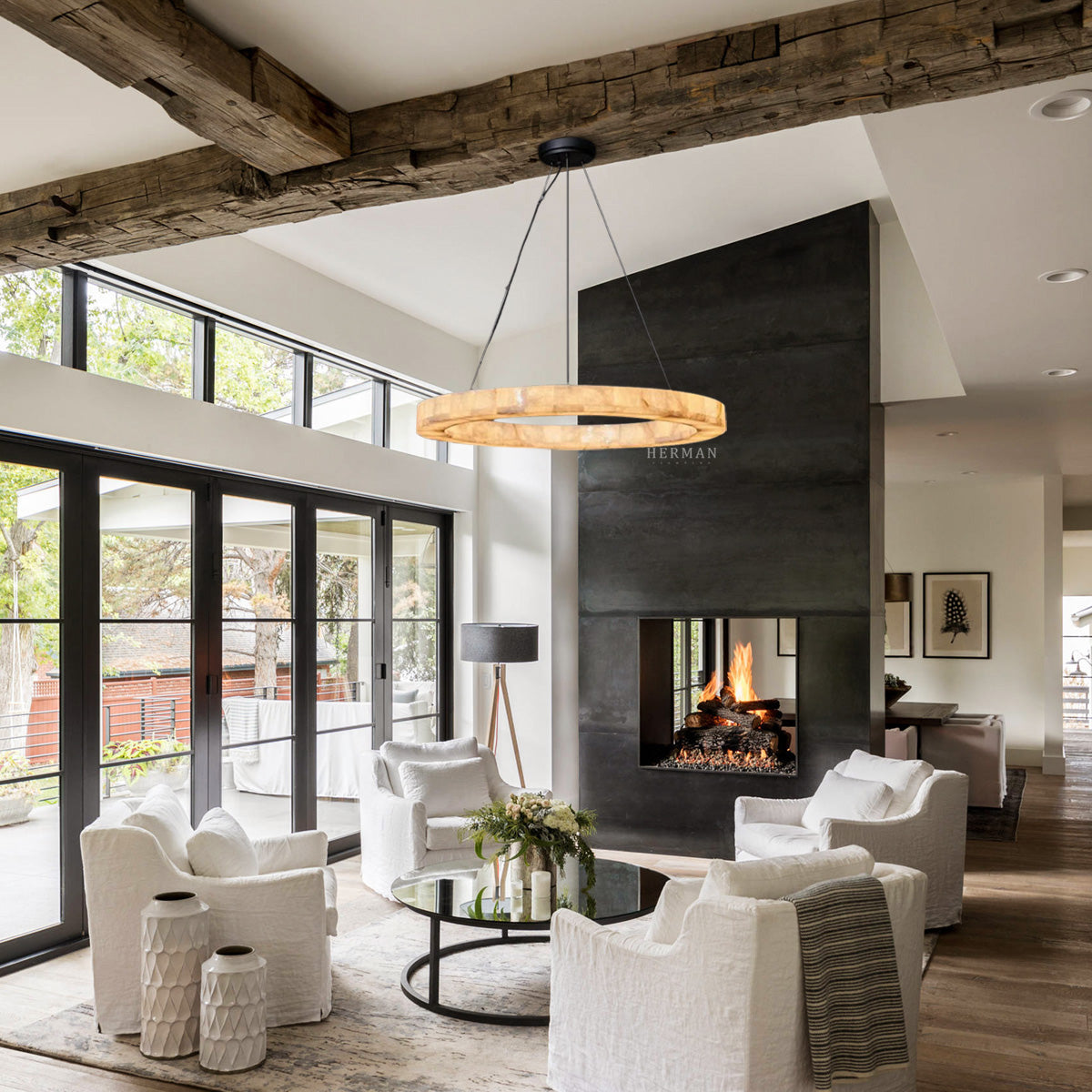 Karen Alabaster Ring Chandelier features natural alabaster stone, prized for its serene beauty and grounding presence. Renowned for evoking clarity and calm, alabaster casts a soft, ambient glow with warm, earthy undertones. Its minimalist, frameless ring design highlights the organic elegance of one of nature’s most timeless materials.