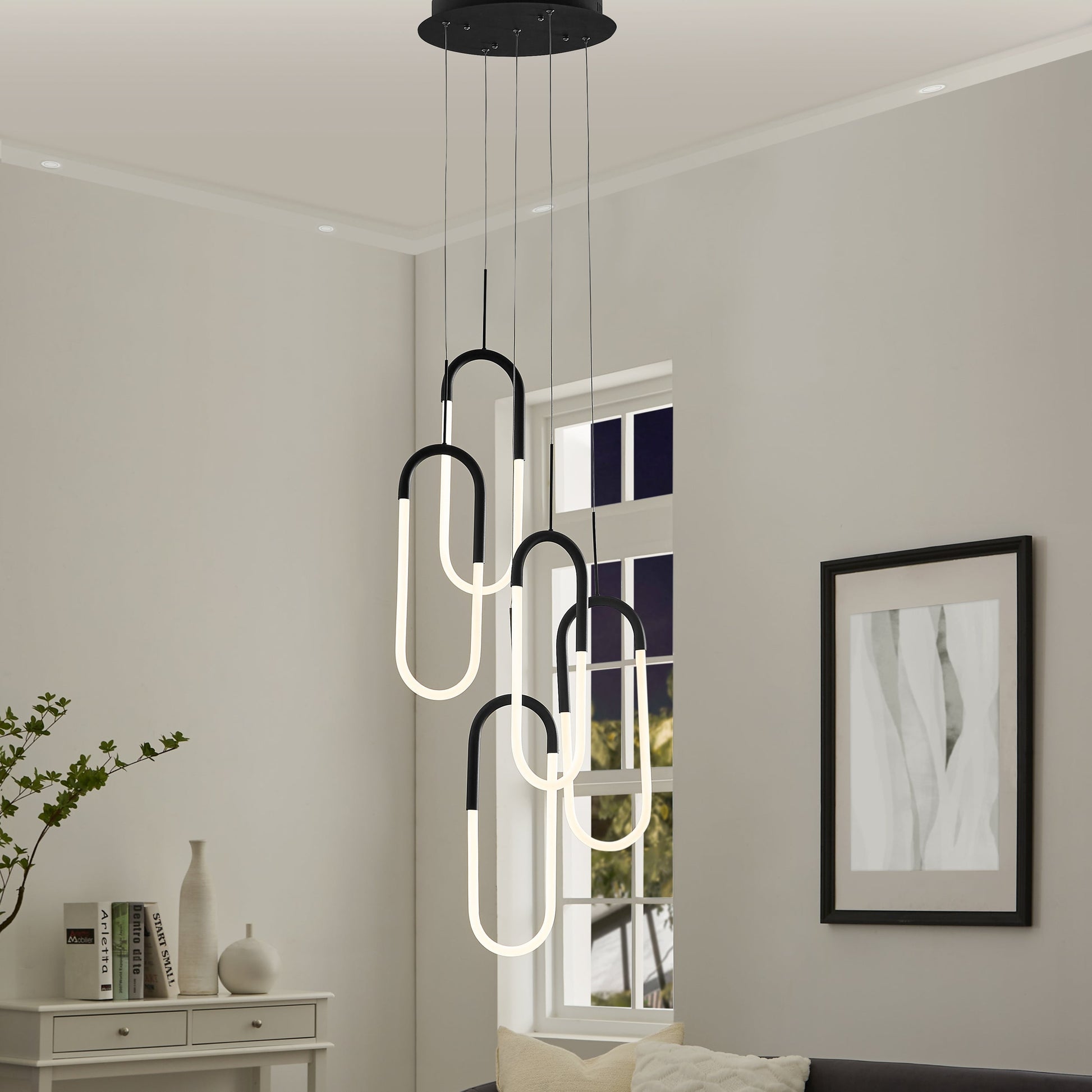 Every pendant has an adjustable hanging length of up to 138inches. Each pendant comes with an LED integrated strip and its protected by a durable silicone casing. The other half of each pendant is finished in high end Matte Black. Altogether the pendant creates a paper LED clip illusion that will make the chandelier a stunning focal piece in your home or office.