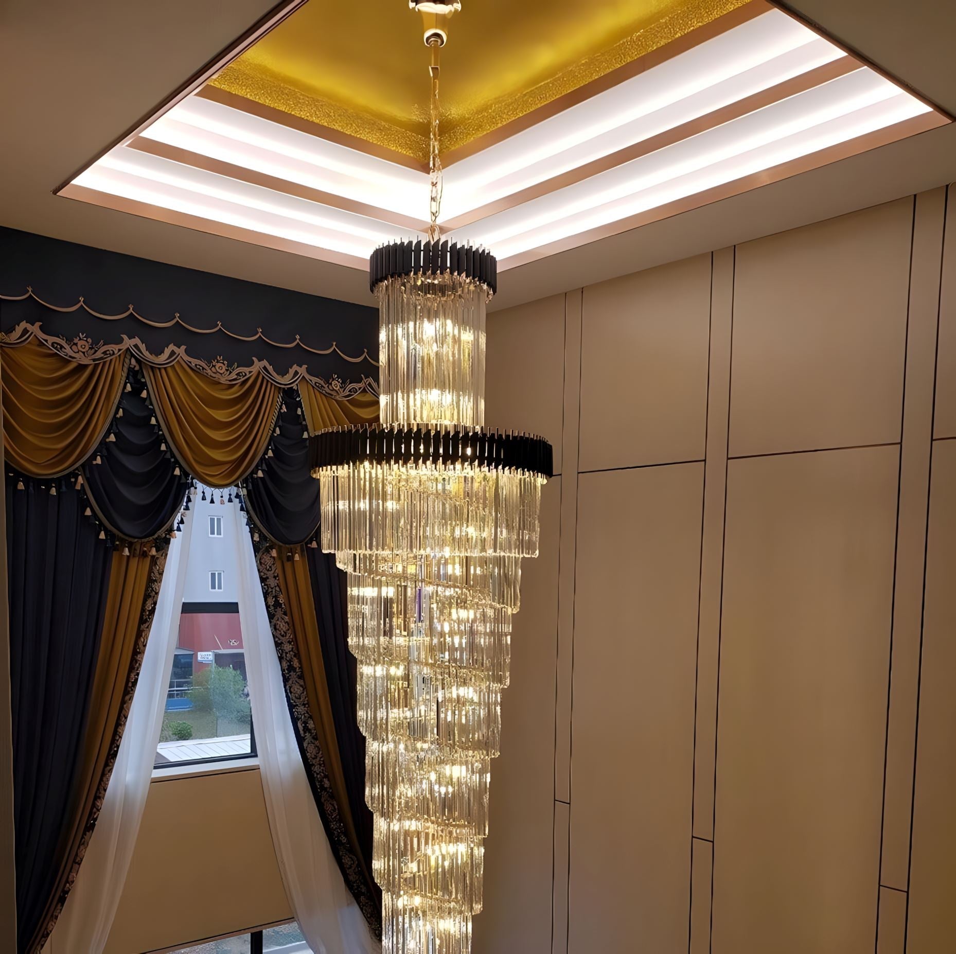 With its elegant design, the gold and crystal two-tier double-volume chandelier is the perfect addition to elevate any double-volume space into a breathtaking work of art. Indulge in the epitome of sophistication and indulge in the grandeur of this magnificent chandelier.The length of the wire is about 59.0" or about 1.5 meters. It's adjustable to fit your needs.