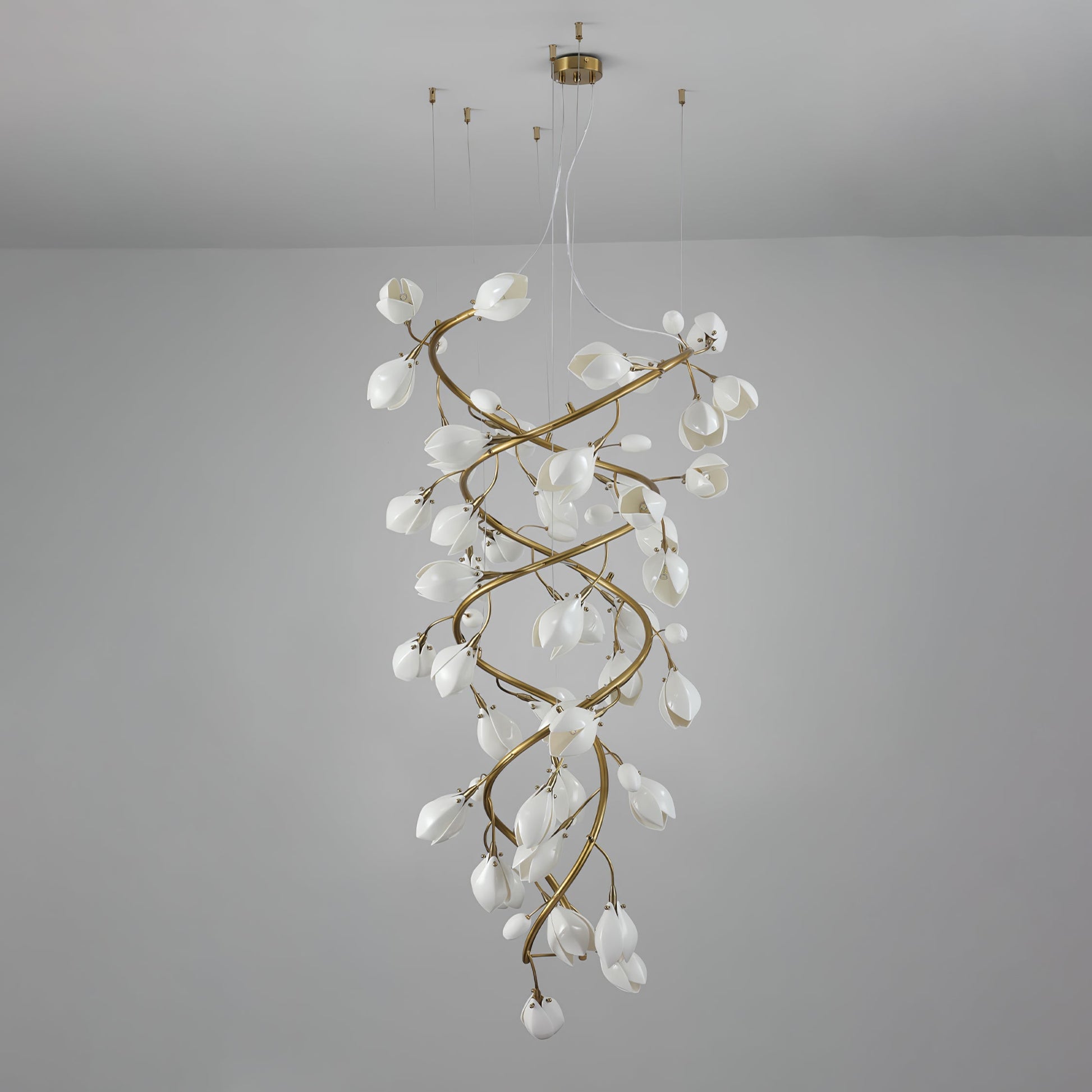 The Lysandra Cascade Chandelier by Vakkerlight combines electroplated iron and ceramic in a fluid, nature-inspired design. With its cascading arrangement of delicate ceramic petals and sleek metallic frame, this chandelier creates a stunning visual focal point. The soft glow from the ceramic shades highlights the intricate details of the petals, while the metallic finish adds an elegant, contemporary touch. Perfect for modern or minimalist spaces, the Lysandra Cascade Chandelier brings a sophisticated and timeless beauty to any room.