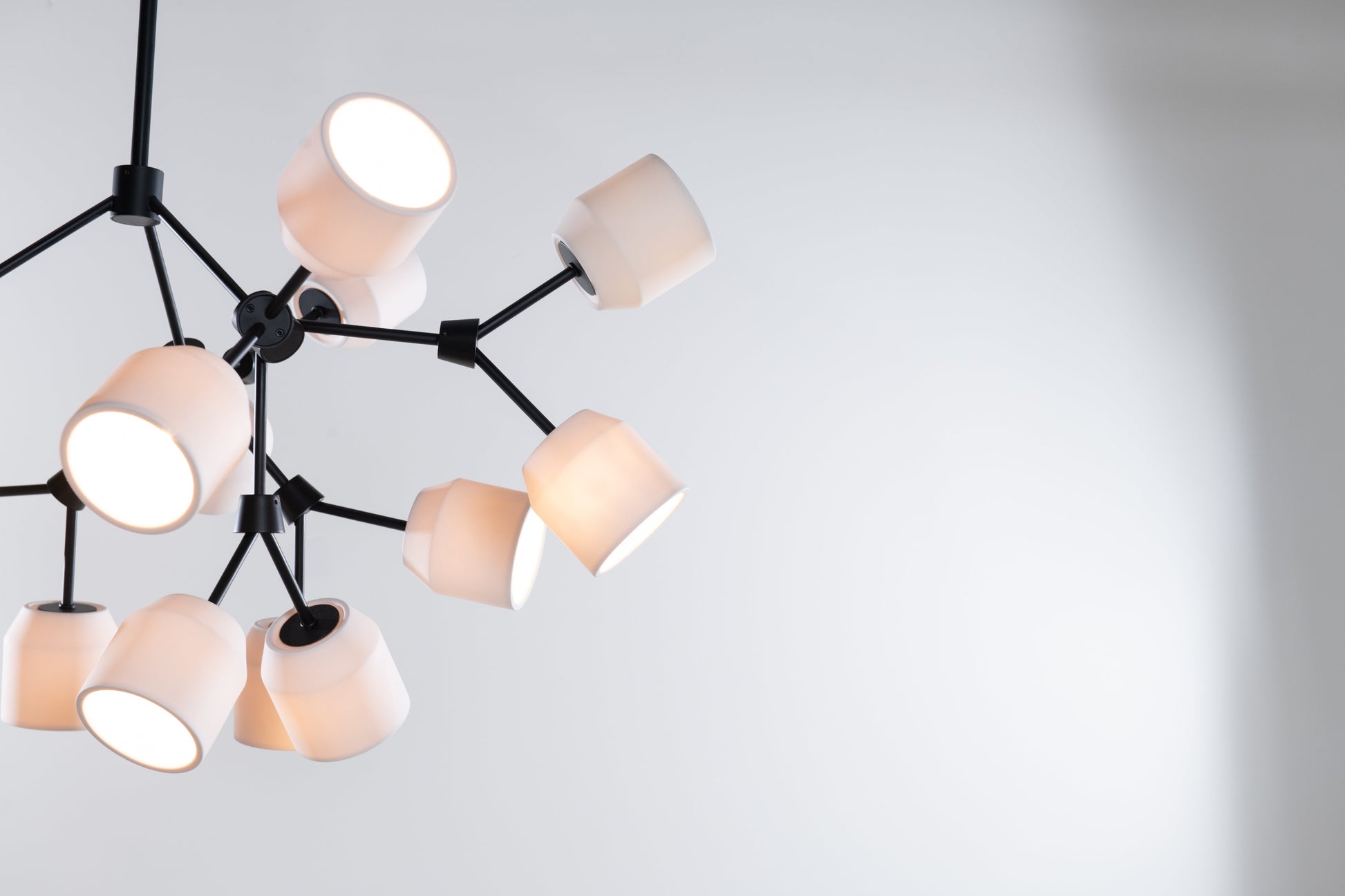 Meet Maison. Her cluster of artisanal matte white ceramic shades give a warm glow. When lit, her sleek matte black frame is timeless. She gives a welcoming feeling to any space, especially as a living room chandelier. Maison’s chandelier lights are warm when lit. Pictured both on and off to note differences in appearance.