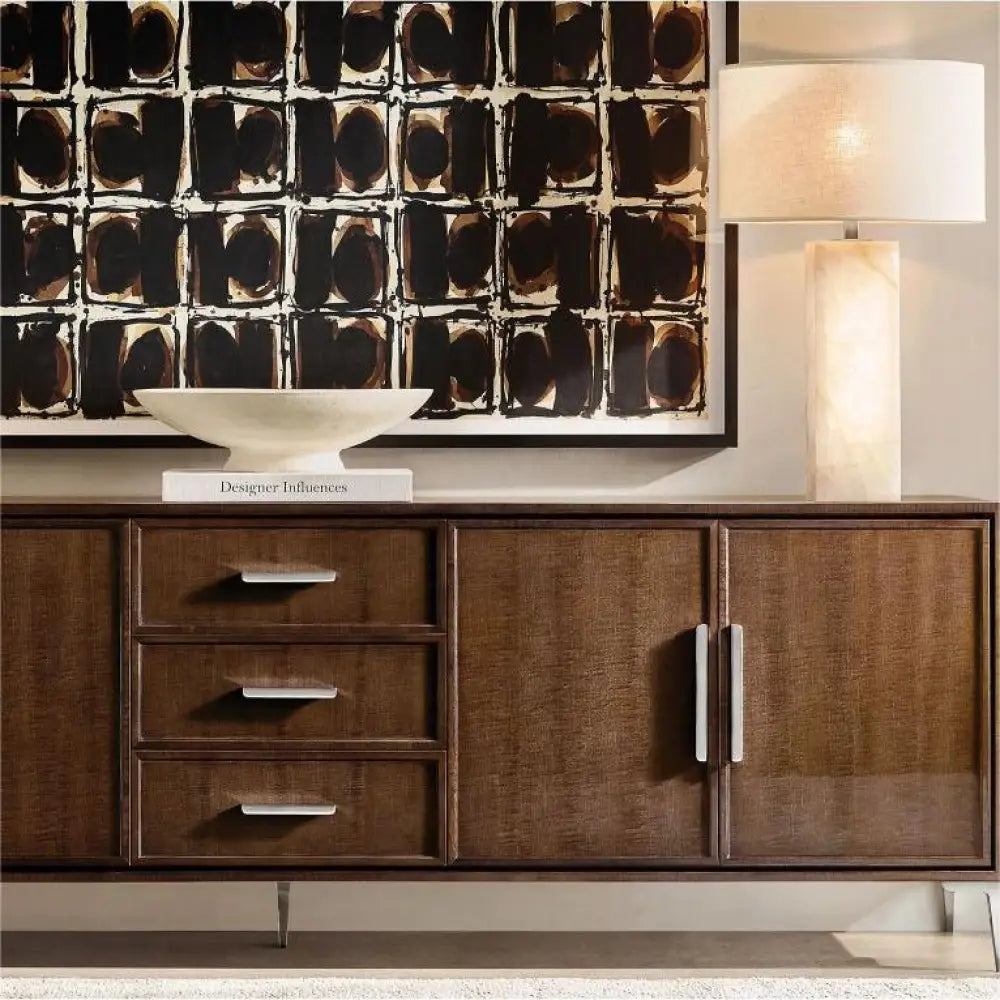 Hand-carved alabaster column emits a soft, warm glow, complemented by brass accents and a linen shade. A refined lighting piece designed to bring sculptural elegance to contemporary interiors