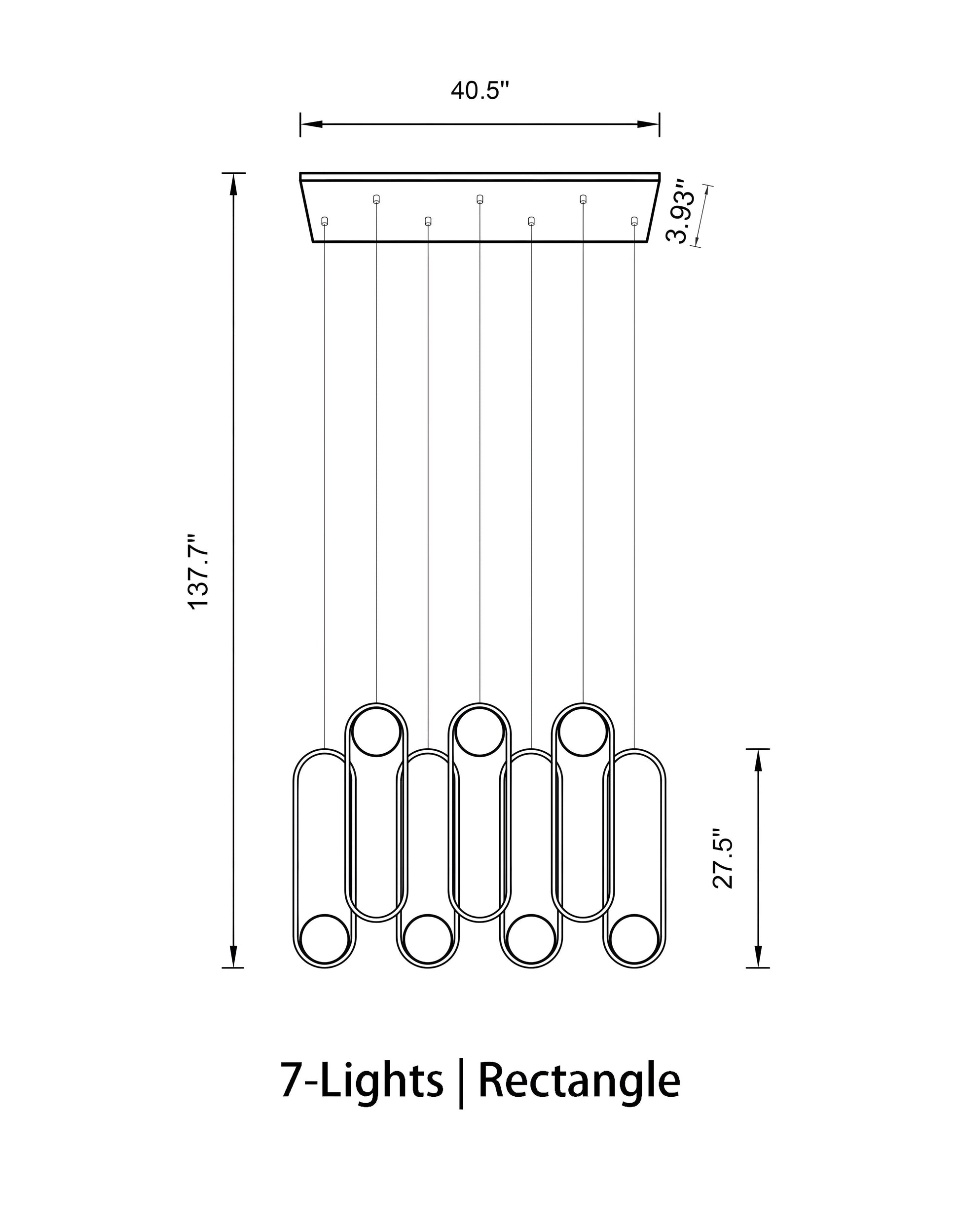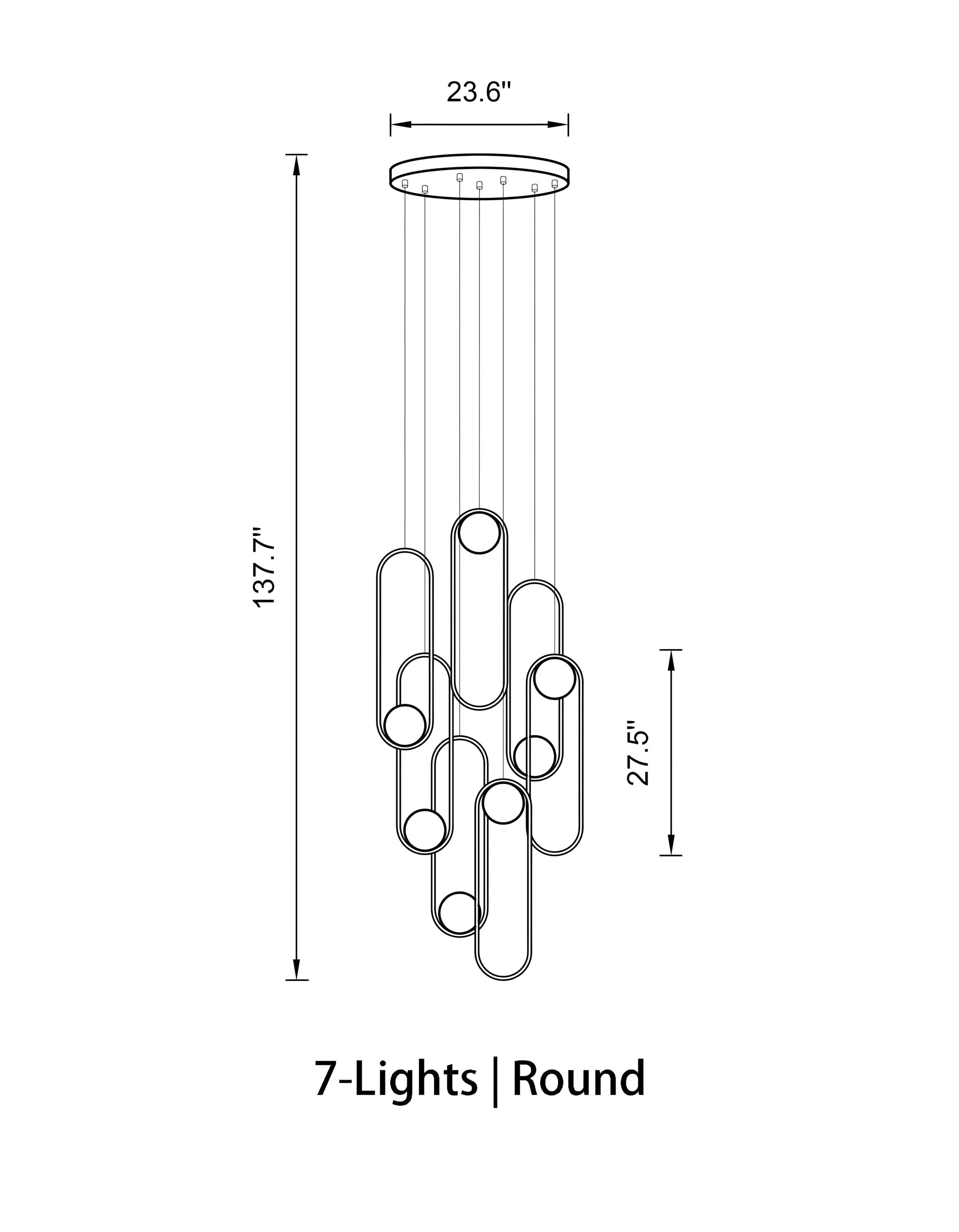 - Round - 7 Lights - 23.6" D × 137.7" H / 59.9cm D x 349.8cm H