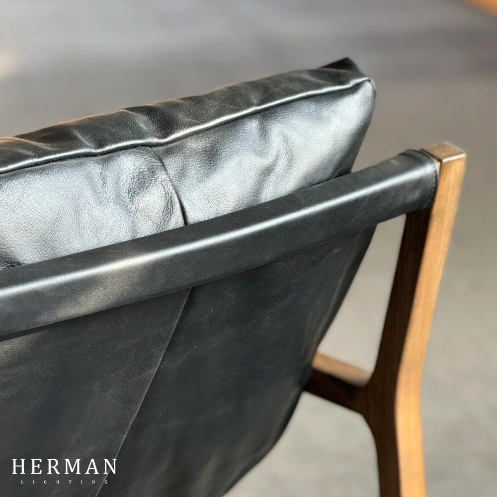 The Mosey Luxe Chair combines innovative design with unparalleled comfort, making it a perfect addition to any modern space. Inspired by the relaxed elegance of hammock seating, the chair features a uniquely optimized cushion with a three-section design for enhanced support and comfort. The high-quality imported first-layer cowhide leather with a wax finish complements the sleek matte black ash wood frame, while the black washed canvas back adds a touch of rustic charm. Designed with both style and practicality in mind, the Mosey Luxe Chair offers ultimate relaxation in an aesthetically pleasing package.