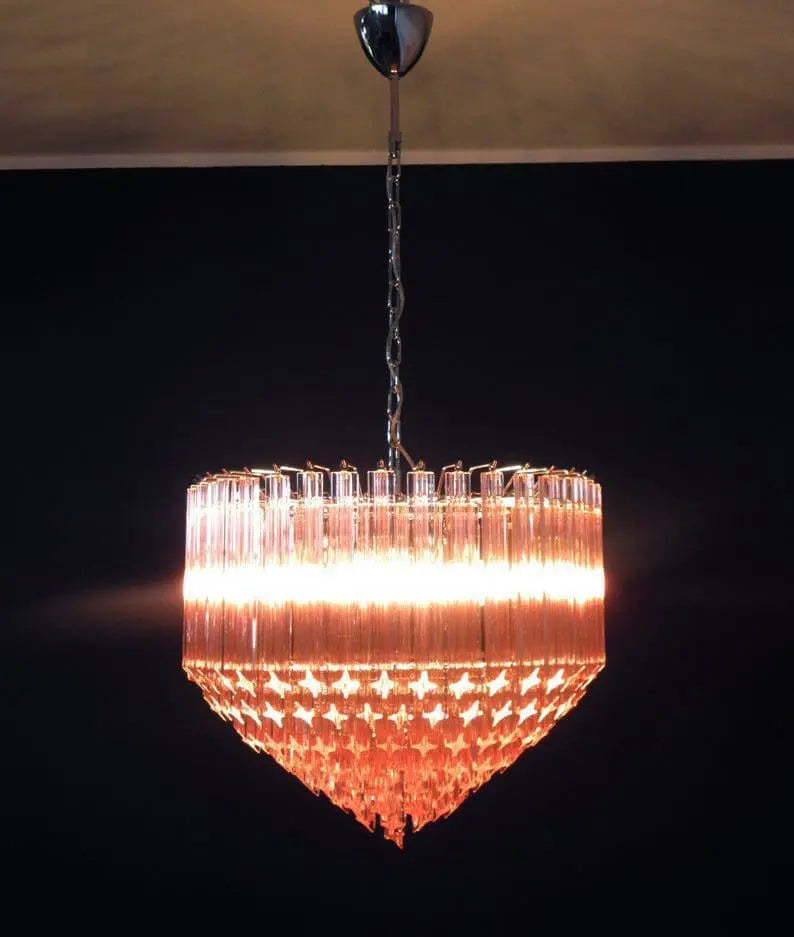 Expertly crafted in Murano, Italy, this chandelier boasts 163 beautiful prisms in a delicate shade of pink. Illuminate any room with its elegant design and enhance the atmosphere with a touch of luxury. Perfect for those who appreciate fine craftsmanship and timeless beauty.