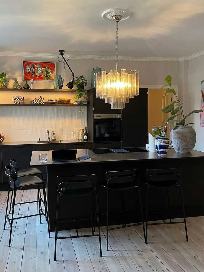Expertly handcrafted in Murano, Italy, this stunning chandelier features 36 tubes in a beautiful blend of smoked and transparent glass. Each piece is unique, adding character and elegance to any space. With intricate design and high-quality materials, this chandelier is a timeless addition to your home.