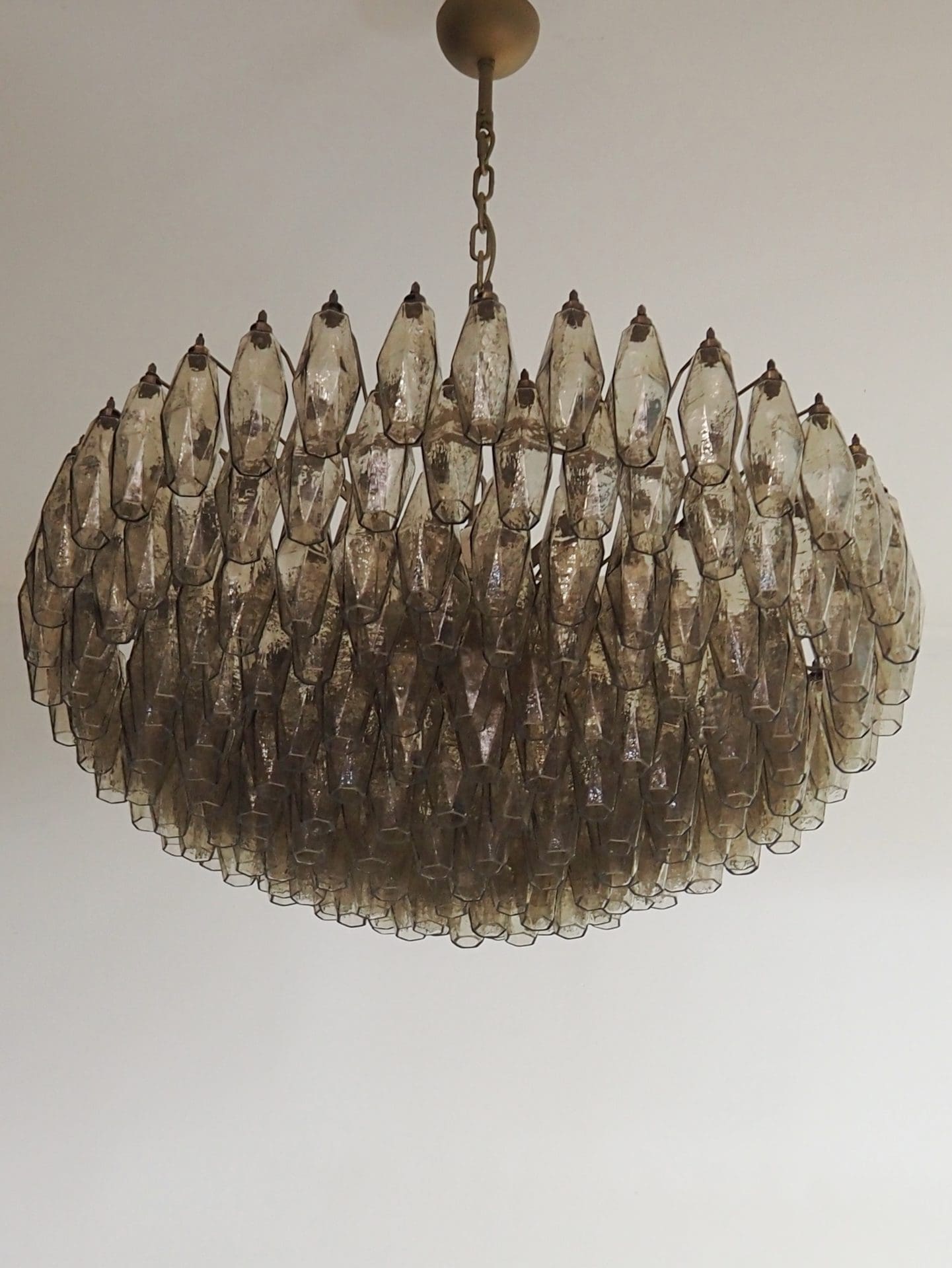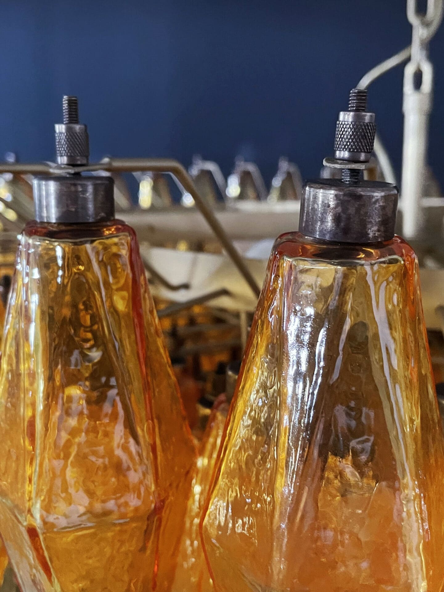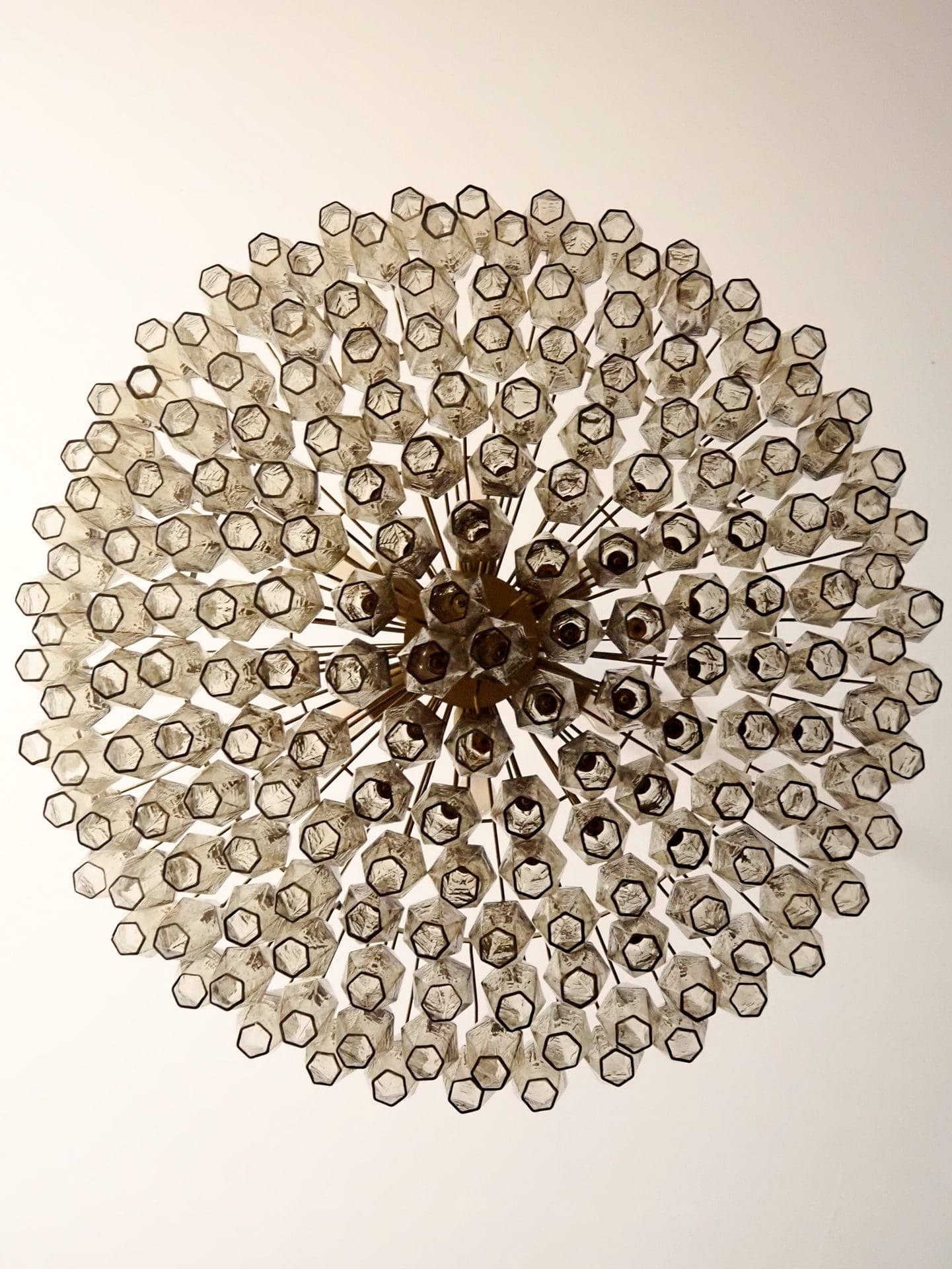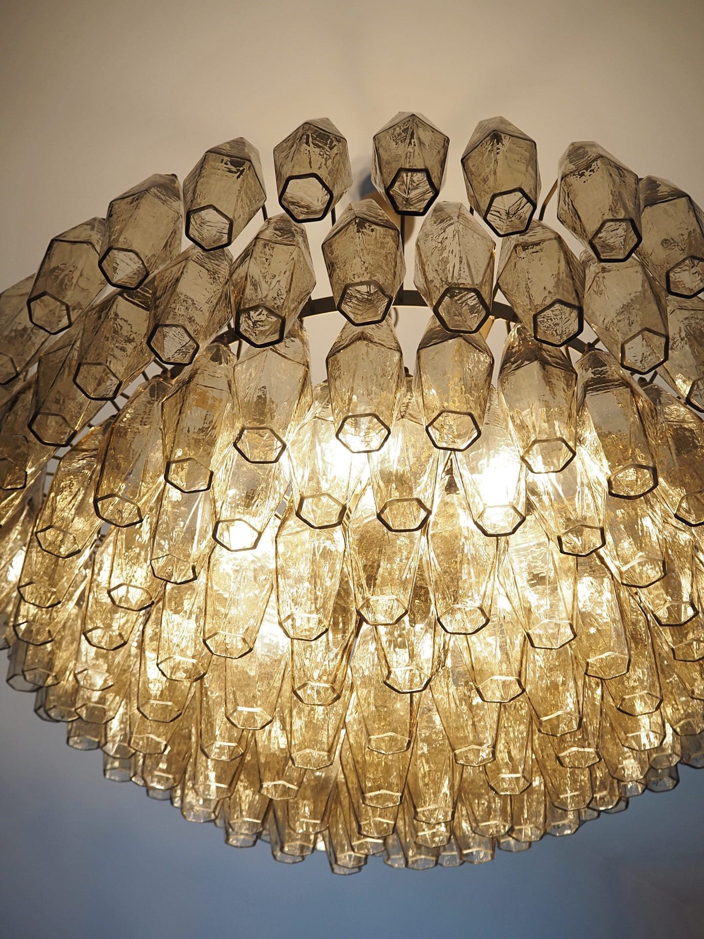 Enter a world of enchanting light and aesthetic elegance with our stunning Murano Poliedri Chandelier. This chandelier is adorned with a whopping 185 beautiful amber glas prisms carefully created by skilled italian glassblowers. It creates a seductive atmosphere and adds an aura of refined beauty to your space.