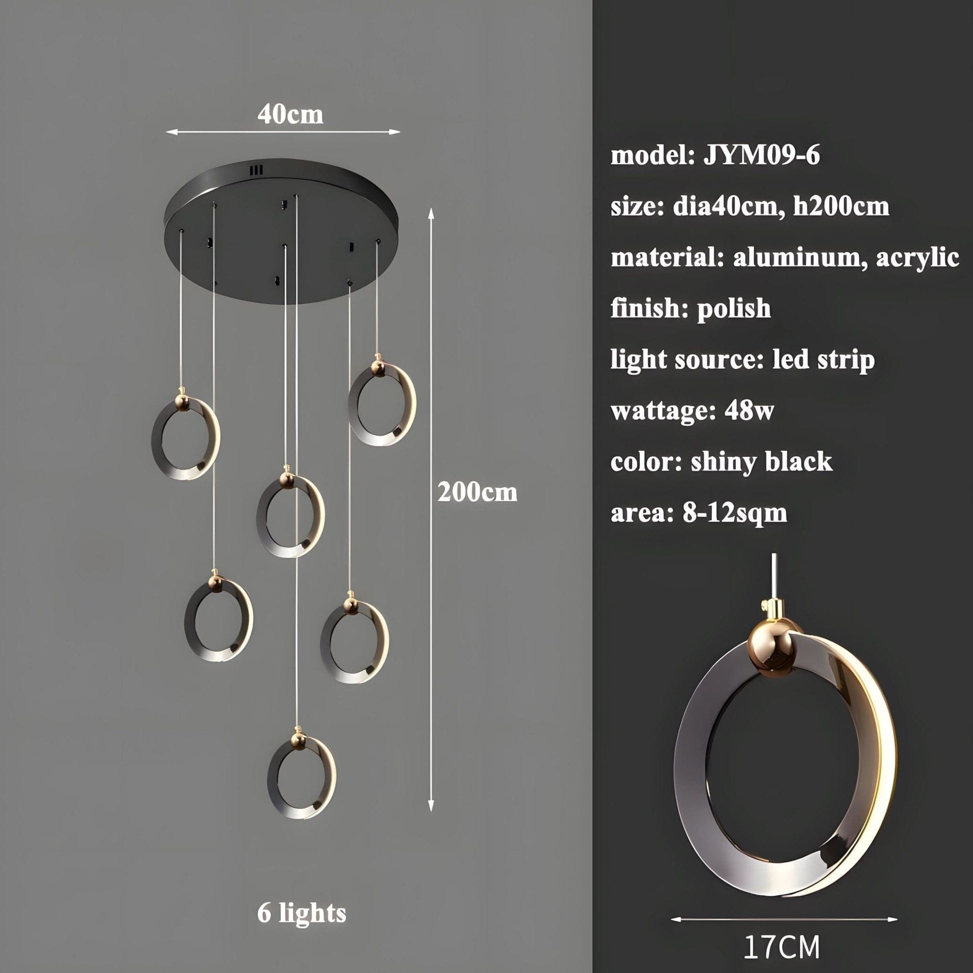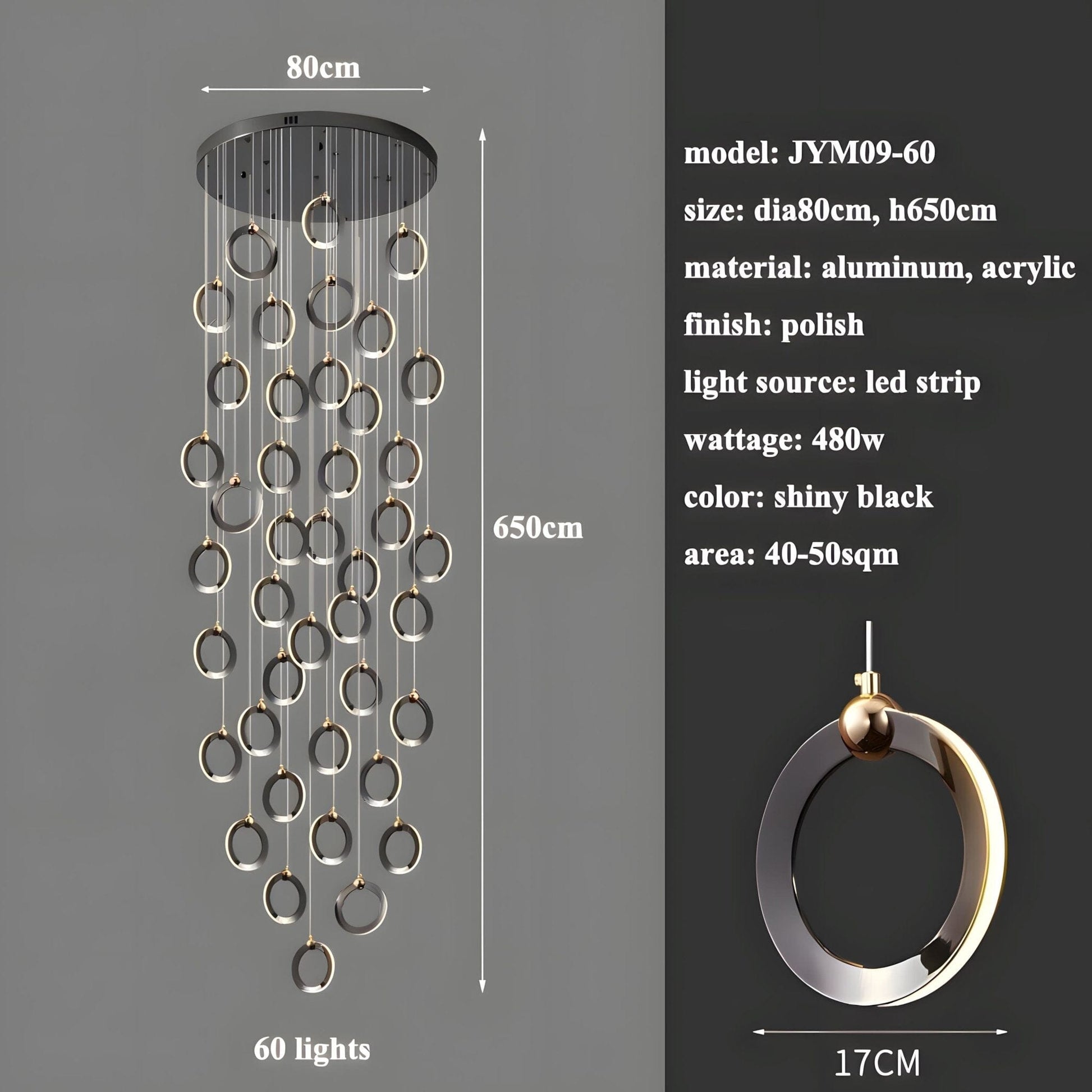Immerse yourself in the enchanting allure of Nebula, where modern style seamlessly intertwines with futuristic design. Its metal rings are embellished with integrated LED acrylic lights that cast an ethereal glow, transforming your living area, stairwell, or entrance into a captivating space. The adjustable wire spans from 1.5m to 4m, giving you the flexibility to tailor the height to your preferences, making it ideal for various settings such as living rooms, staircases, and lobbies.
