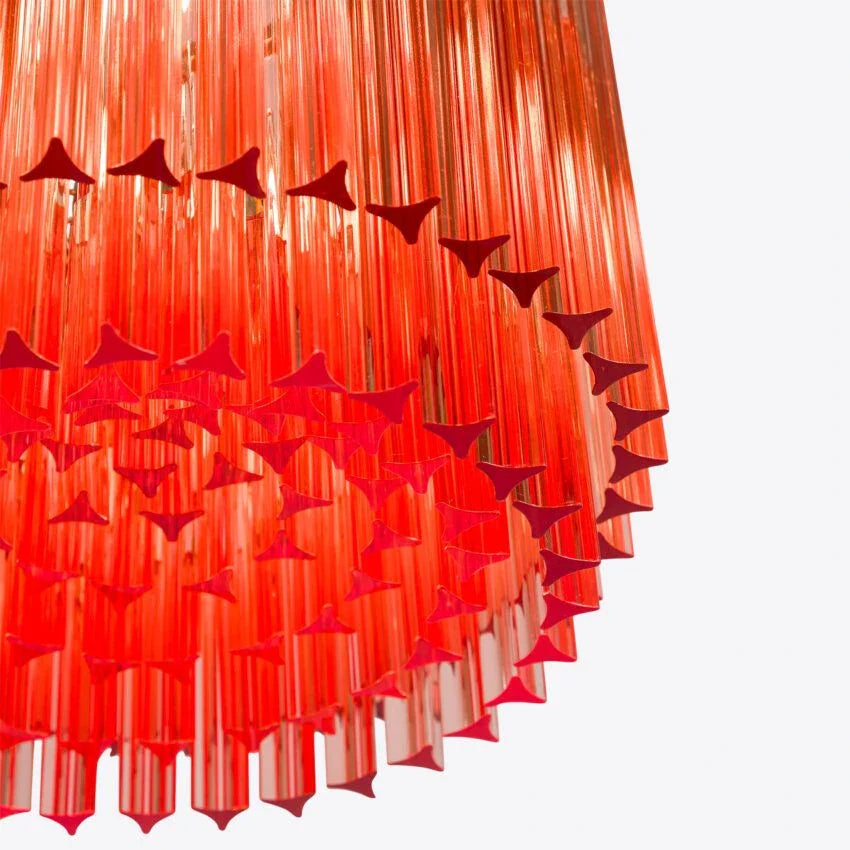 The Amaro chandeliers feature layers of mid-century inspired tri-style glass prisms, making them the ideal centerpiece for smaller spaces like living rooms, dining areas, or lobbies.