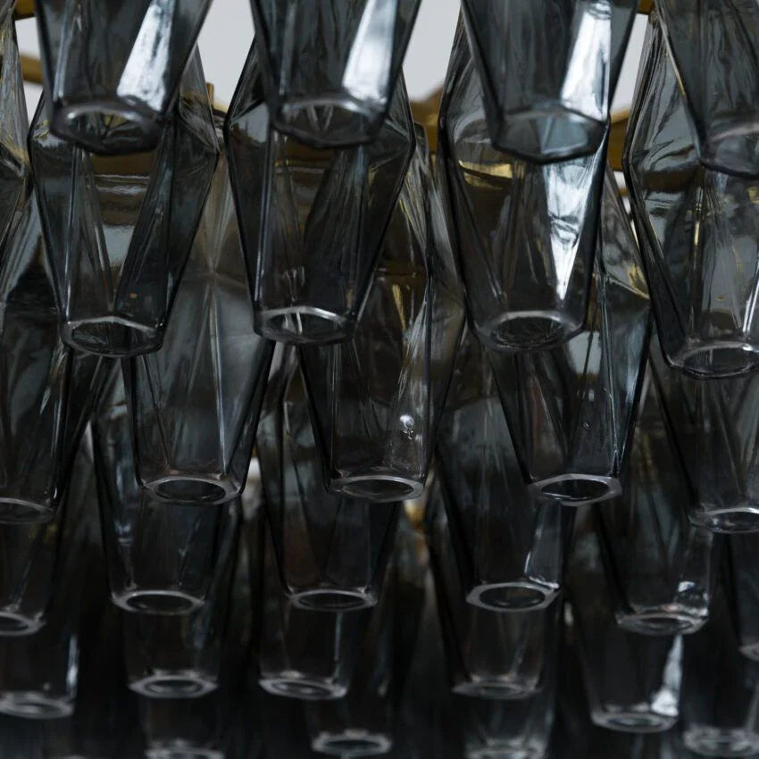 The Sorrento tiered chandelier is a breathtaking, vintage-style lighting masterpiece, offered in four stunning finishes: Pink, Amber, Smoked Glass, and Clear Glass. This captivating design features layers of intricately shaped colored glass polyhedrons, each meticulously secured to an elegant brass-finished frame, blending timeless charm with modern sophistication.