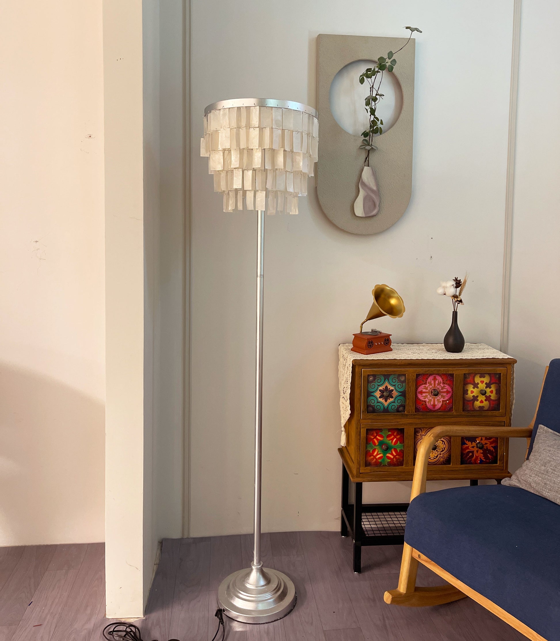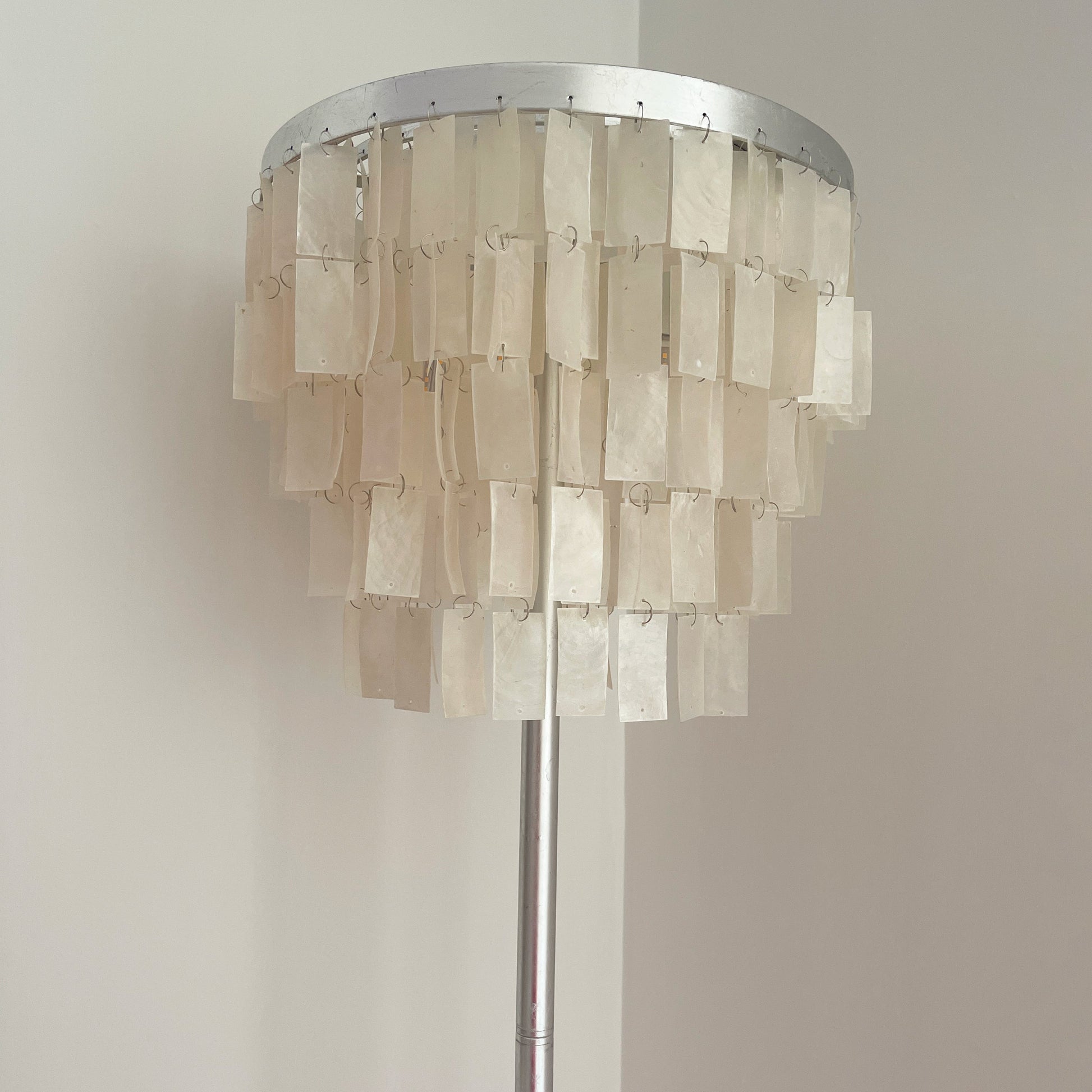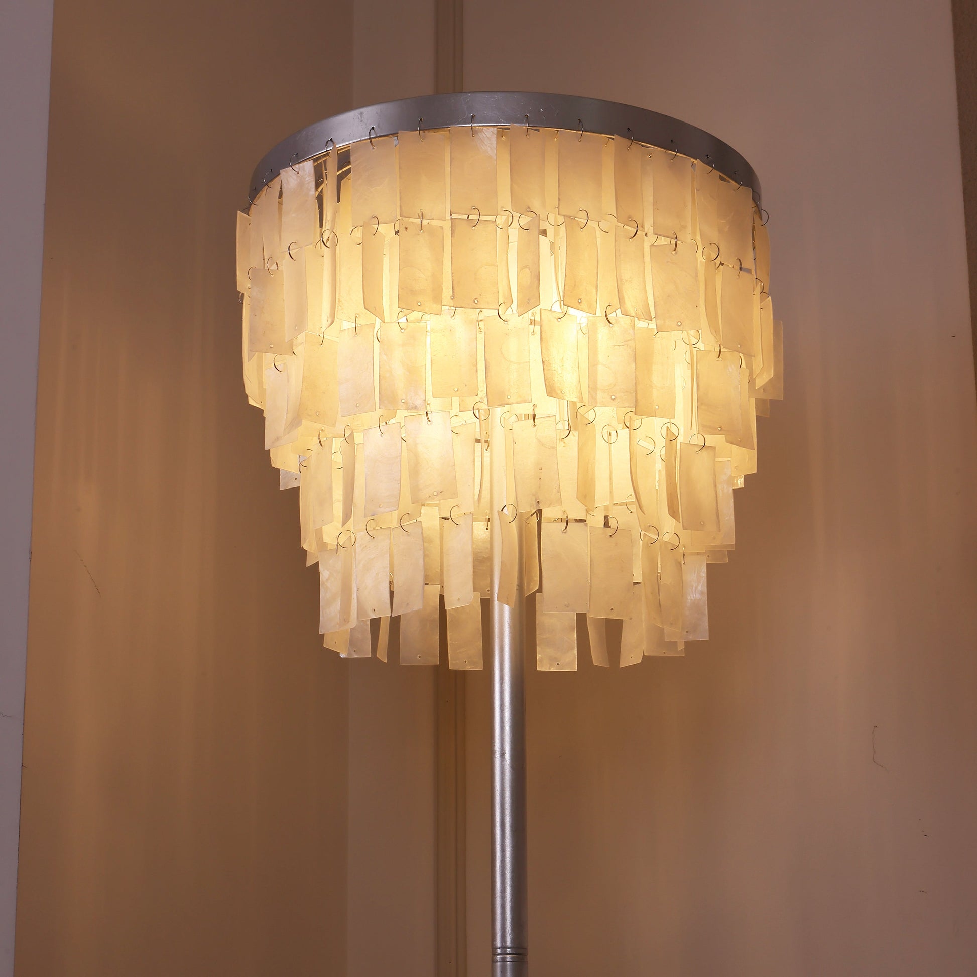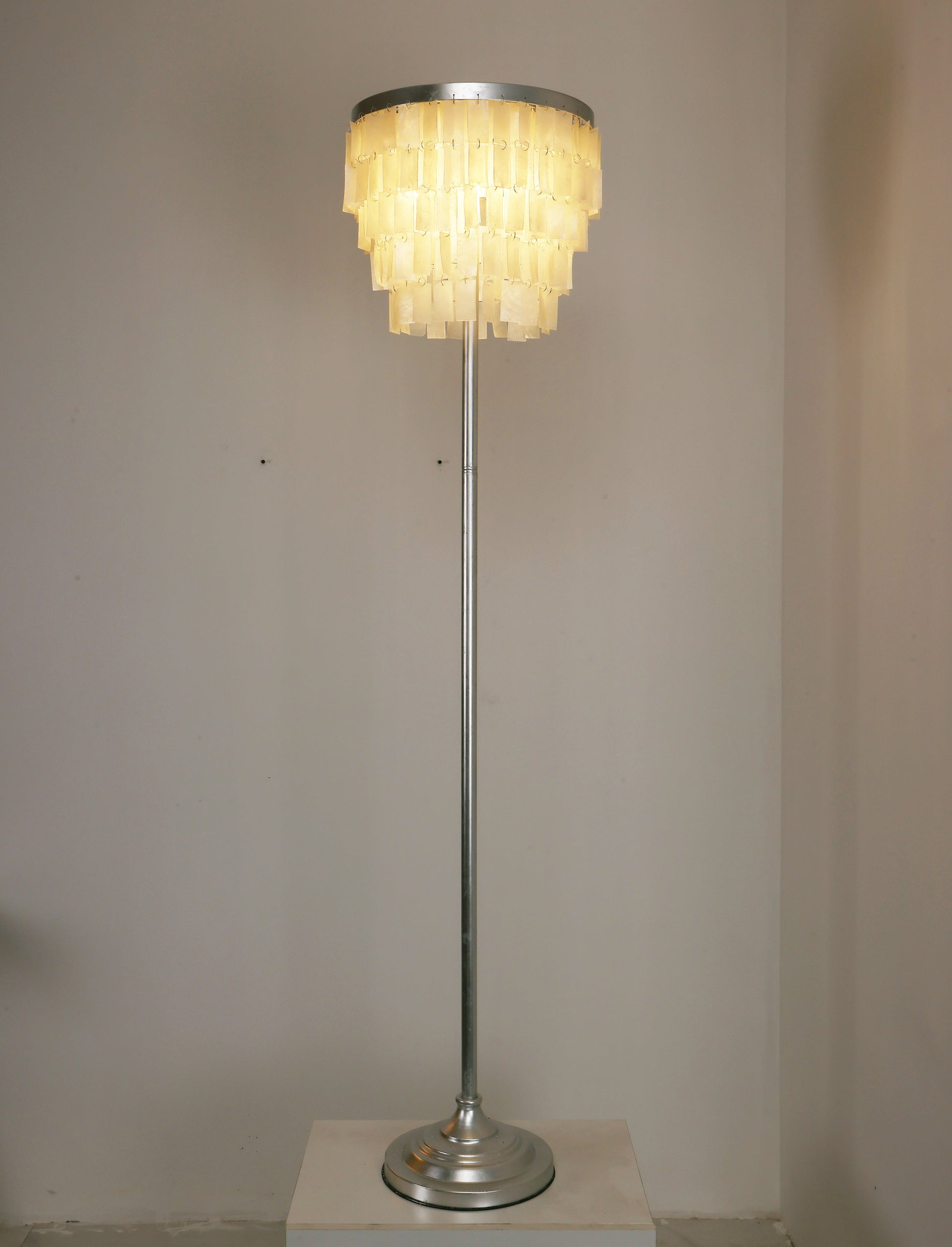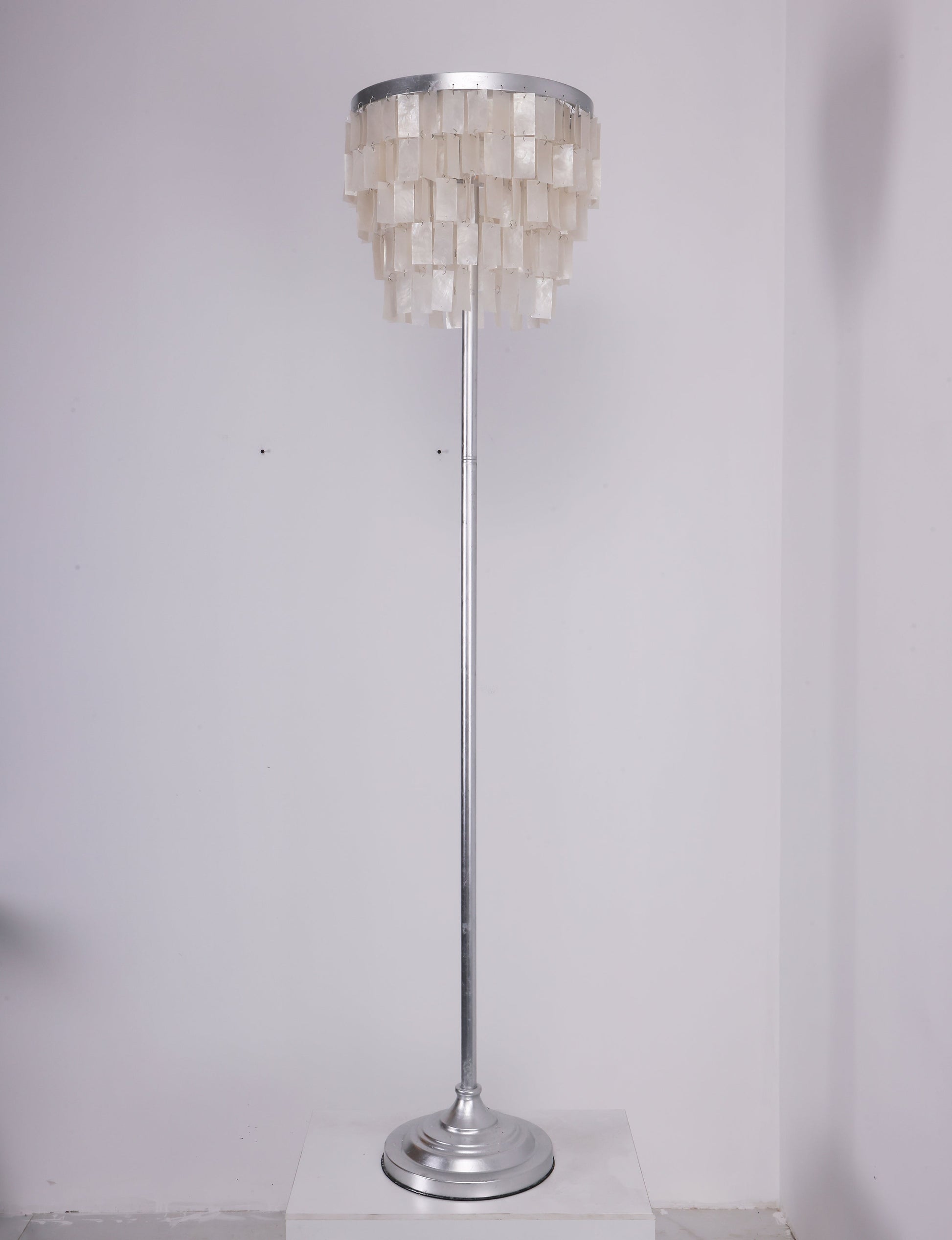 This Skye Tiered Floor Lamp, Illuminate your home with the stunning glow of the Skye Tiered Floor Lamp. Rectangular shell tiles are suspended in layers, and each shell is translucent to allow light to filter through. Our Floor Lamp showcases the shells to stunning effect, casting an ambient, pearlescent glow.
