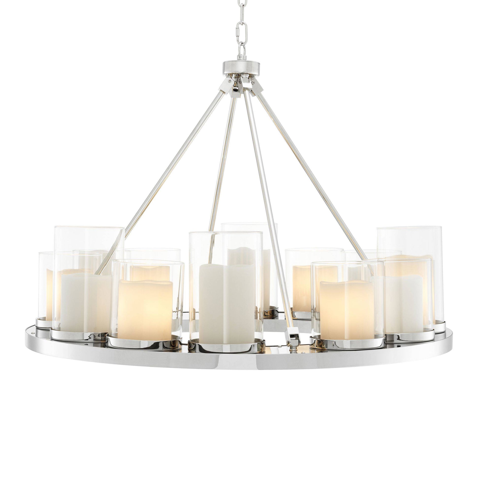 The glossy polished stainless steel plate of the Summit Chandelier is supported by a strong chain link ceiling canopy. This atmospheric pendant lamp nestles 12 exquisite glass hurricane lanterns inside and 4 recessed LED downlights. The lights in this chandelier can be turned on and off by using the included remote control. Several different settings are possible. This chandelier is not dimmable and cannot be used with a dimmer.