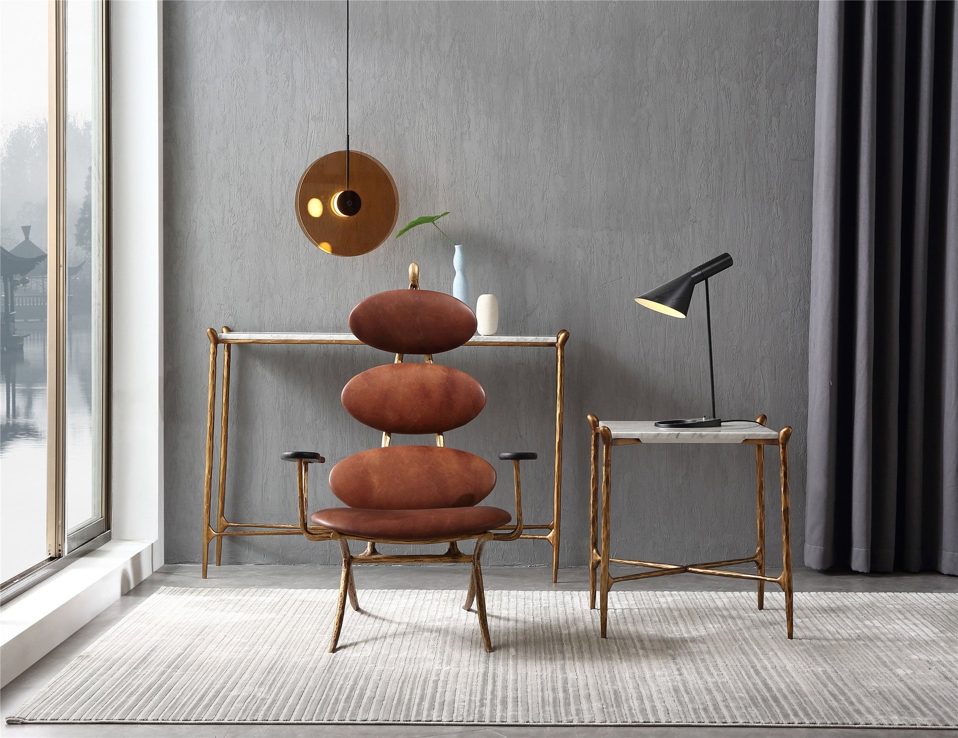 Our chair from the rustic sensibility of a hand-forged metal base with supple leather. Employing an ancient fabrication process, artisans hand hammer the metal bars to reveal an alive, imperfect and organic texture, a counterpoint to the frame's slender, tapered silhouette.