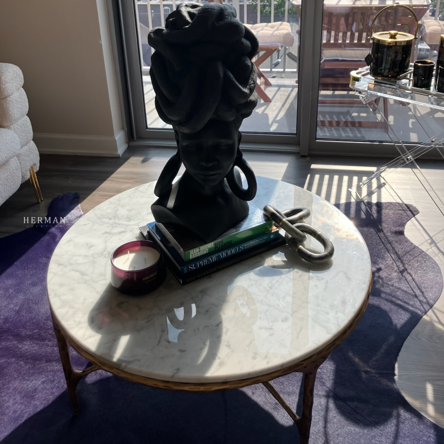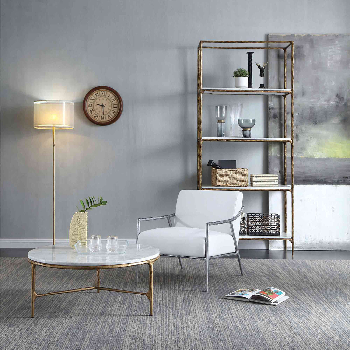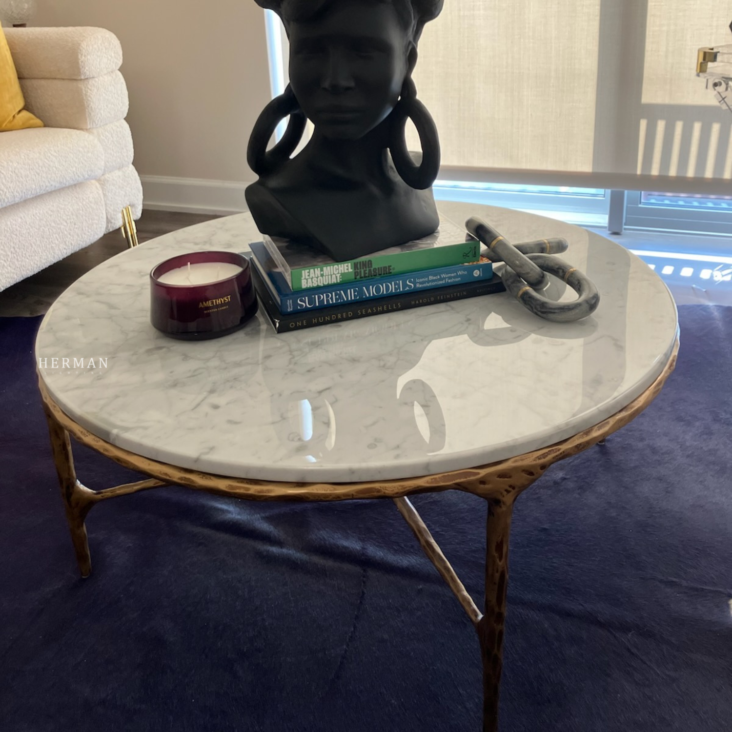 Our collection by the rustic sensibility of hand-forged metal with cool Italian marble. Employing an ancient fabrication process, artisans hand hammer the metal bars to reveal an alive, imperfect and organic texture. The pounded, tapered silhouettes are a rich counterpoint to the smooth, honed stone.