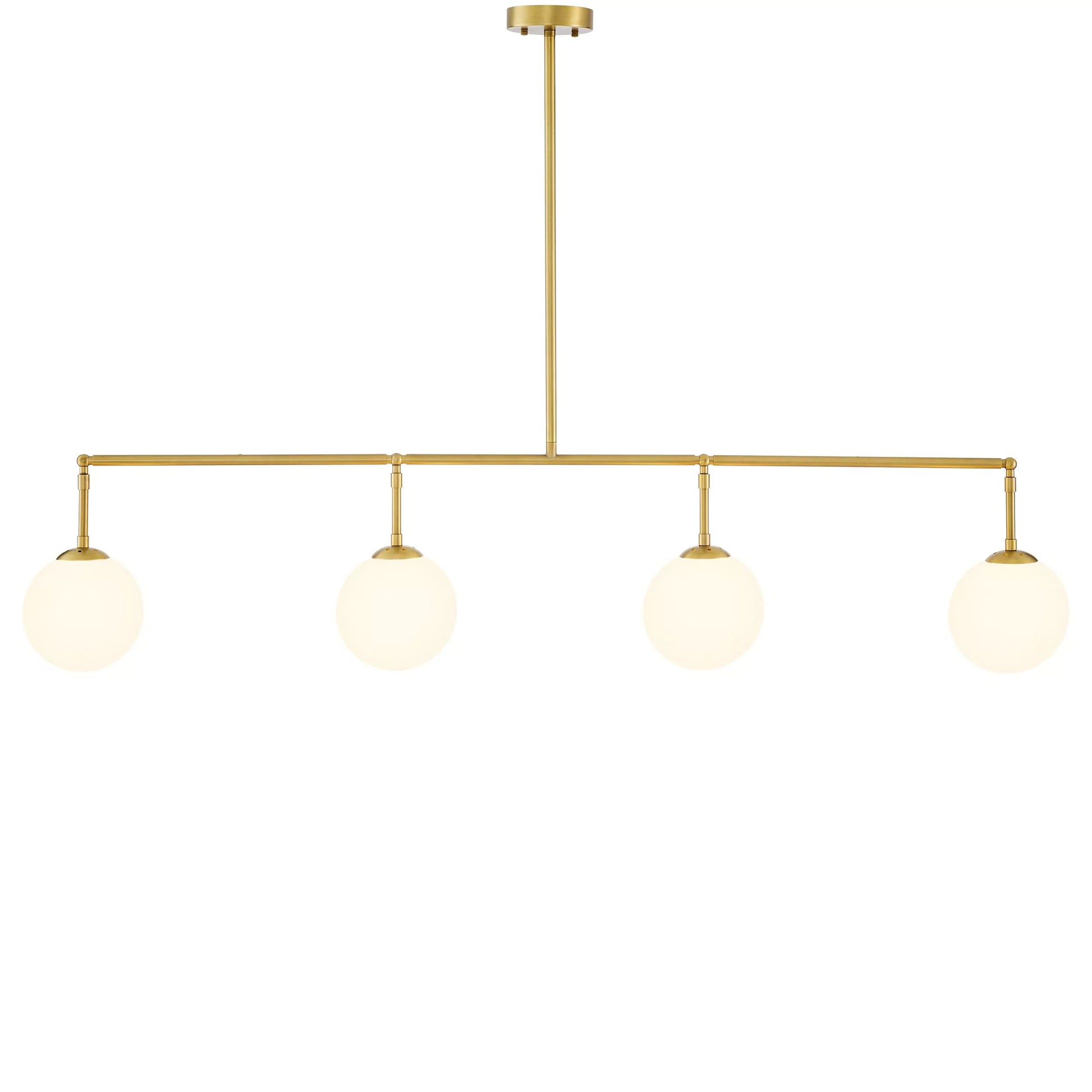 Crafted from metal and provided with an antique brass finish, Chandelier Tara features four globes hanging on a rod equidistant from each other. Popular with its beauty and function, this elegant pendant light will give your dining room or kitchen island a Mid-Century Modern vibe