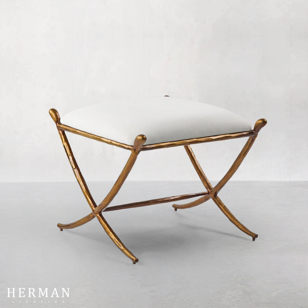 Our Stools from the rustic sensibility of a hand-forged metal base with tailored upholstery. Employing an ancient fabrication process, artisans hand hammer the metal bars to reveal an alive, imperfect and organic texture, a counterpoint to the frame's slender, tapered silhouette.