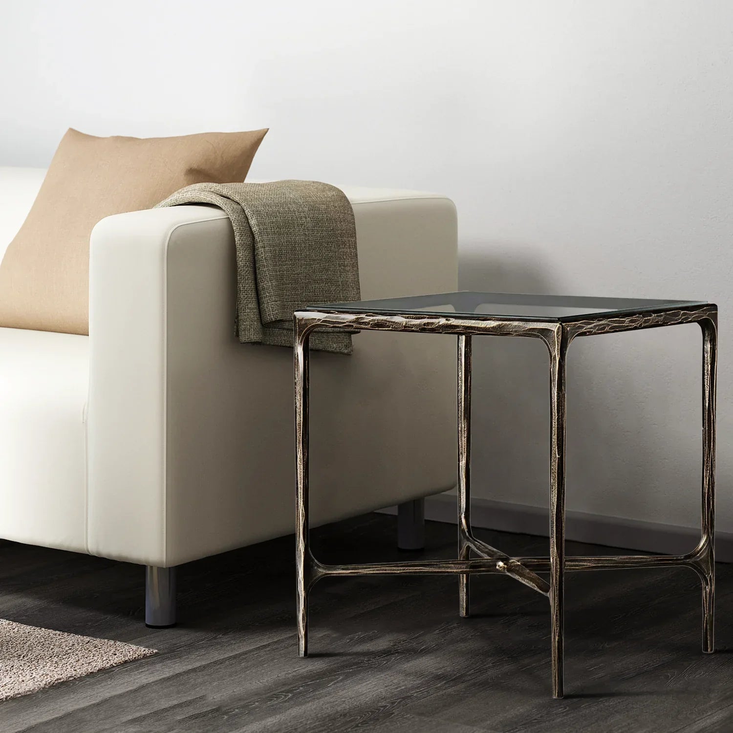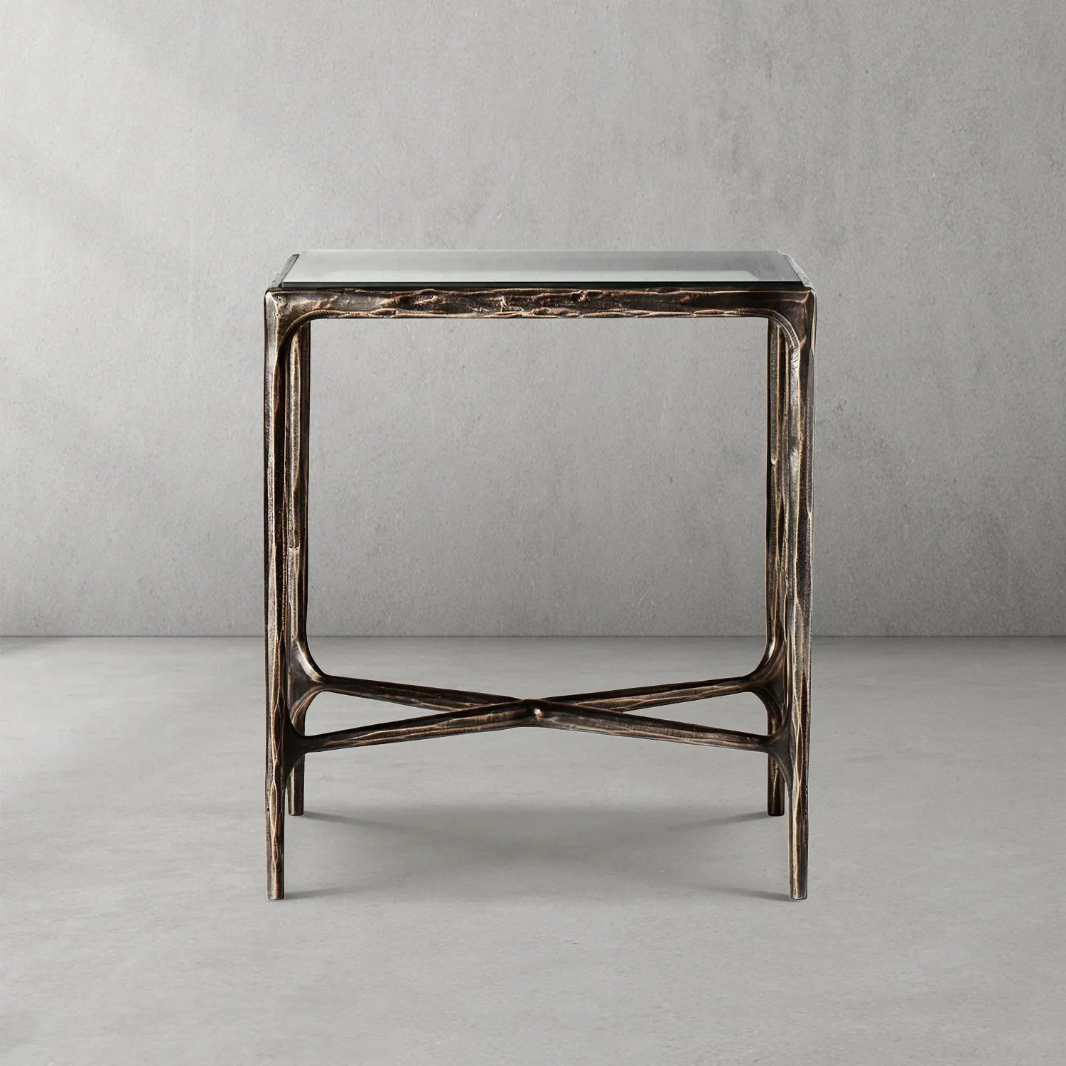 Inspired by the sculptural works of Salvador Dalí and Diego Giacometti, our collection by Alexander merges the rustic sensibility of a hand-forged metal base with a clear glass top. Employing an ancient fabrication process, artisans hand hammer the metal bars to reveal an alive, imperfect and organic texture, a counterpoint to the frame's slender, tapered silhouette.