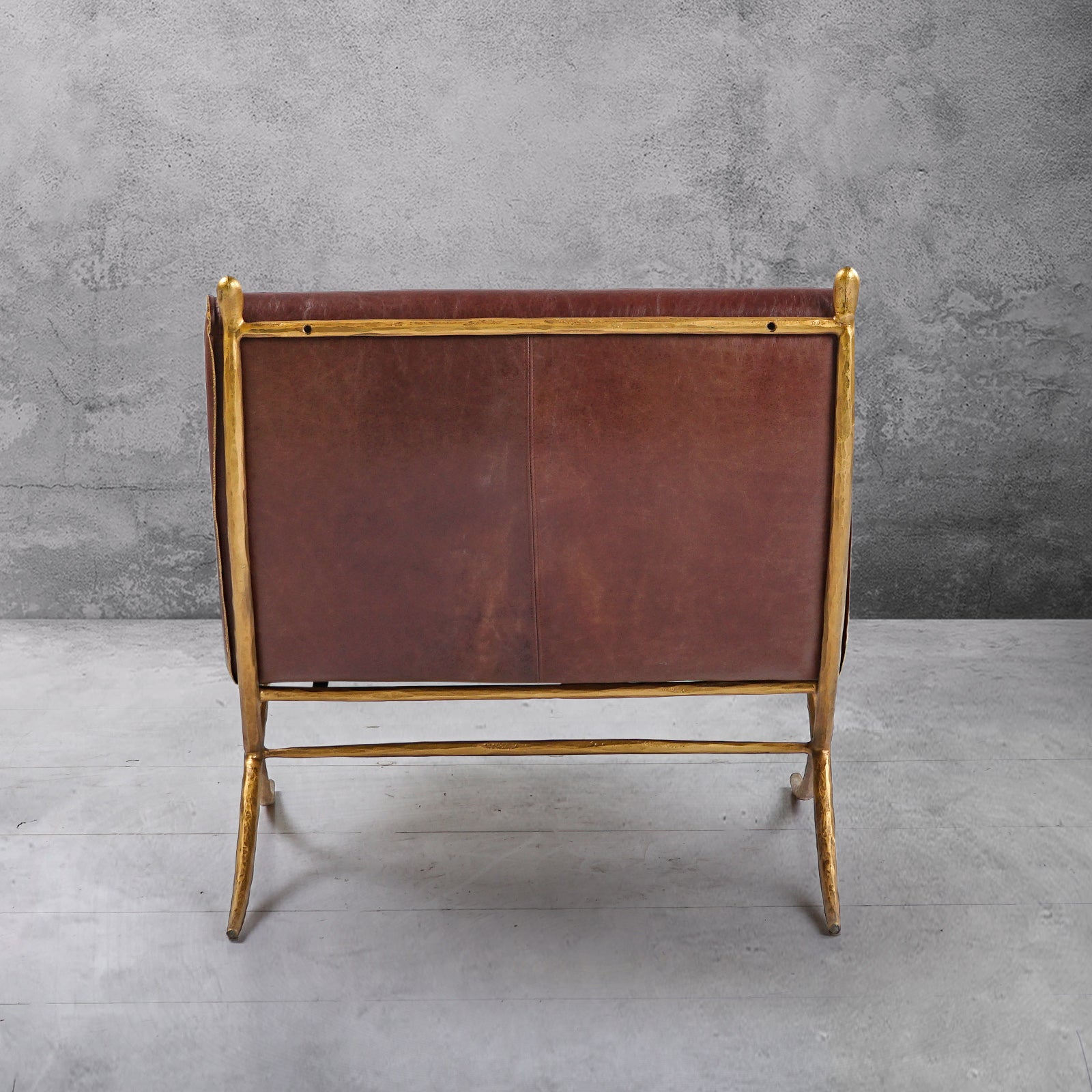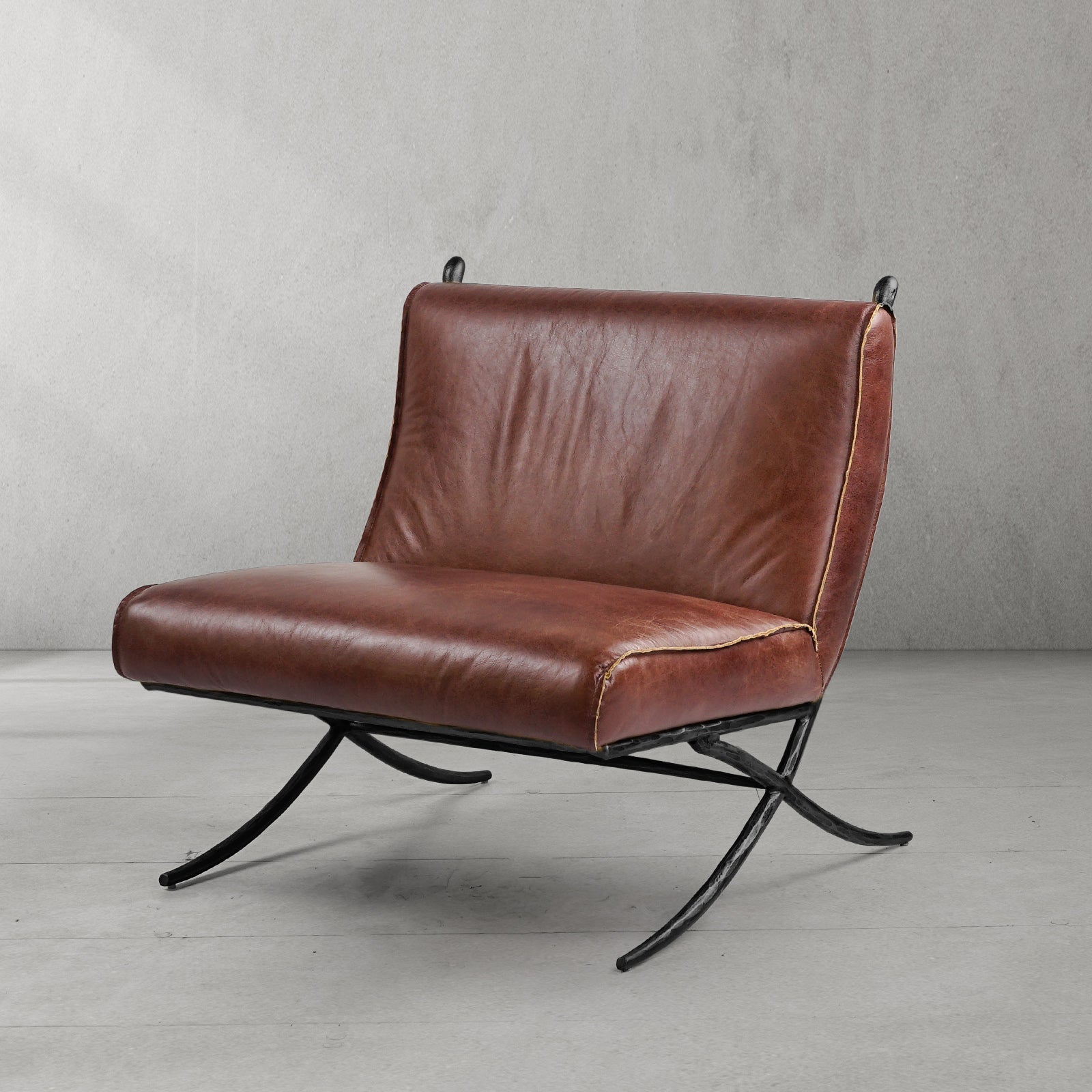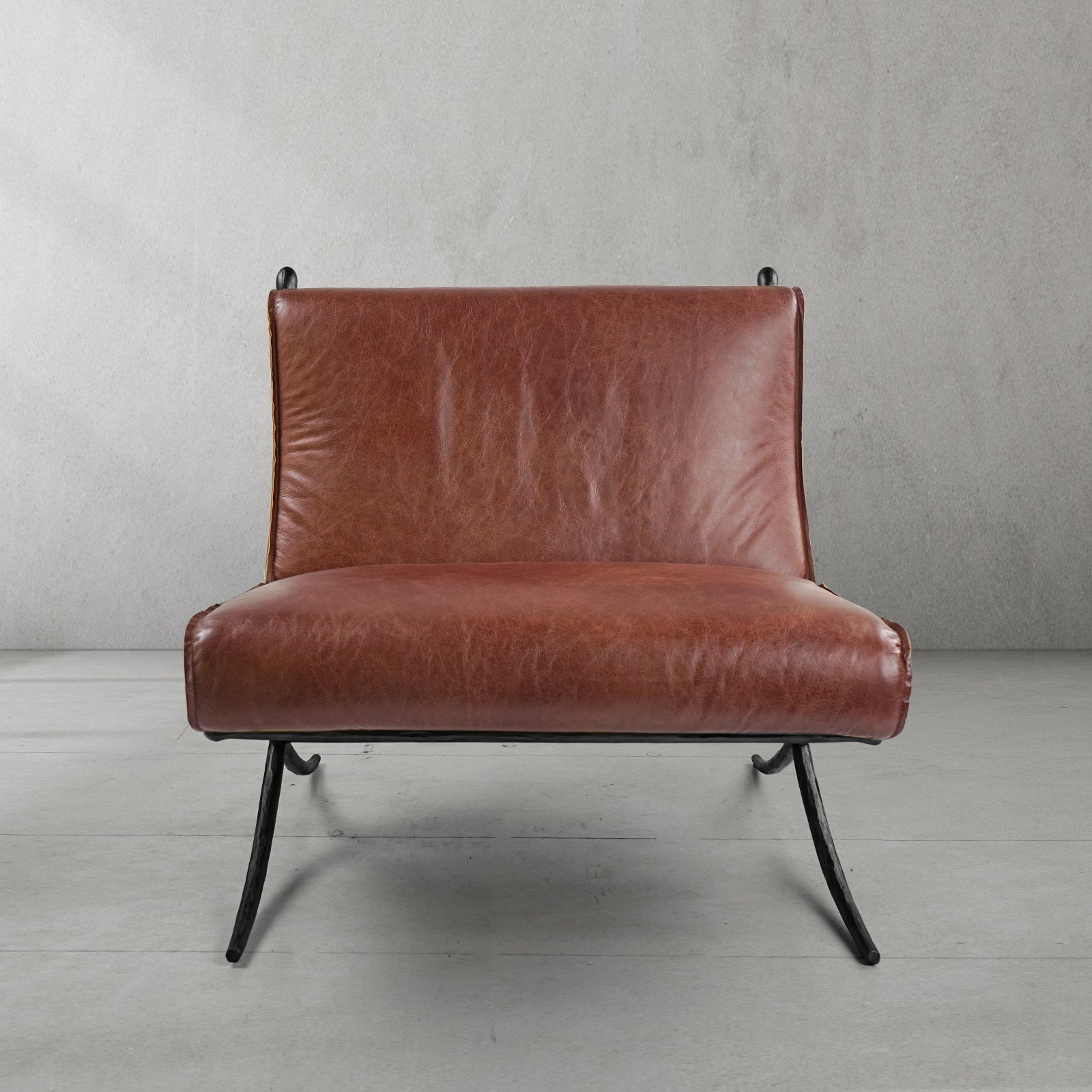 Our chair from the rustic sensibility of a hand-forged metal base with tailored upholstery. Employing an ancient fabrication process, artisans hand hammer the metal bars to reveal an alive, imperfect and organic texture, a counterpoint to the frame's slender, tapered silhouette.