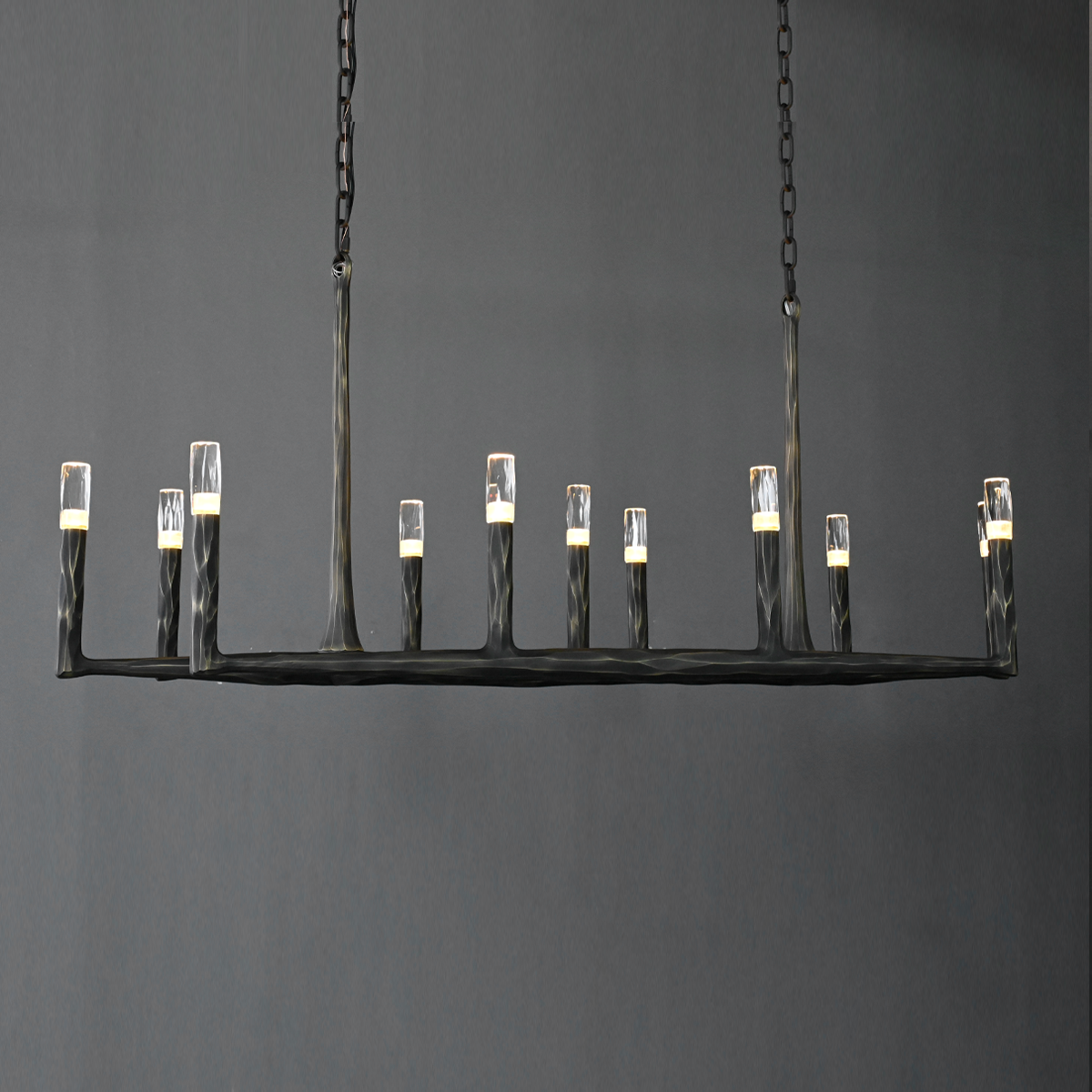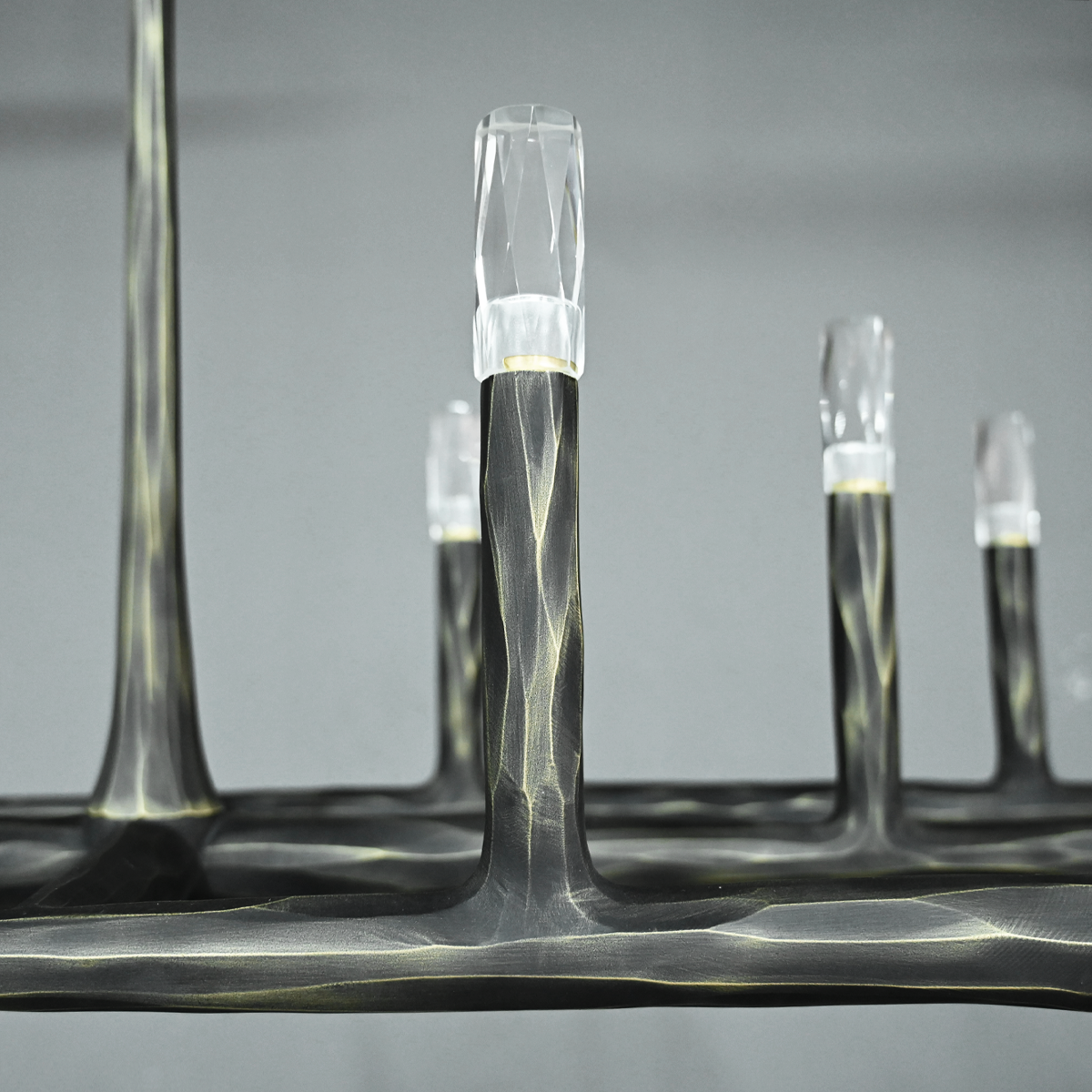 - Faceted, cast glass bulb covers echo the texture of the metal