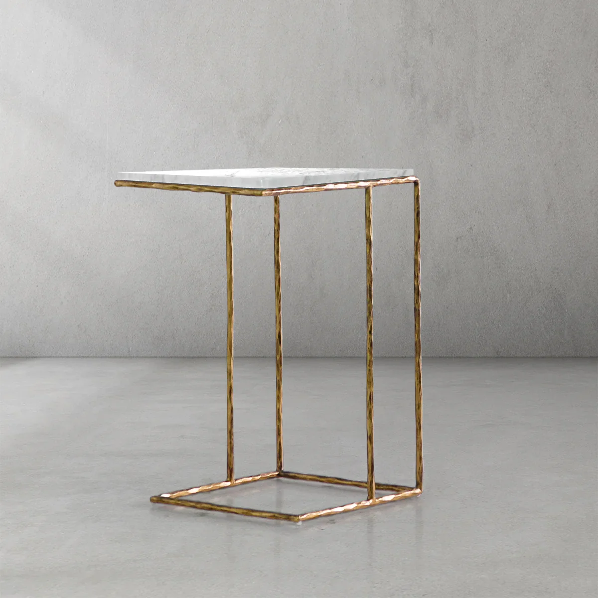 Our collection by the rustic sensibility of hand-forged metal with cool Italian Carrara marble. Employing an ancient fabrication process, artisans hand hammer the metal bars to reveal an alive, imperfect and organic texture. The pounded, tapered silhouettes are a rich counterpoint to the smooth, honed stone.