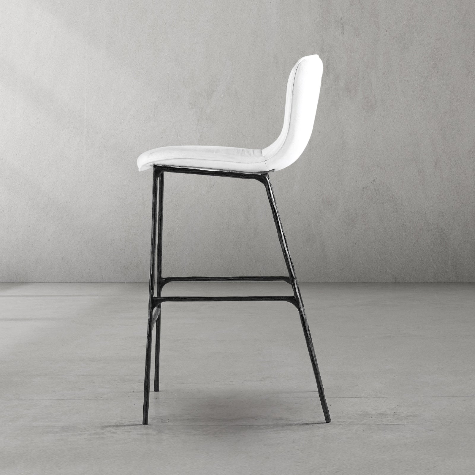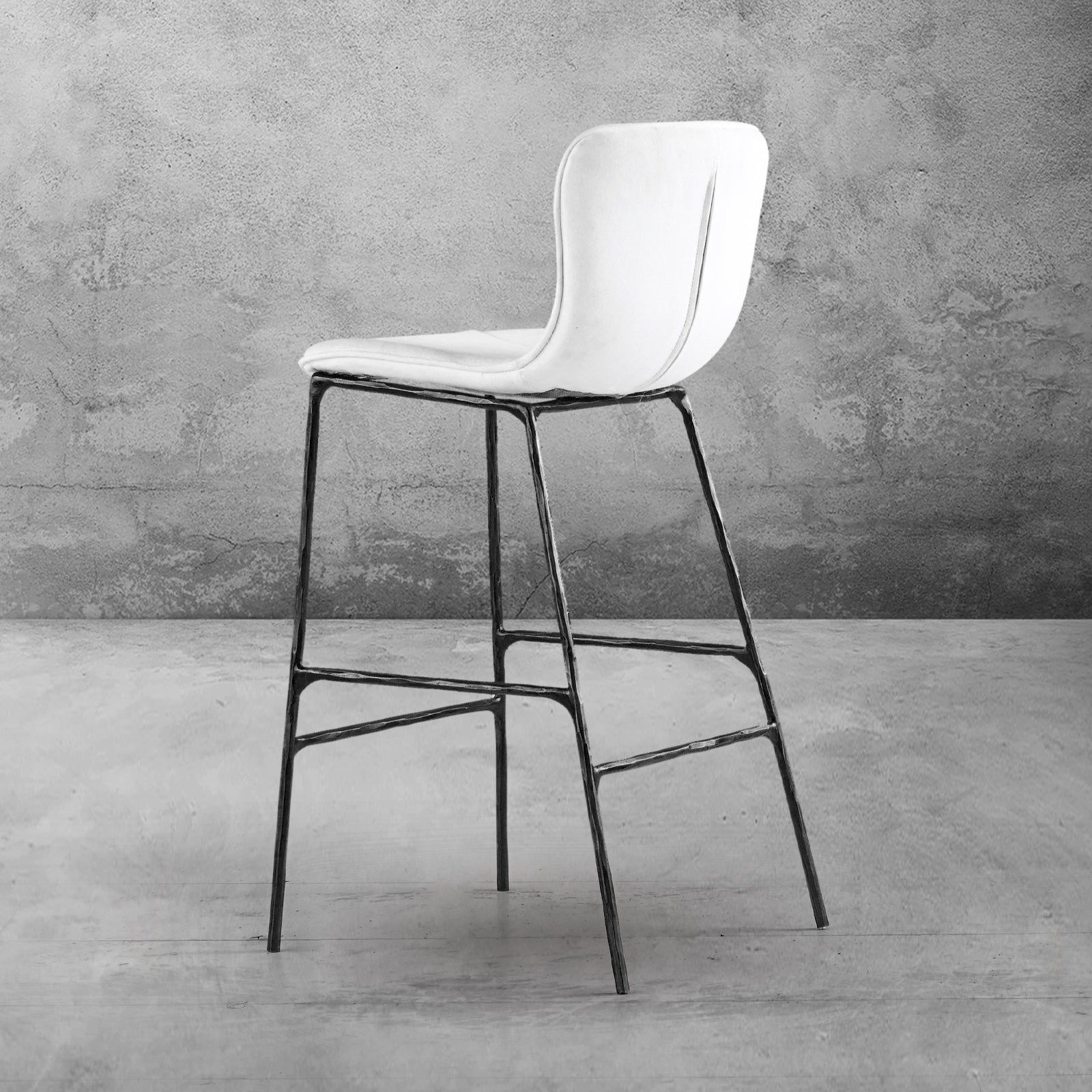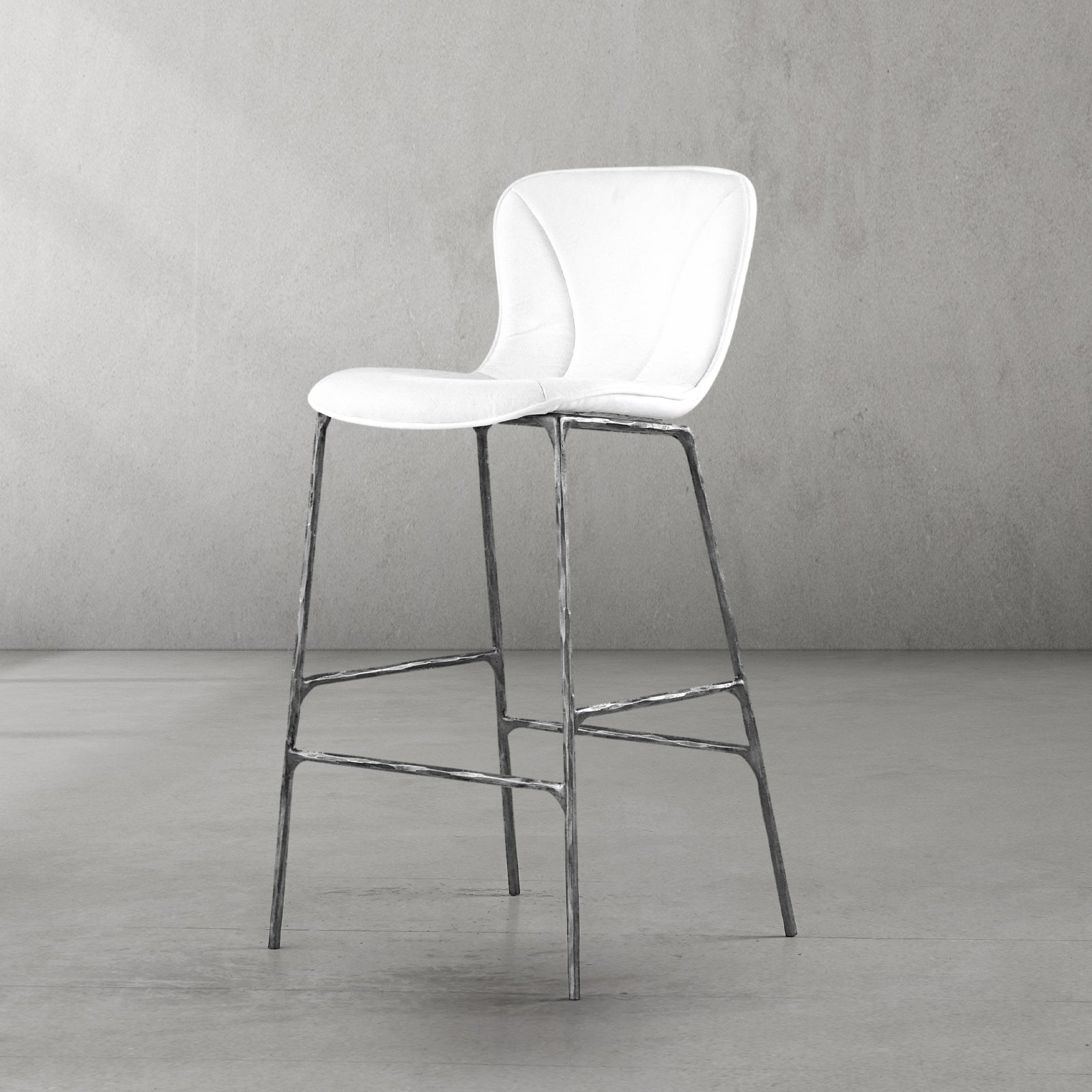 Inspired by the sculptural works of Salvador Dalí and Diego Giacometti, our stool from Alexander merges the rustic sensibility of a hand-forged metal base with tailored upholstery. Employing an ancient fabrication process, artisans hand hammer the metal bars to reveal an alive, imperfect and organic texture, a counterpoint to the frame's slender, tapered silhouette.