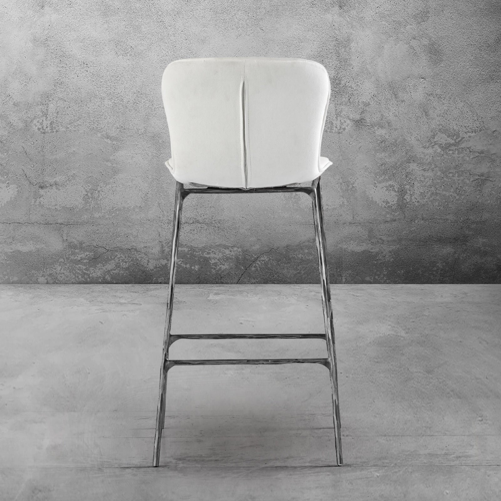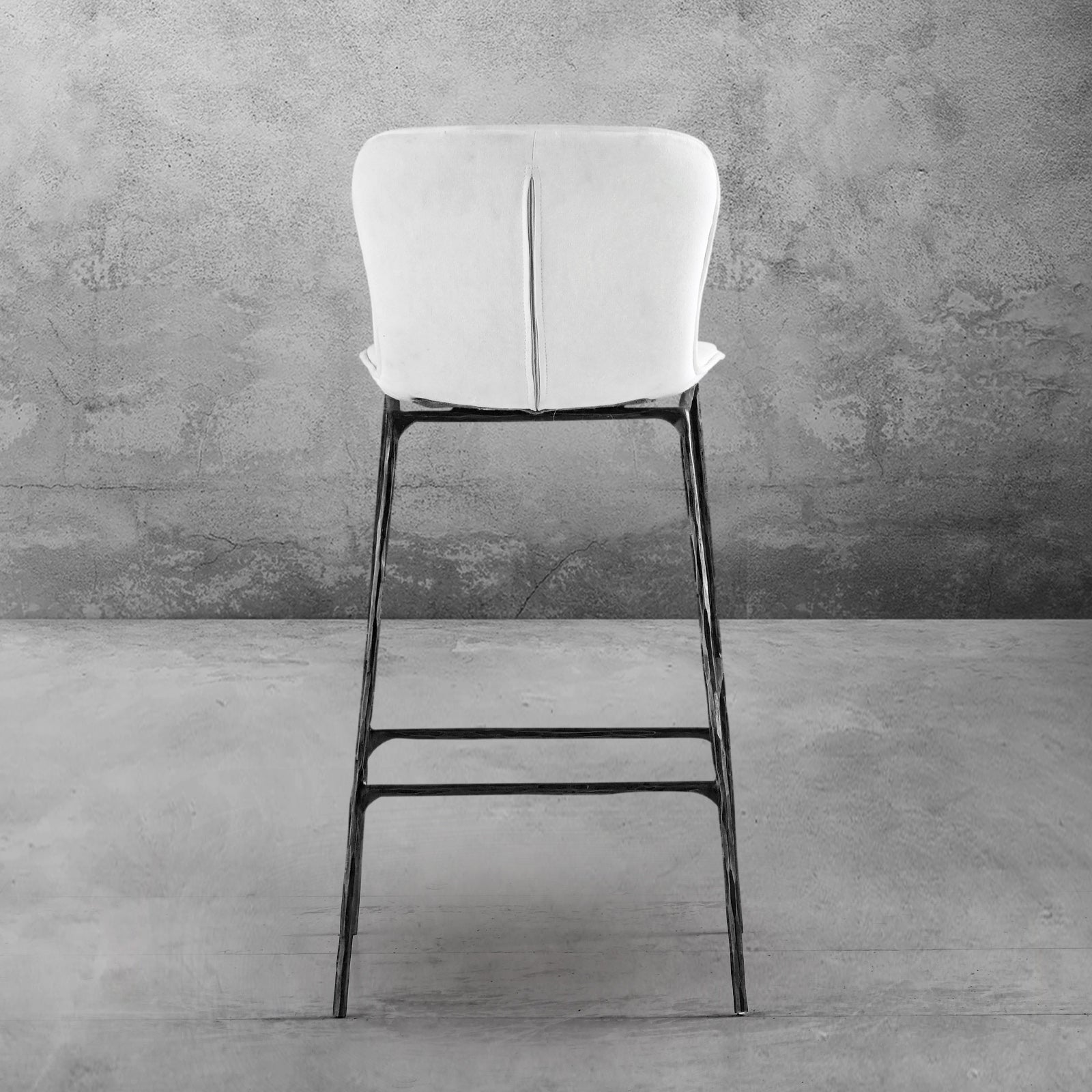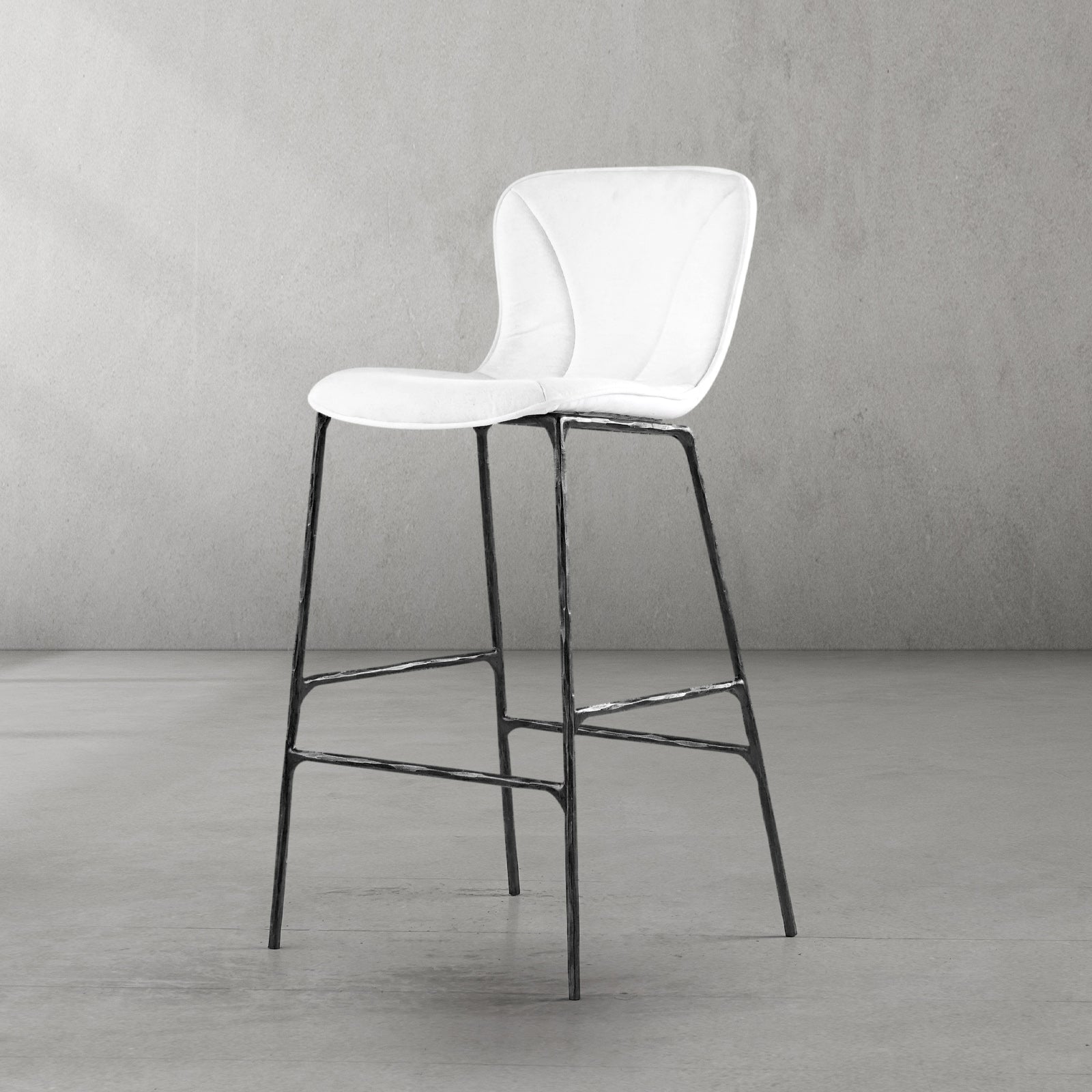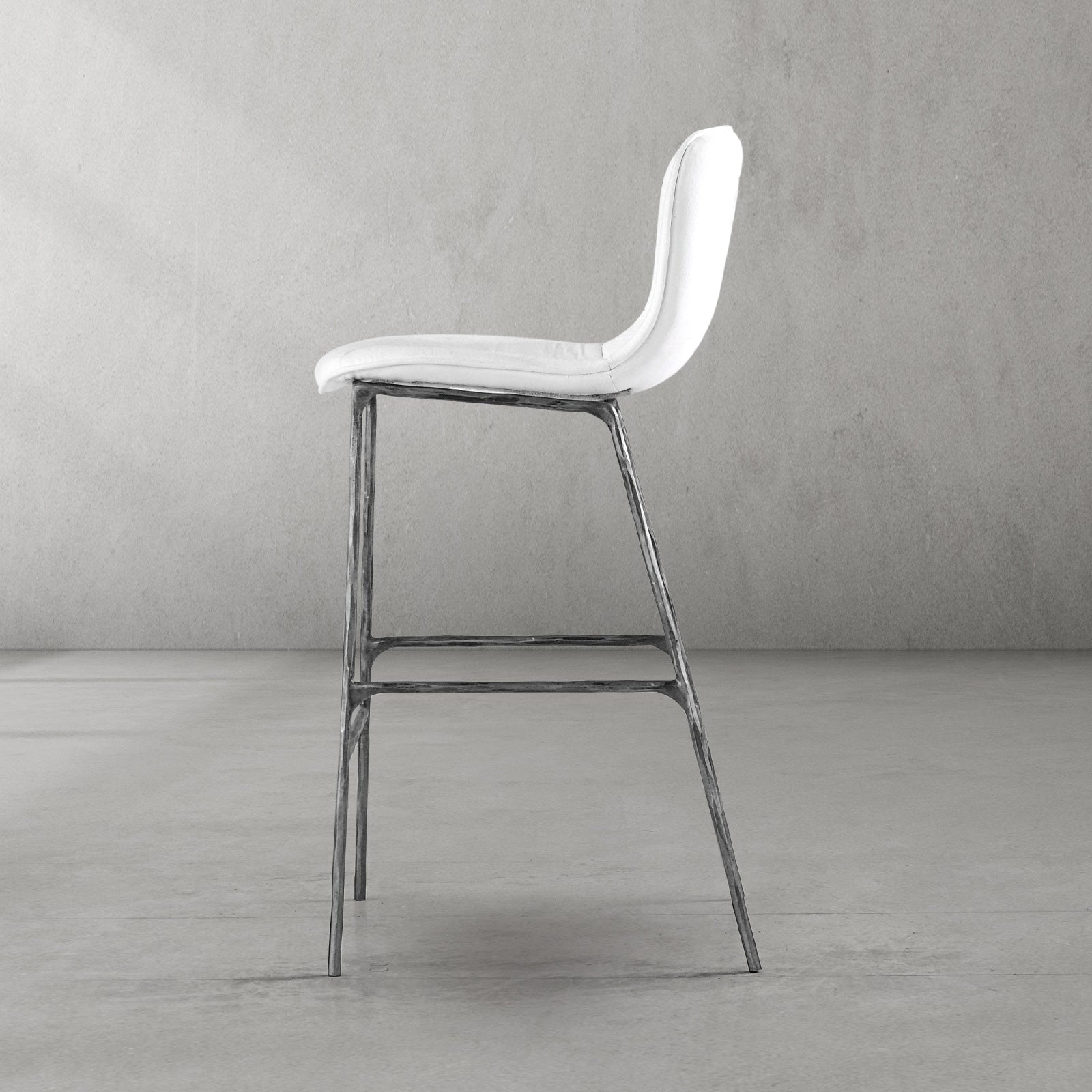 Inspired by the sculptural works of Salvador Dalí and Diego Giacometti, our stool from Alexander merges the rustic sensibility of a hand-forged metal base with tailored upholstery. Employing an ancient fabrication process, artisans hand hammer the metal bars to reveal an alive, imperfect and organic texture, a counterpoint to the frame's slender, tapered silhouette.