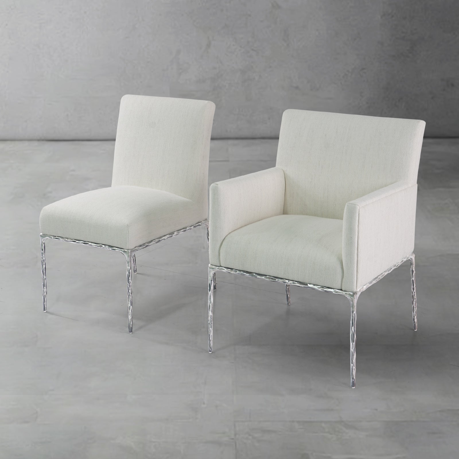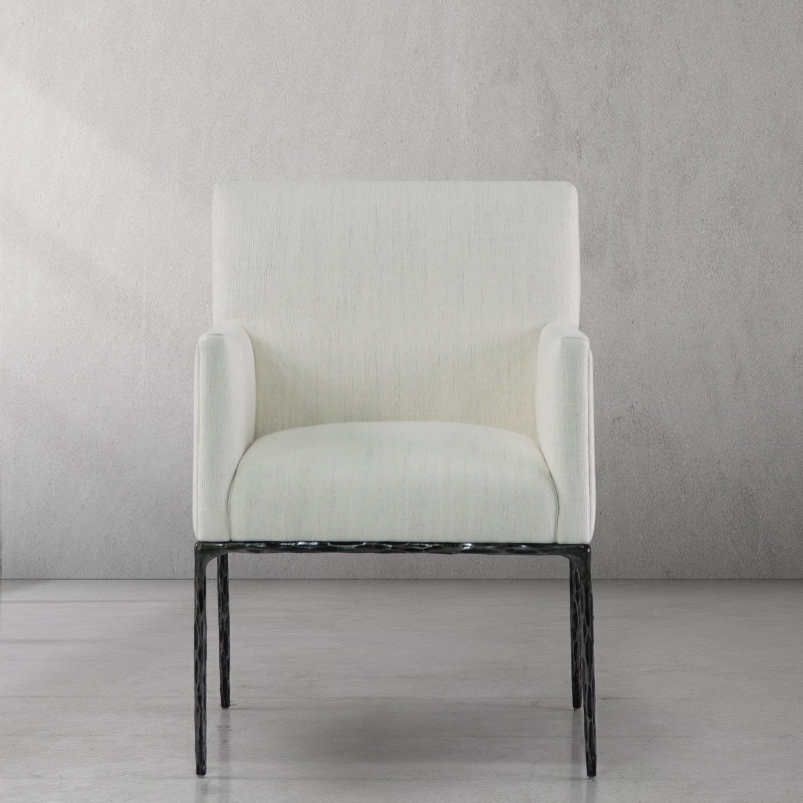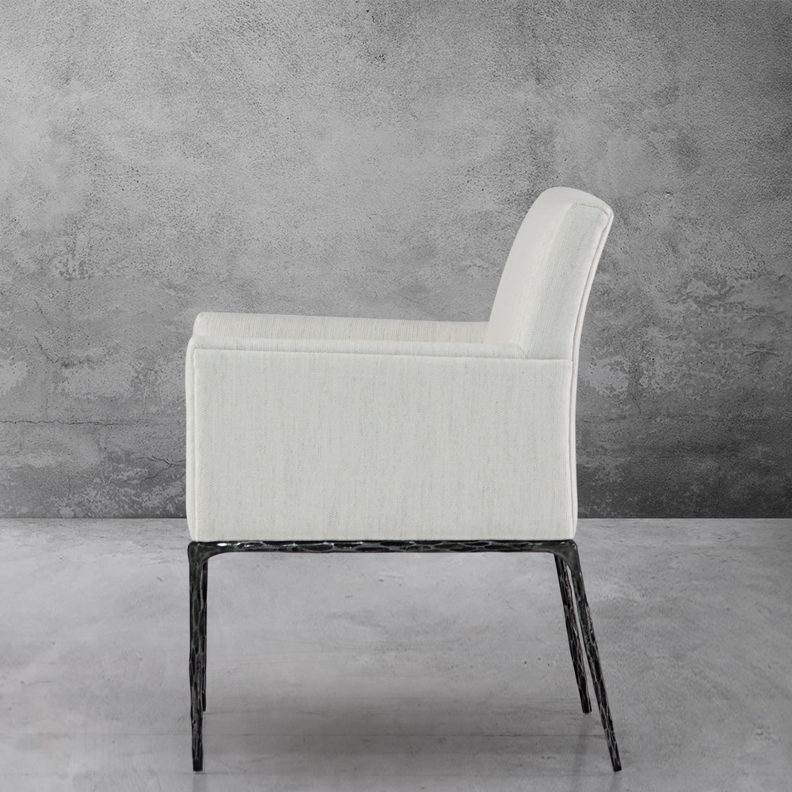 Our chair from the rustic sensibility of a hand-forged metal base with tailored upholstery. Employing an ancient fabrication process, artisans hand hammer the metal bars to reveal an alive, imperfect and organic texture, a counterpoint to the frame's slender, tapered silhouette.