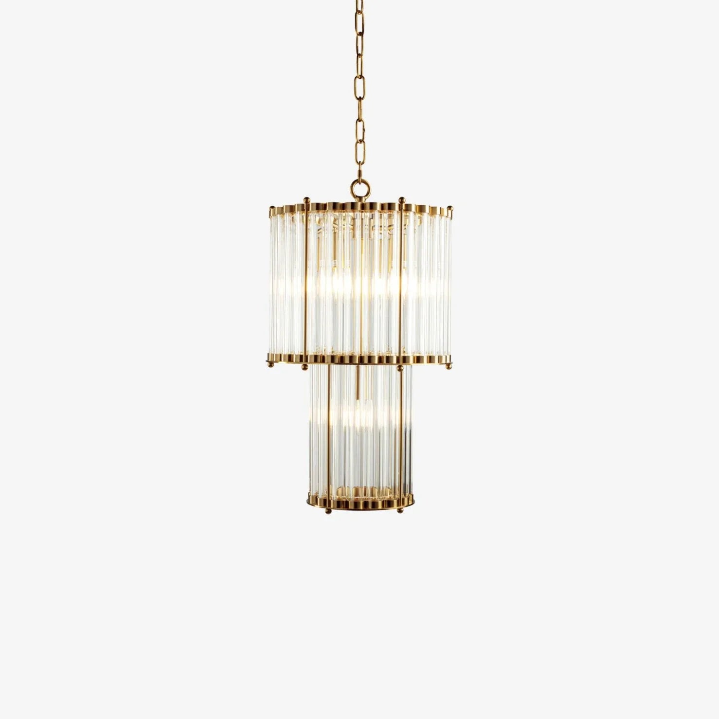 The stunning double Monza chandelier features an upper and lower tier of clear glass tubes in a drum formation. Each glass tube is individually placed to disperse a soft warmth and ambience to any room.