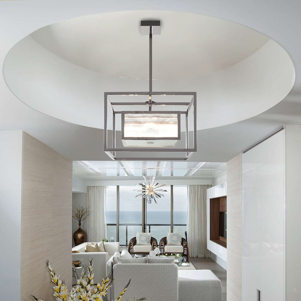 Stainless steel and clear ribbed glass freshen up your interior. The cube frame format adds a touch of contemporary design. This fixture is flexible fitting into different interiors and into different decoration themes. For instance, one of our clients positioned the fixture in the hall as an entryway light, welcoming guests while creating a modern and casual atmosphere.
