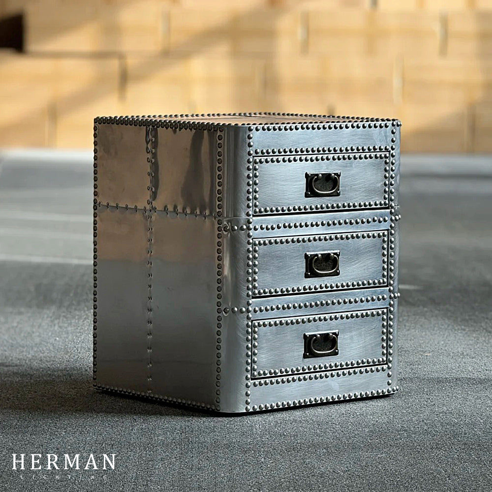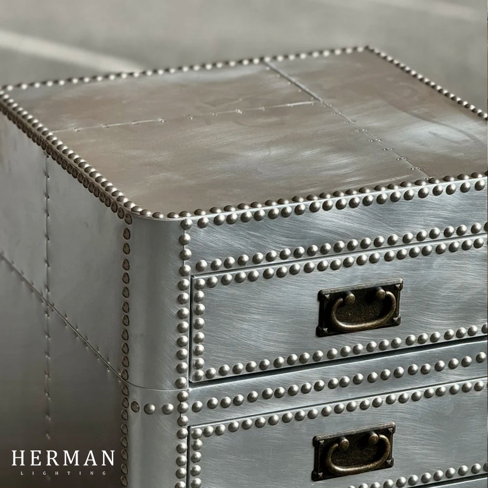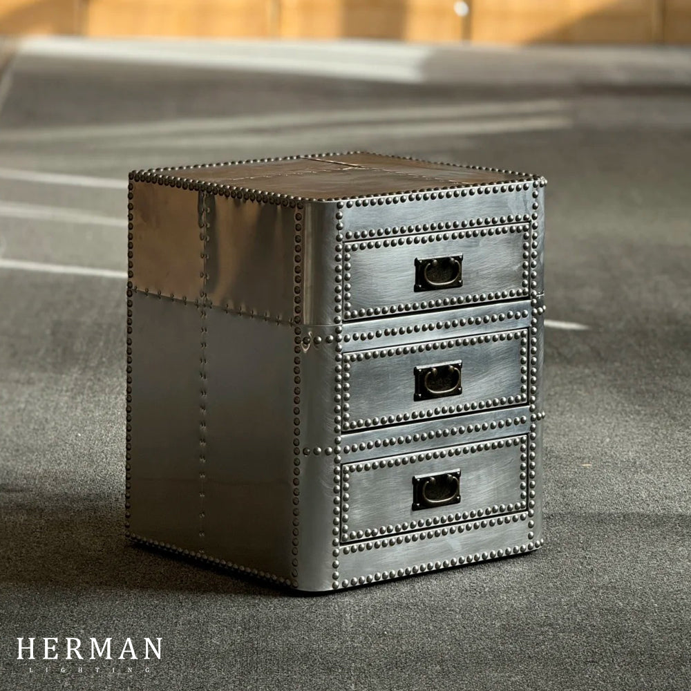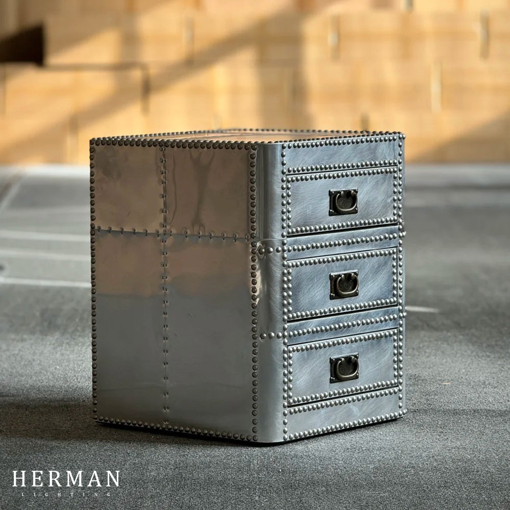 The Vintage Loft Night Table showcases a stylish blend of vintage aesthetics and modern functionality. Crafted with a full aluminum sheet covering, this night table features metal aluminum-colored rivets, adding a sophisticated industrial touch. The interior is lined with black canvas for added durability, while the metal buffer rails ensure smooth drawer operation. The sturdy frame combines wood and board materials, offering both strength and elegance. With its practical design and unique style, this night table seamlessly complements both modern and retro-inspired bedroom settings.
