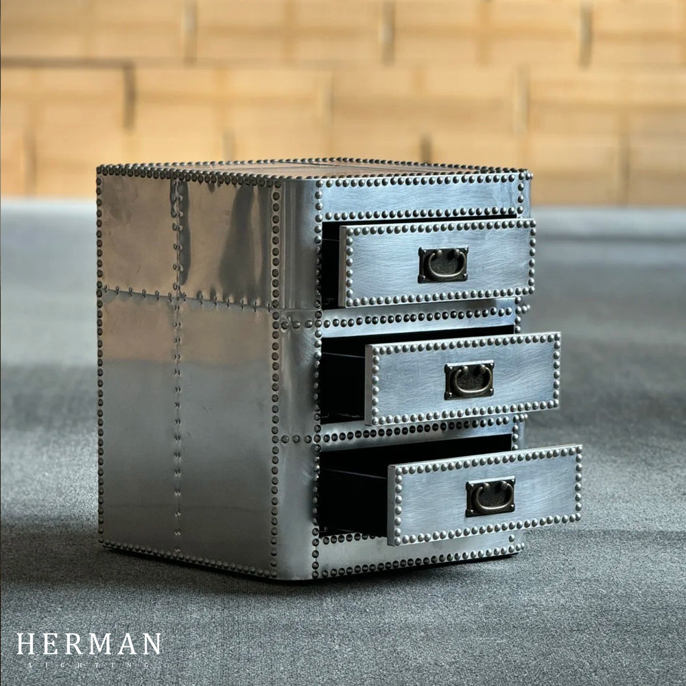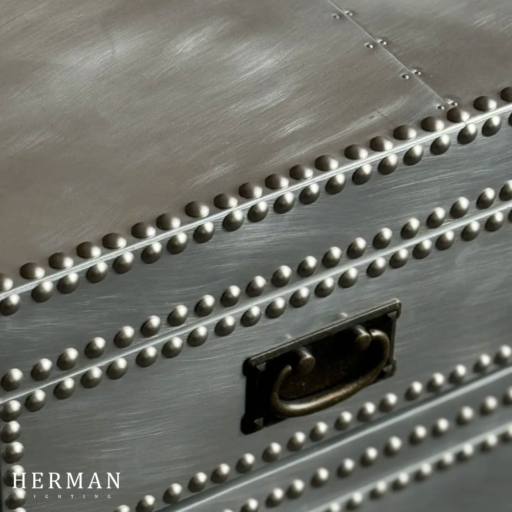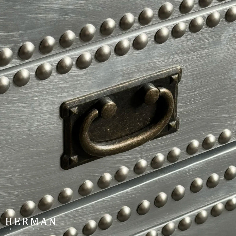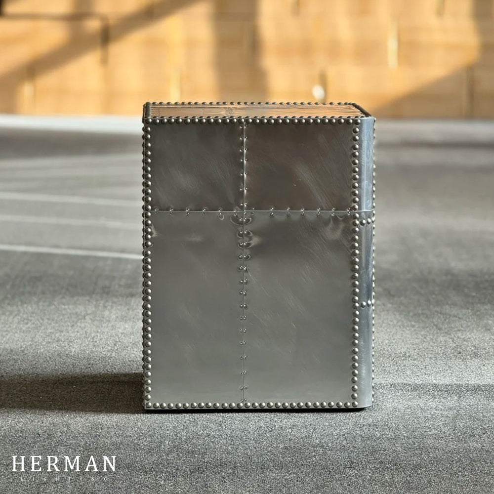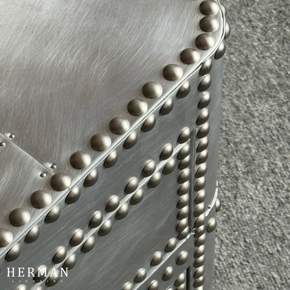 The Vintage Loft Night Table showcases a stylish blend of vintage aesthetics and modern functionality. Crafted with a full aluminum sheet covering, this night table features metal aluminum-colored rivets, adding a sophisticated industrial touch. The interior is lined with black canvas for added durability, while the metal buffer rails ensure smooth drawer operation. The sturdy frame combines wood and board materials, offering both strength and elegance. With its practical design and unique style, this night table seamlessly complements both modern and retro-inspired bedroom settings.